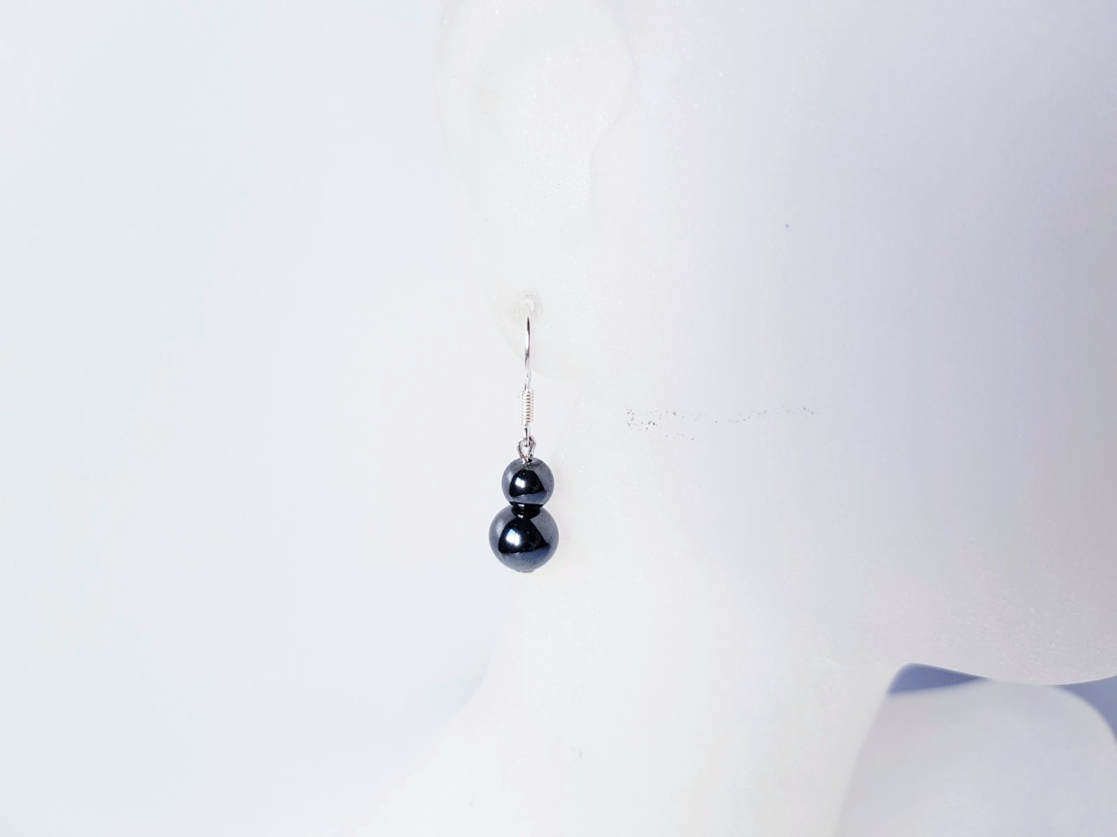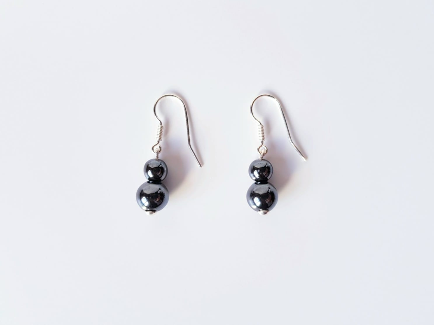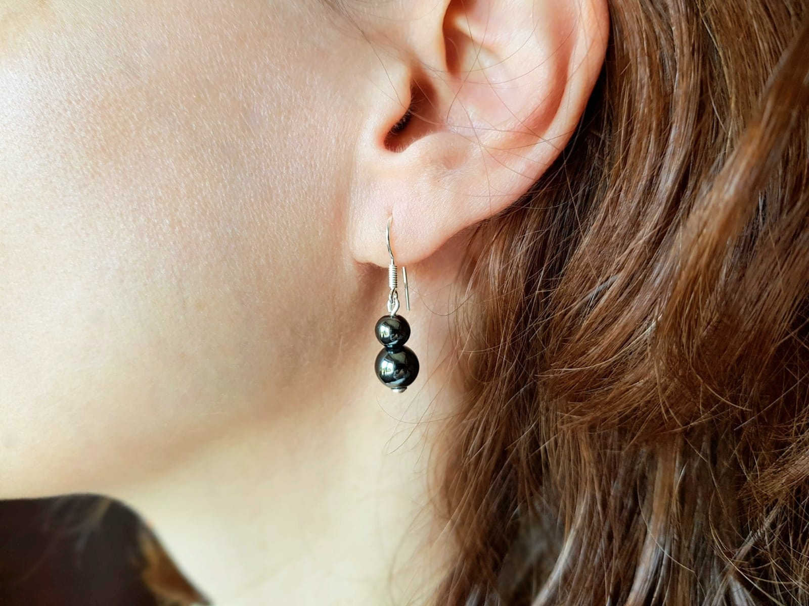Cercei de 3,3 cm lungime, cu sfere de hematit de 6 si 8 mm finisati cu accesorii din argint 925.