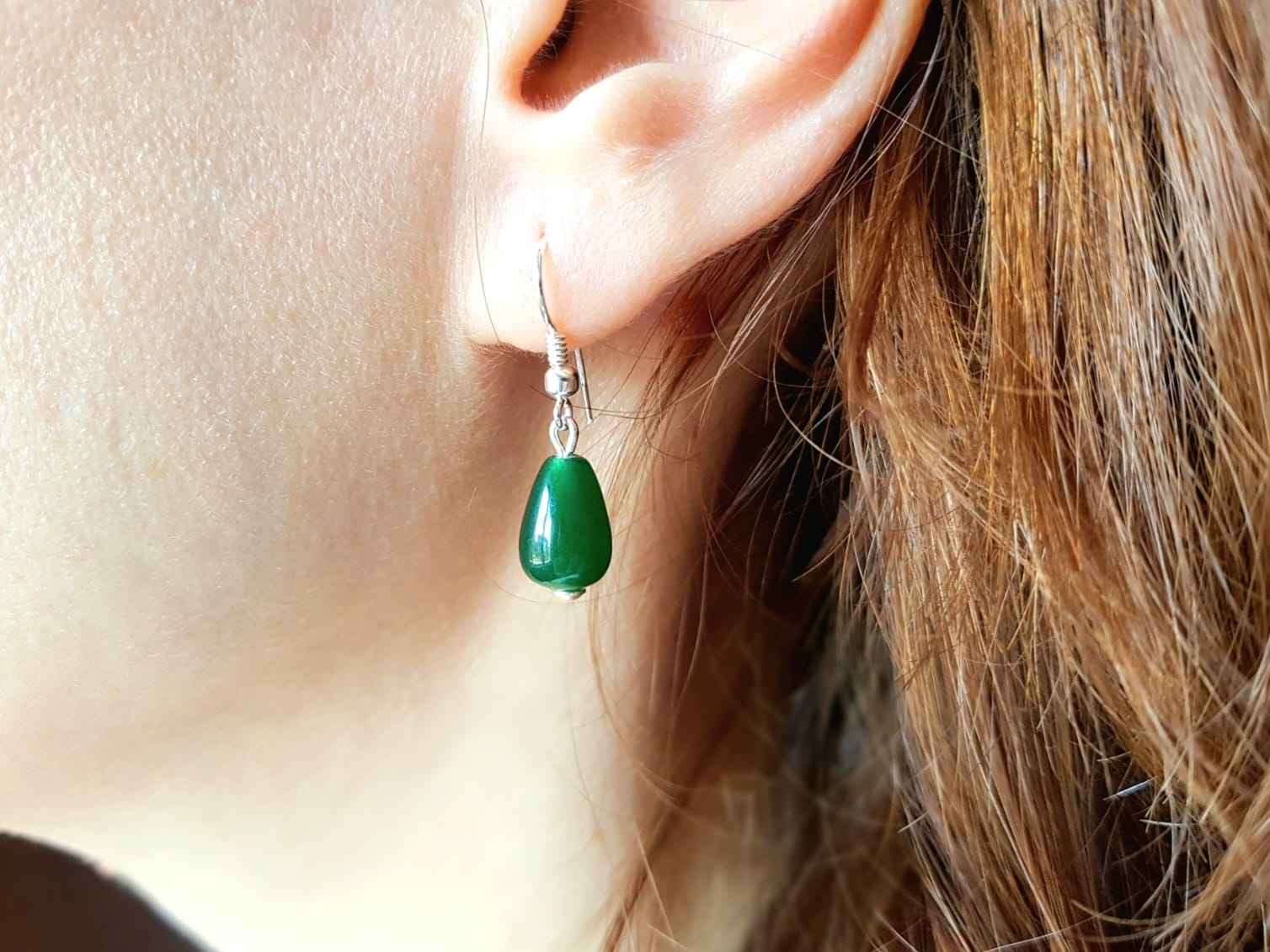 Cercei de 3,2 cm lungime, cu picaturi de jad verde de 8x12 mm si accesorii din argint 925