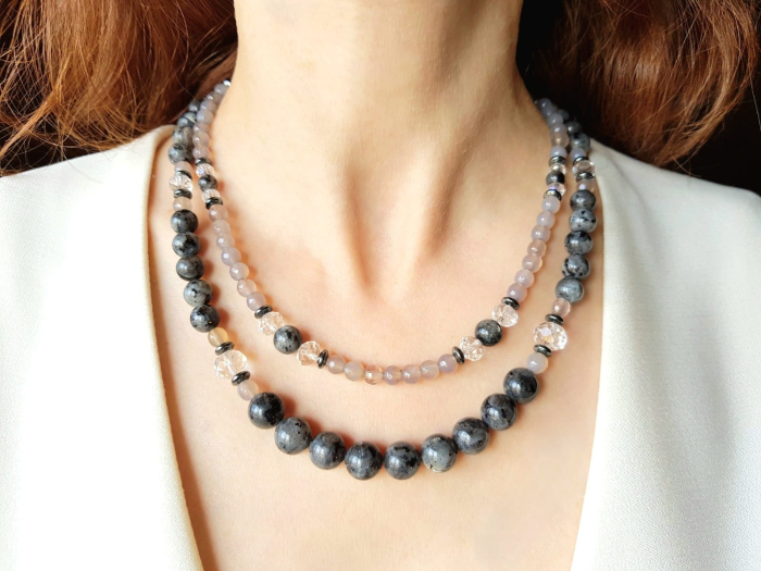 Colierele din pietre semipretioase sunt din ce in ce mai prezente in viata de zi cu zi a femeii moderne. Ele pot fi purtate atat in timpul zilei cat si la evenimente de seara. Colierele create de noi sunt potrivite pentru tinute business, casual sau evenimente speciale. Preocuparea noastra este de a crea in permanenta modele noi, coliere unicat, pentru a intampina gusturile variate ale clientilor noastri, dar oferim si coliere clasice.