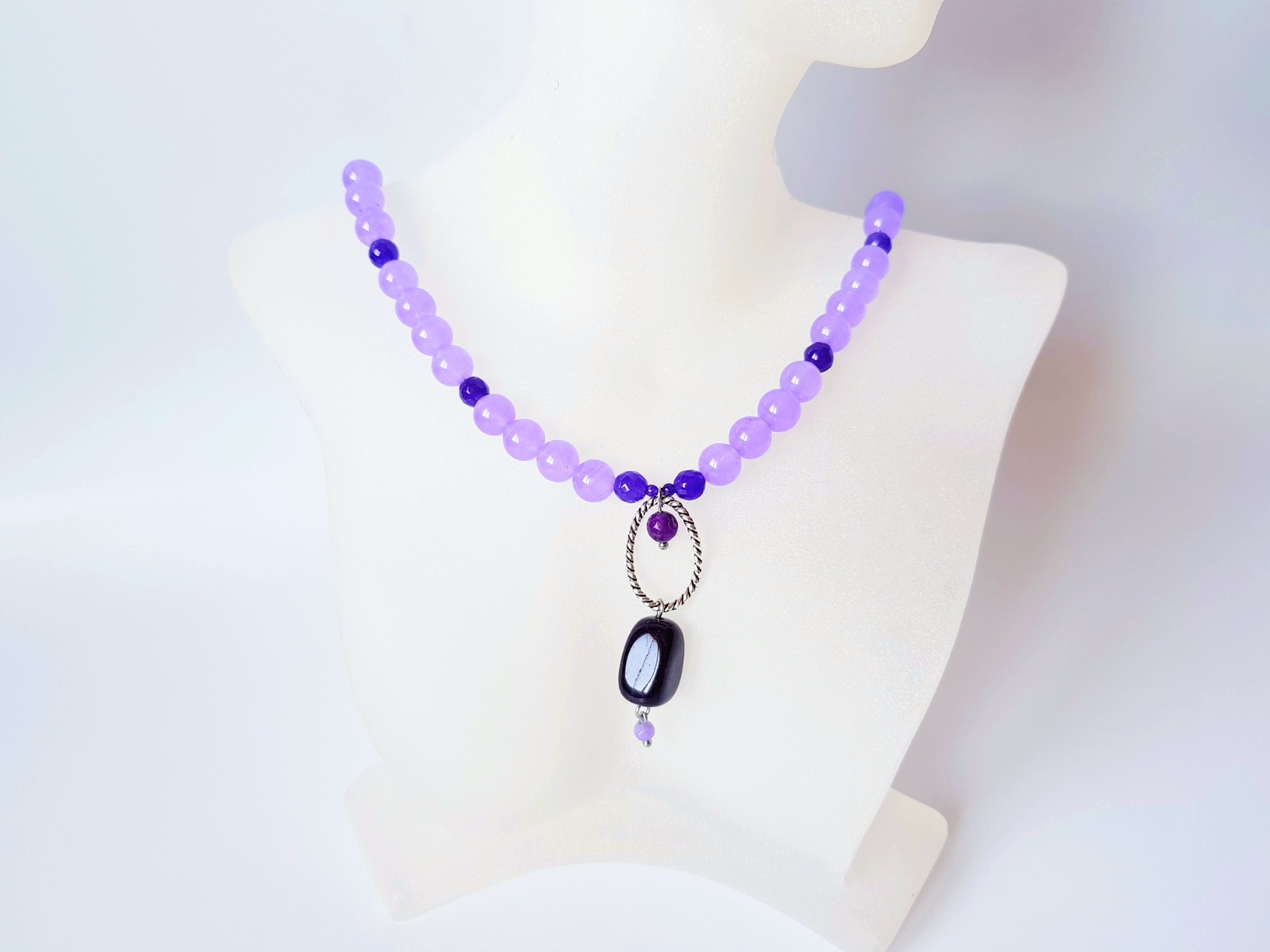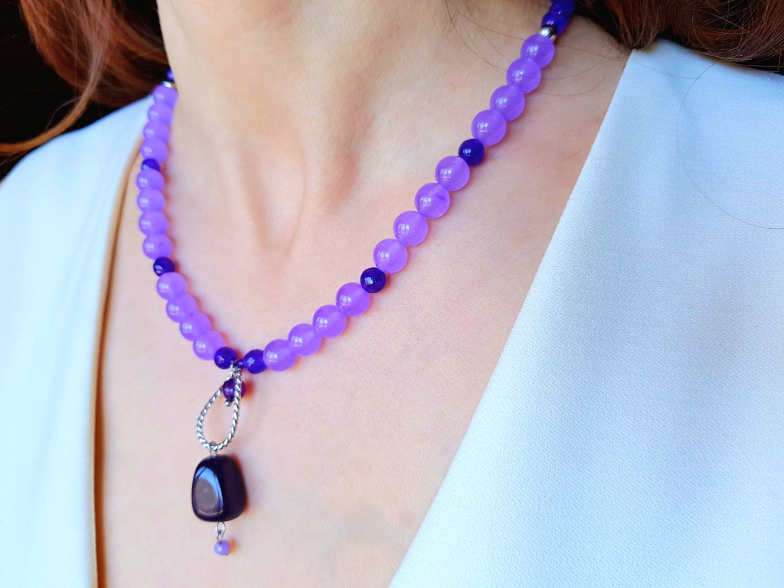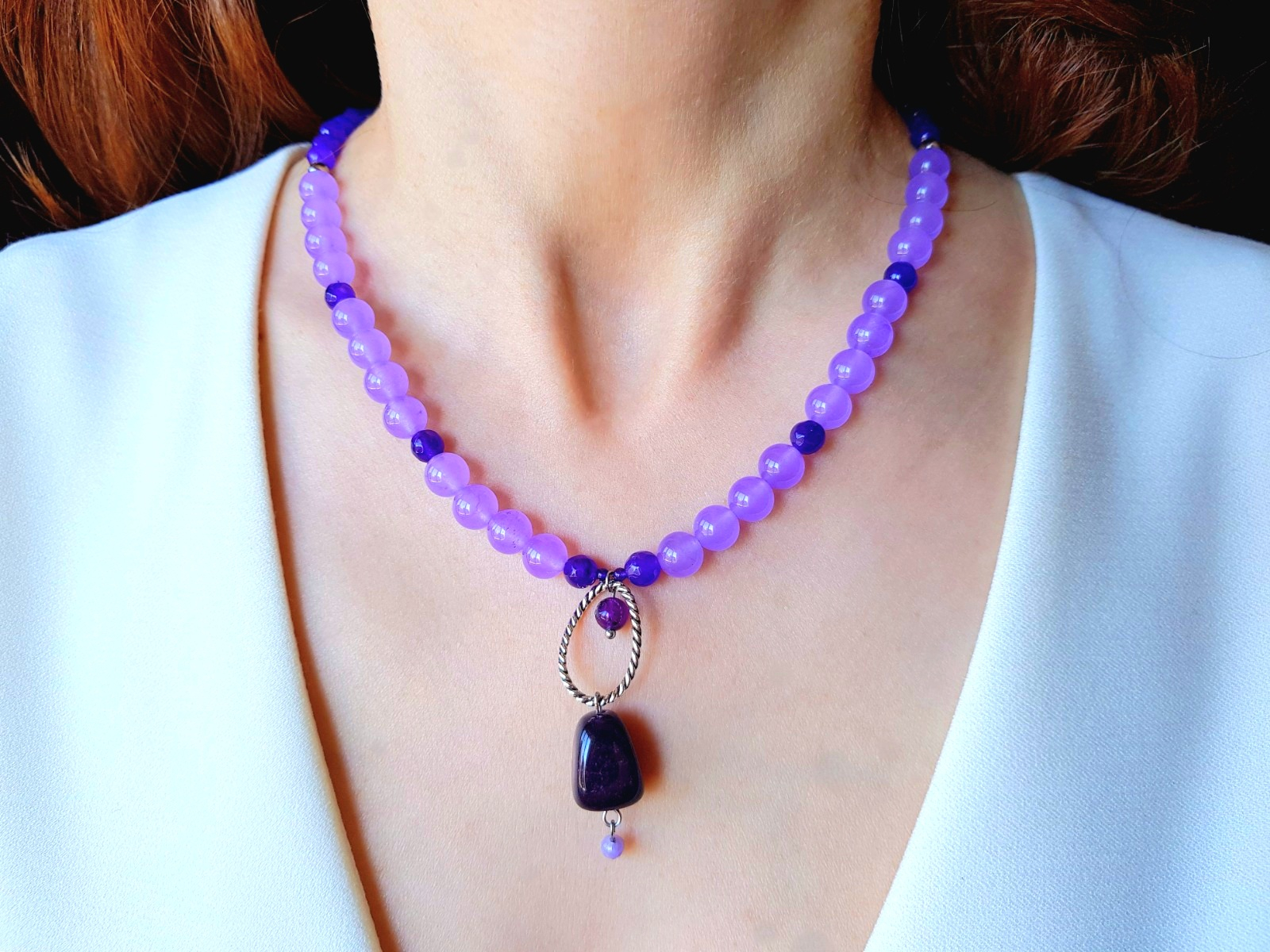 Colier elegant, realizat manual, cu lungime de 47,5 cm, din pietre naturale: jad lila (sfere de 8,5 mm) si jad mov (sfere de 6 mm), completat de un pandantiv din jad mov in forma de piramida (18x13 mm). Accesoriile sunt din otel inoxidabil, rezistente in timp.