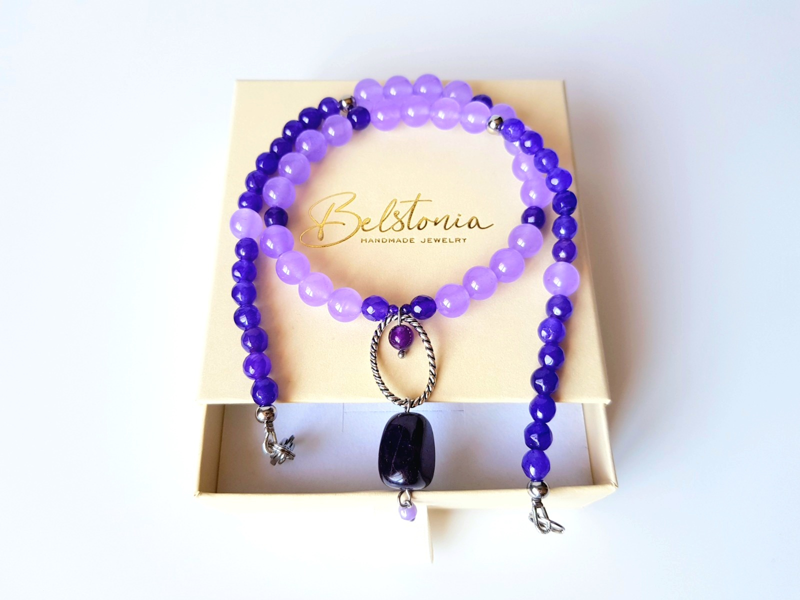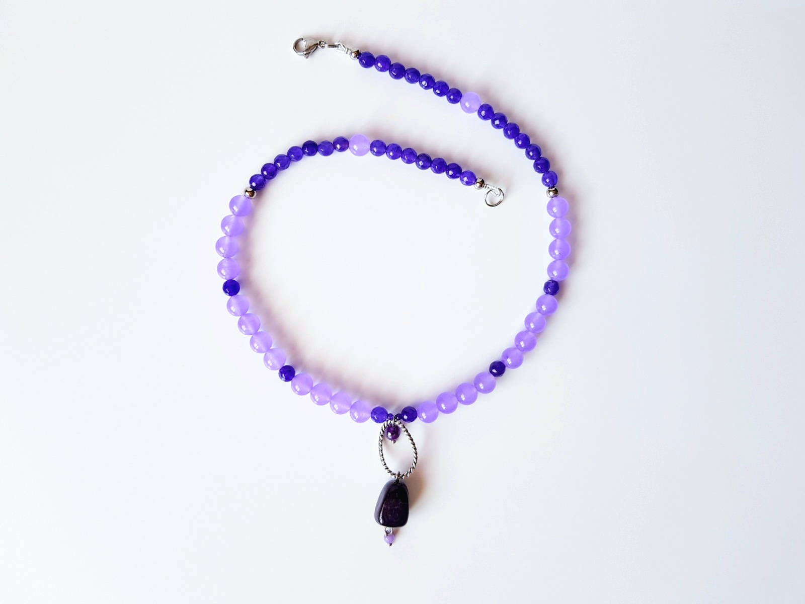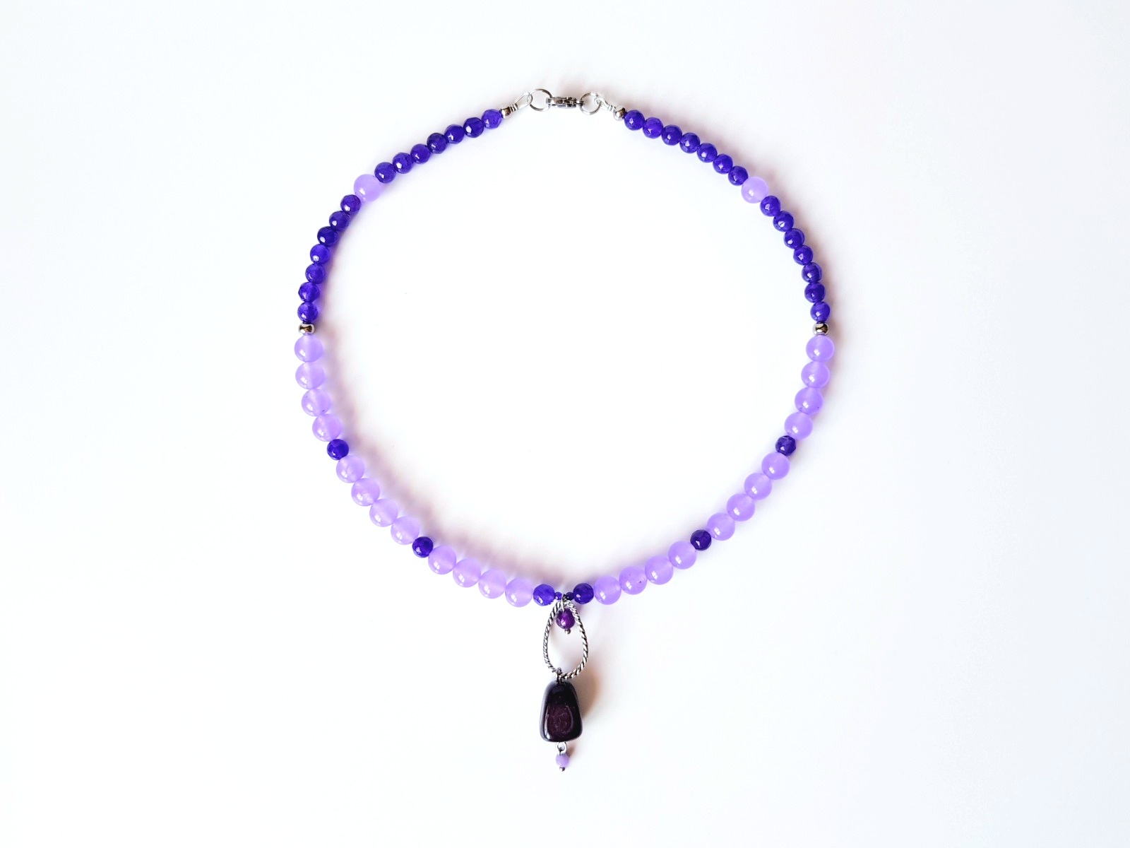 Colier elegant, realizat manual, cu lungime de 47,5 cm, din pietre naturale: jad lila (sfere de 8,5 mm) si jad mov (sfere de 6 mm), completat de un pandantiv din jad mov in forma de piramida (18x13 mm). Accesoriile sunt din otel inoxidabil, rezistente in timp.