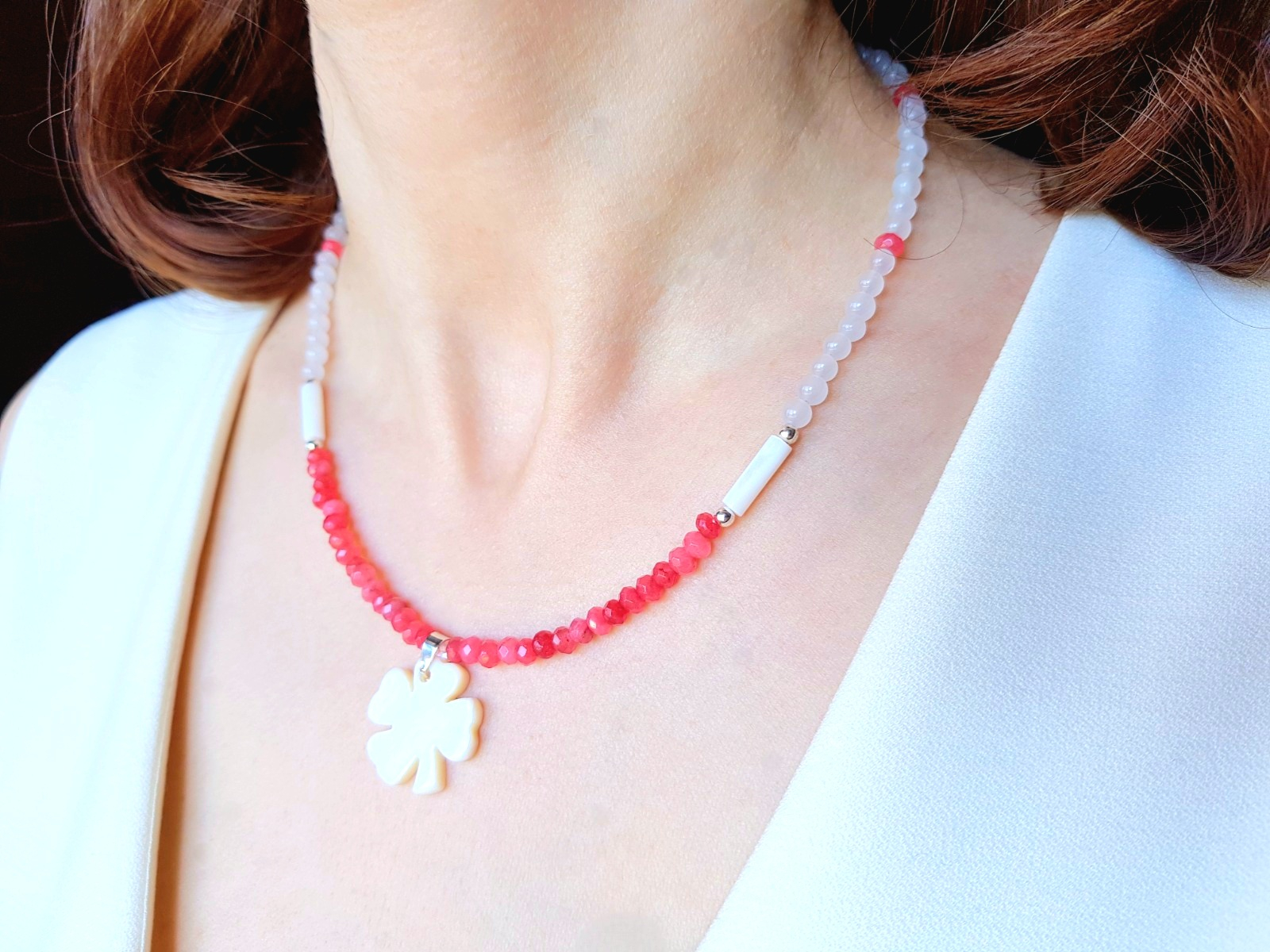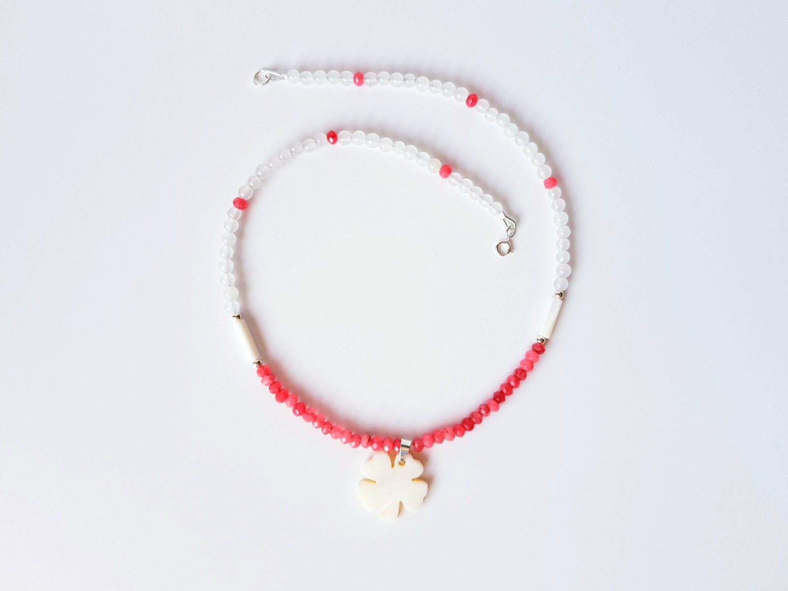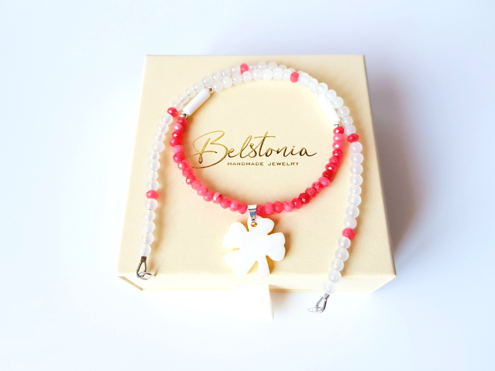 Colier delicat, realizat manual, cu lungime de 42,5 cm, din pietre naturale: jad roz inchis (rondele fatetate de 4 mm) si jad alb (sfere de 4,5 mm), completat de doua tuburi laterale din sidef (13x4 mm) si un pandantiv din sidef crem in forma de trifoi (22x22 mm). Accesoriile sunt din argint 925, pentru un plus de eleganta si rafinament.