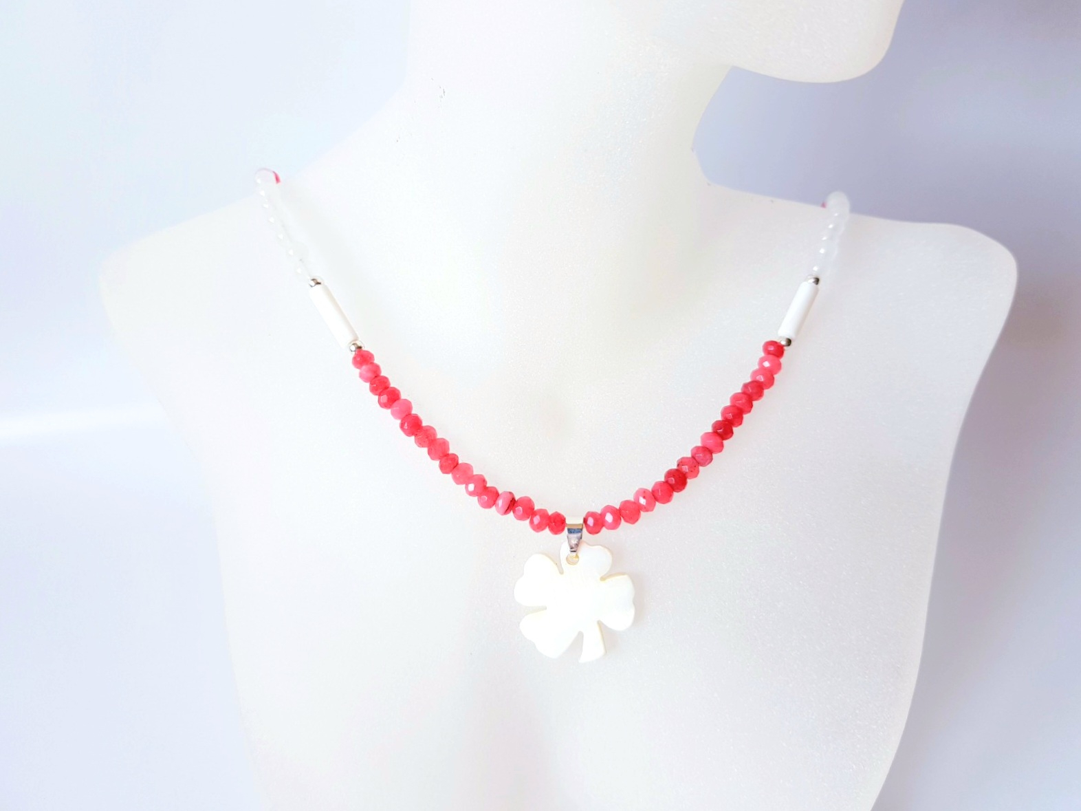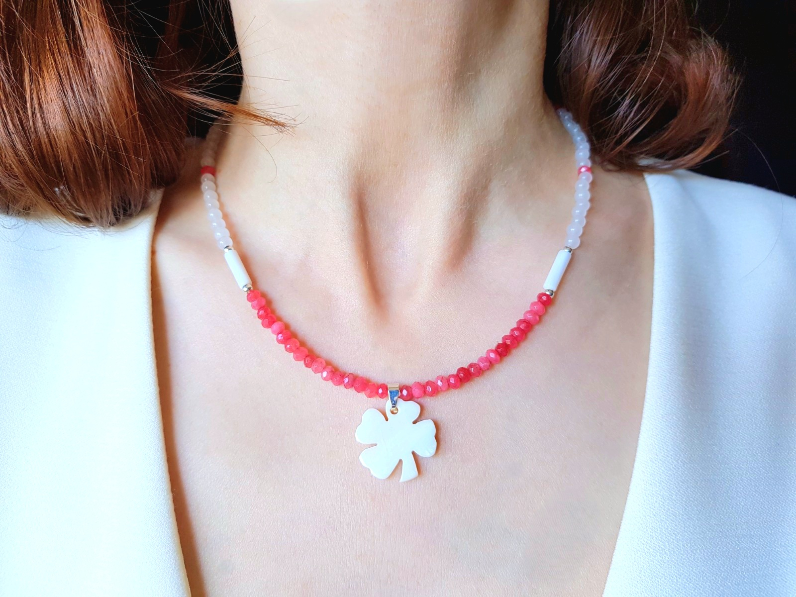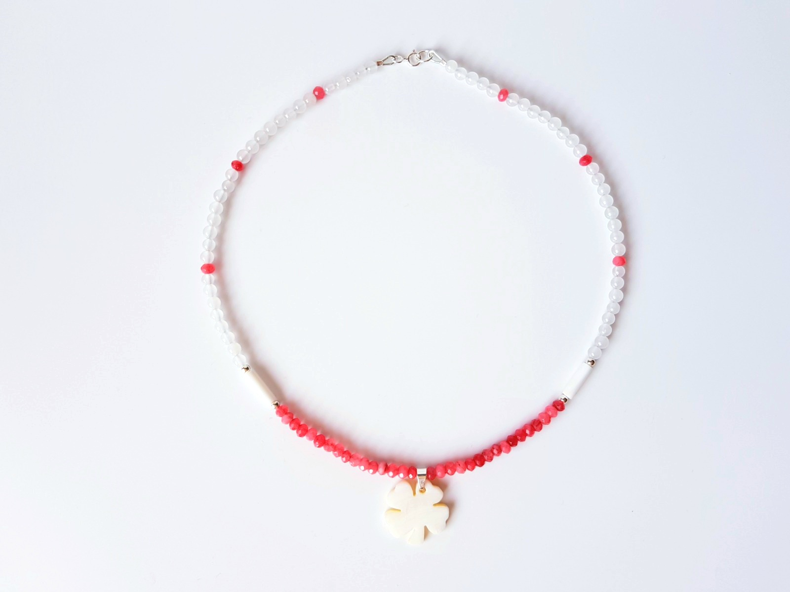 Colier delicat, realizat manual, cu lungime de 42,5 cm, din pietre naturale: jad roz inchis (rondele fatetate de 4 mm) si jad alb (sfere de 4,5 mm), completat de doua tuburi laterale din sidef (13x4 mm) si un pandantiv din sidef crem in forma de trifoi (22x22 mm). Accesoriile sunt din argint 925, pentru un plus de eleganta si rafinament.