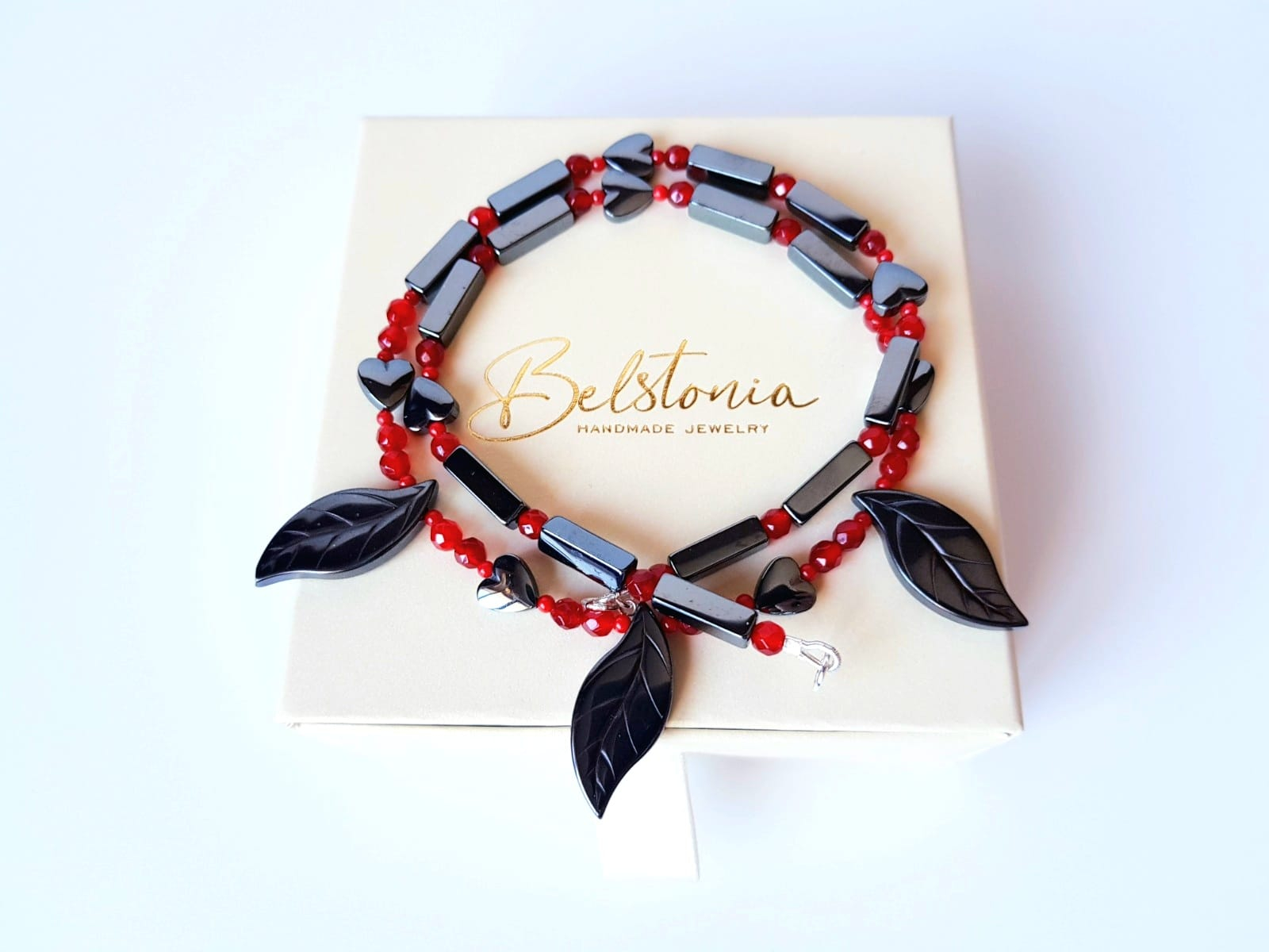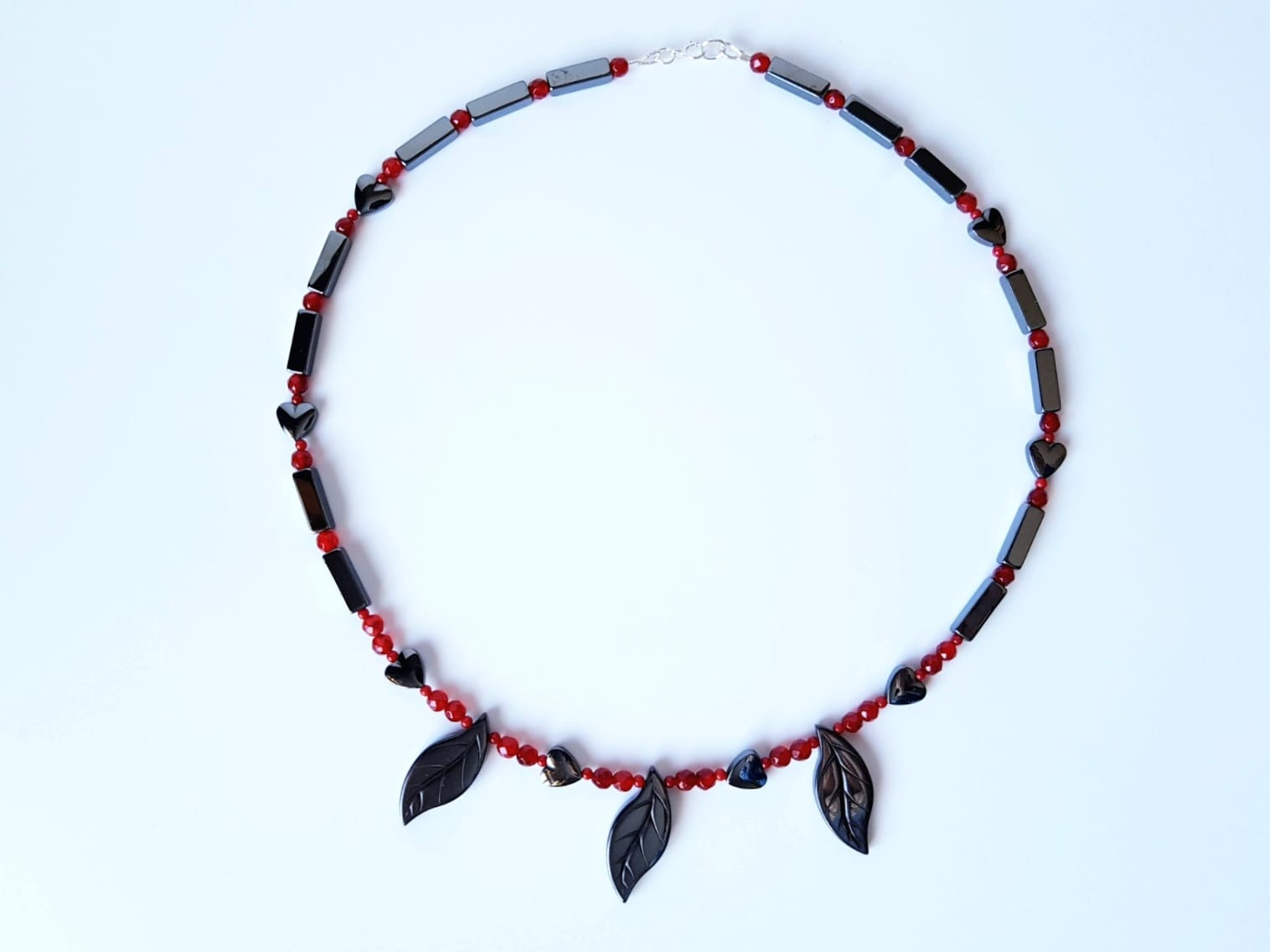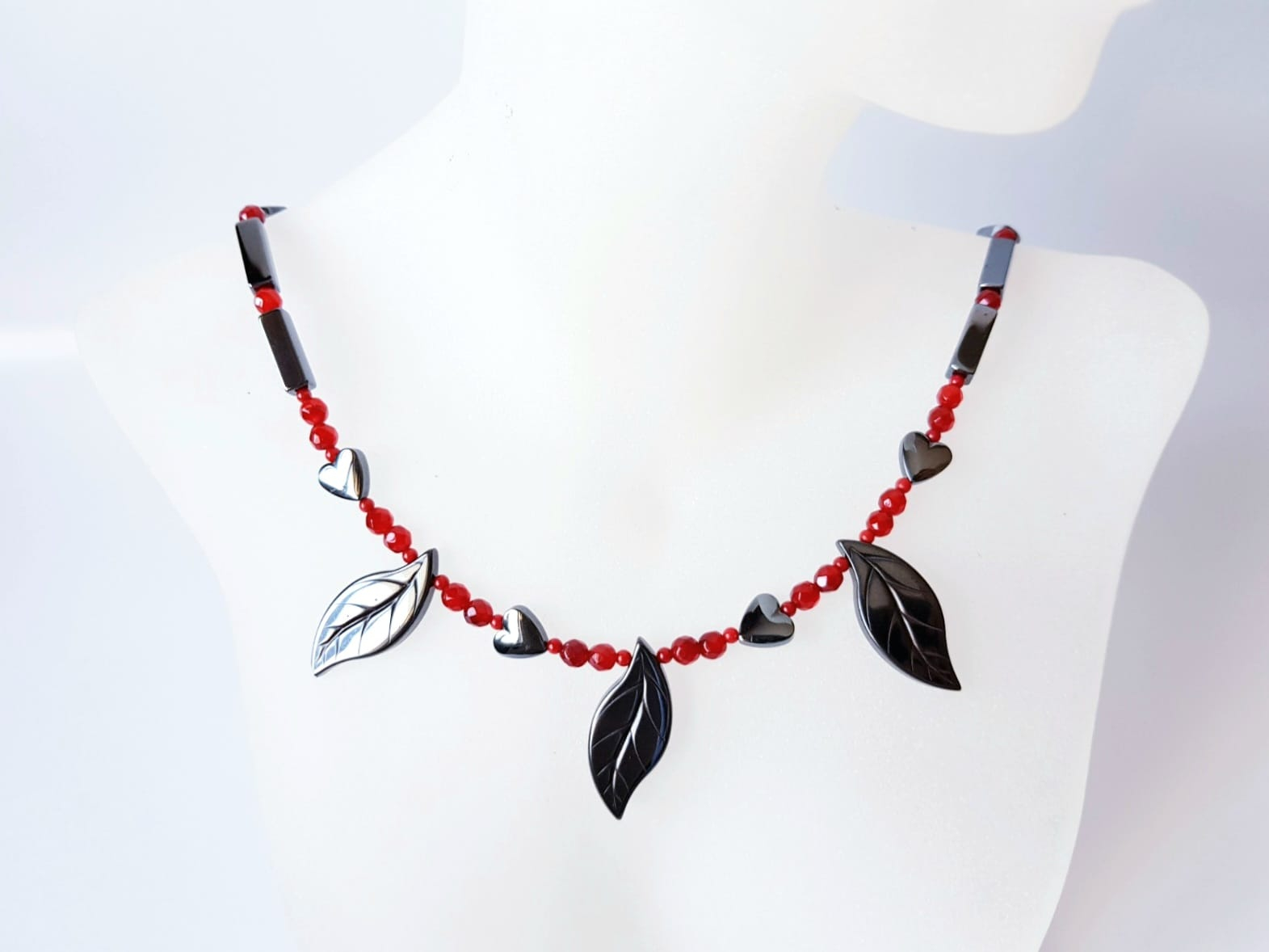 Colier handmade cu lungimea de 46,5 cm, realizat din jad rosu sfere fatetate de 4 mm, coral rosu sfere delicate de 2,5 mm si hematit sub forma de tuburi de 4x13 mm si inimi de 8 mm. Designul este completat de trei frunze elegante din hematit, de 2,7 cm fiecare, care adauga un accent natural si sofisticat. Colierul este finisat cu accesorii din argint 925, conferind durabilitate si rafinament.