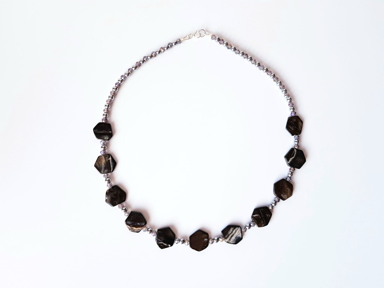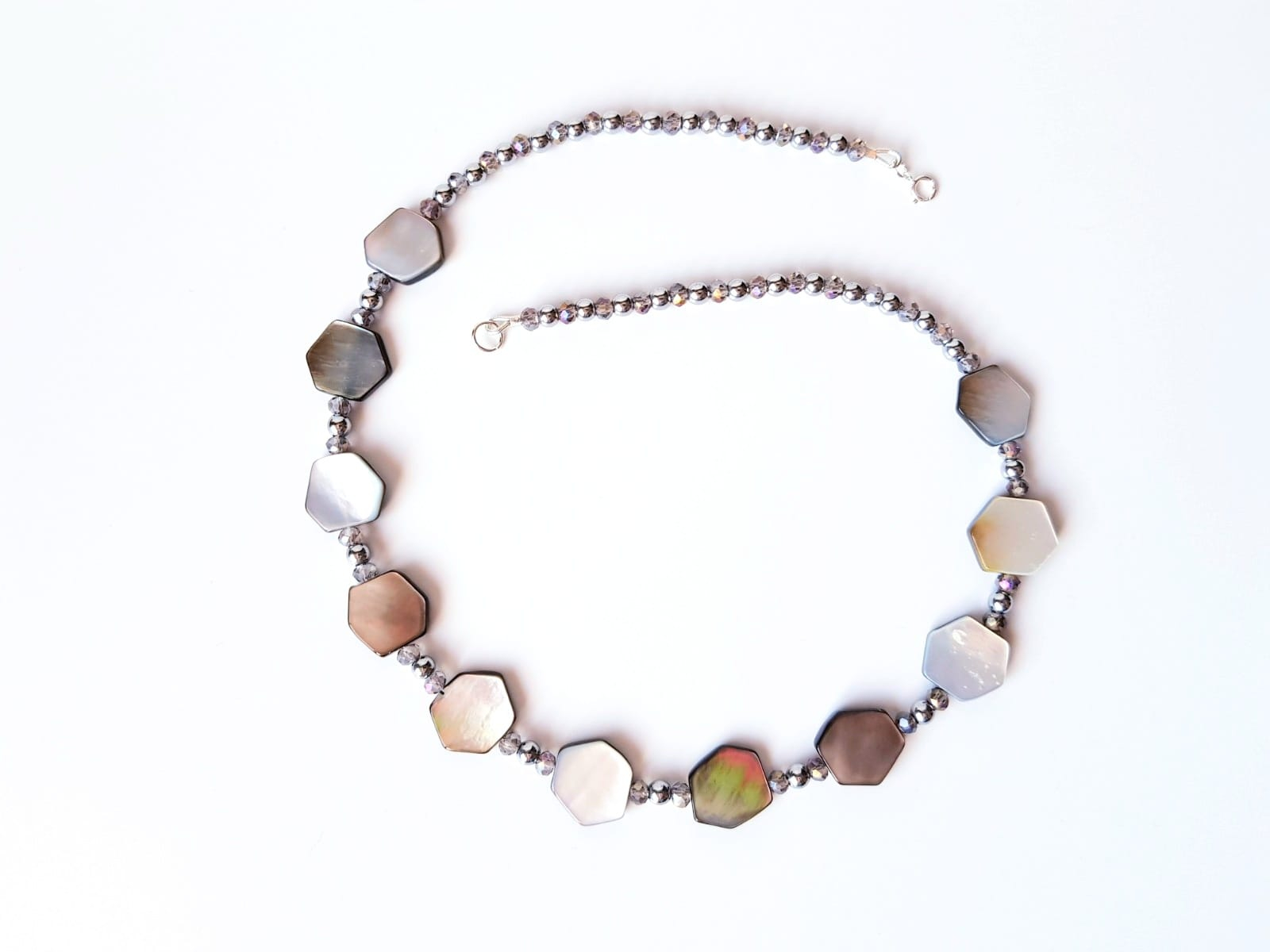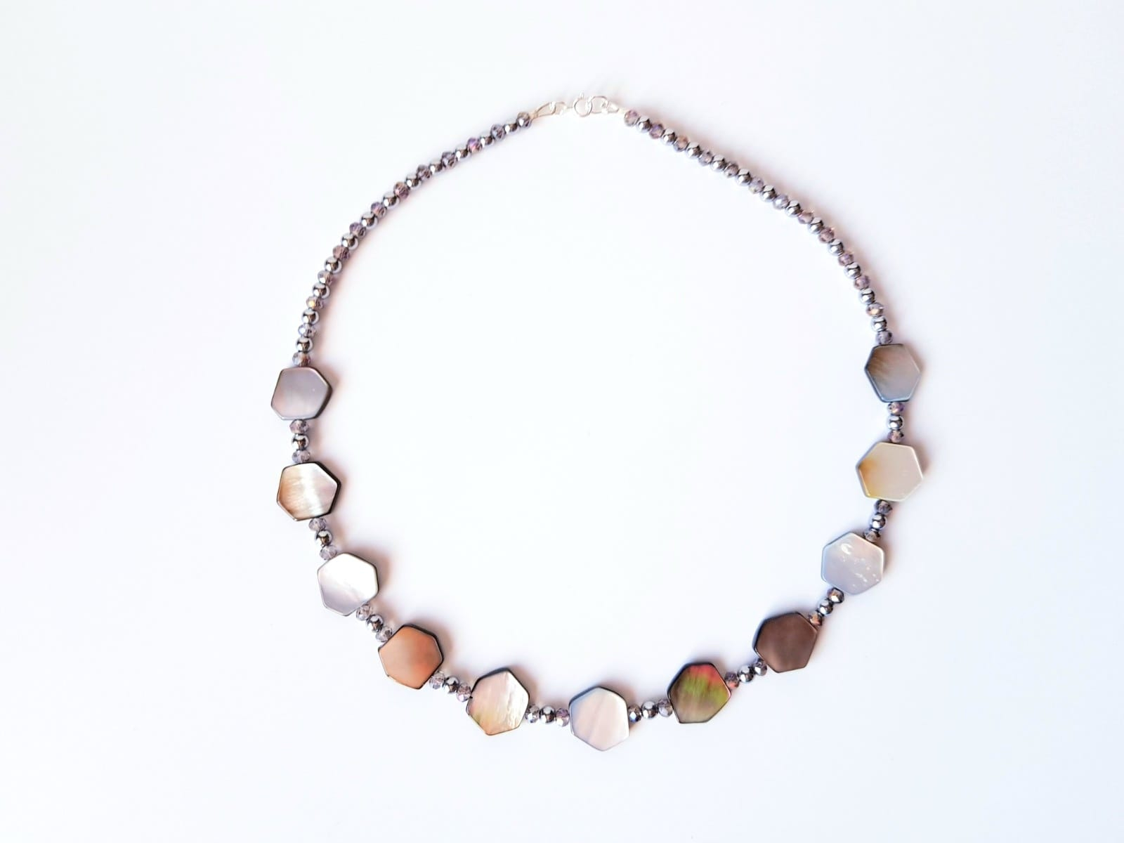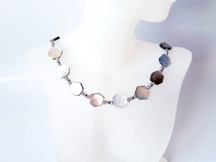 Colier handmade de 45 cm lungime, cu un design elegant si modern, realizat din sidef gri in forma de hexagon neregulat de 15 mm, care ofera un joc subtil de reflexii si un aspect sofisticat. Compozitia este completata de sfere din hematit argintiu de 4 mm si cristale fatetate sub forma de sfere de 5 mm, ce adauga luminozitate si finete. Colierul este finisat cu accesorii din argint 925, pentru un plus de rafinament si rezistenta in timp.