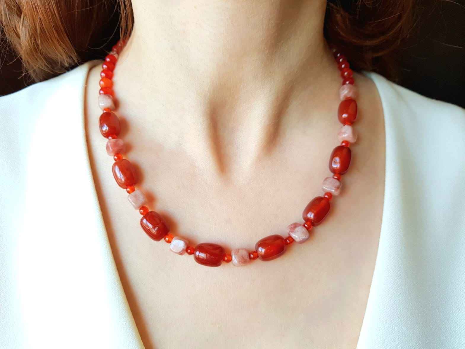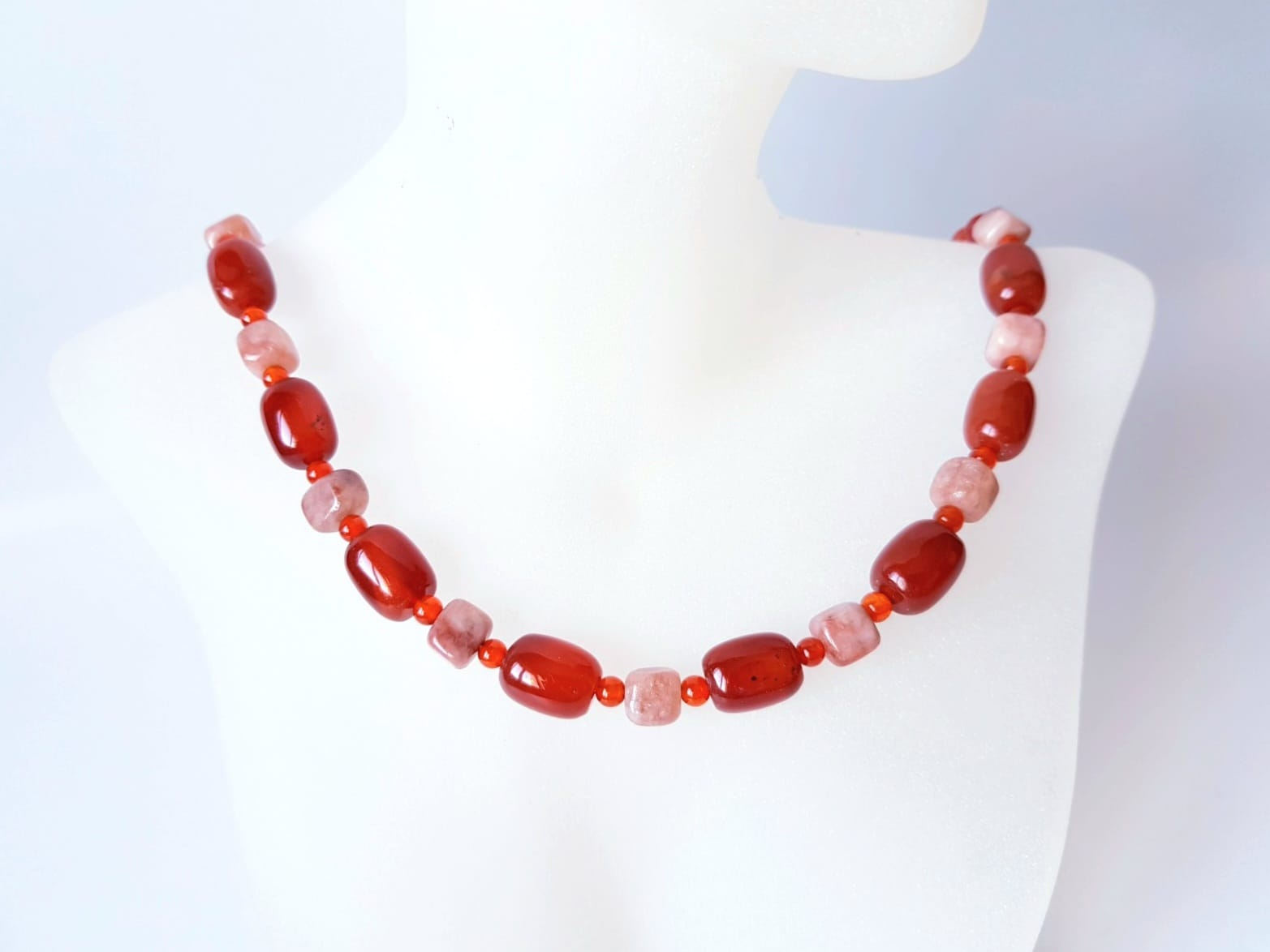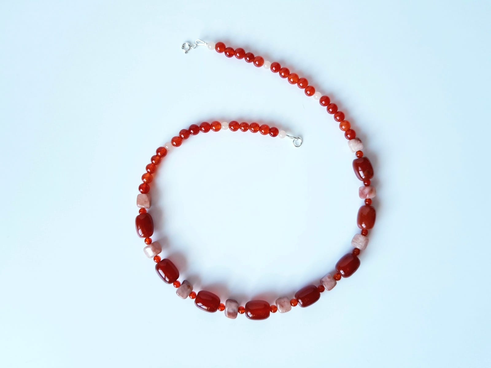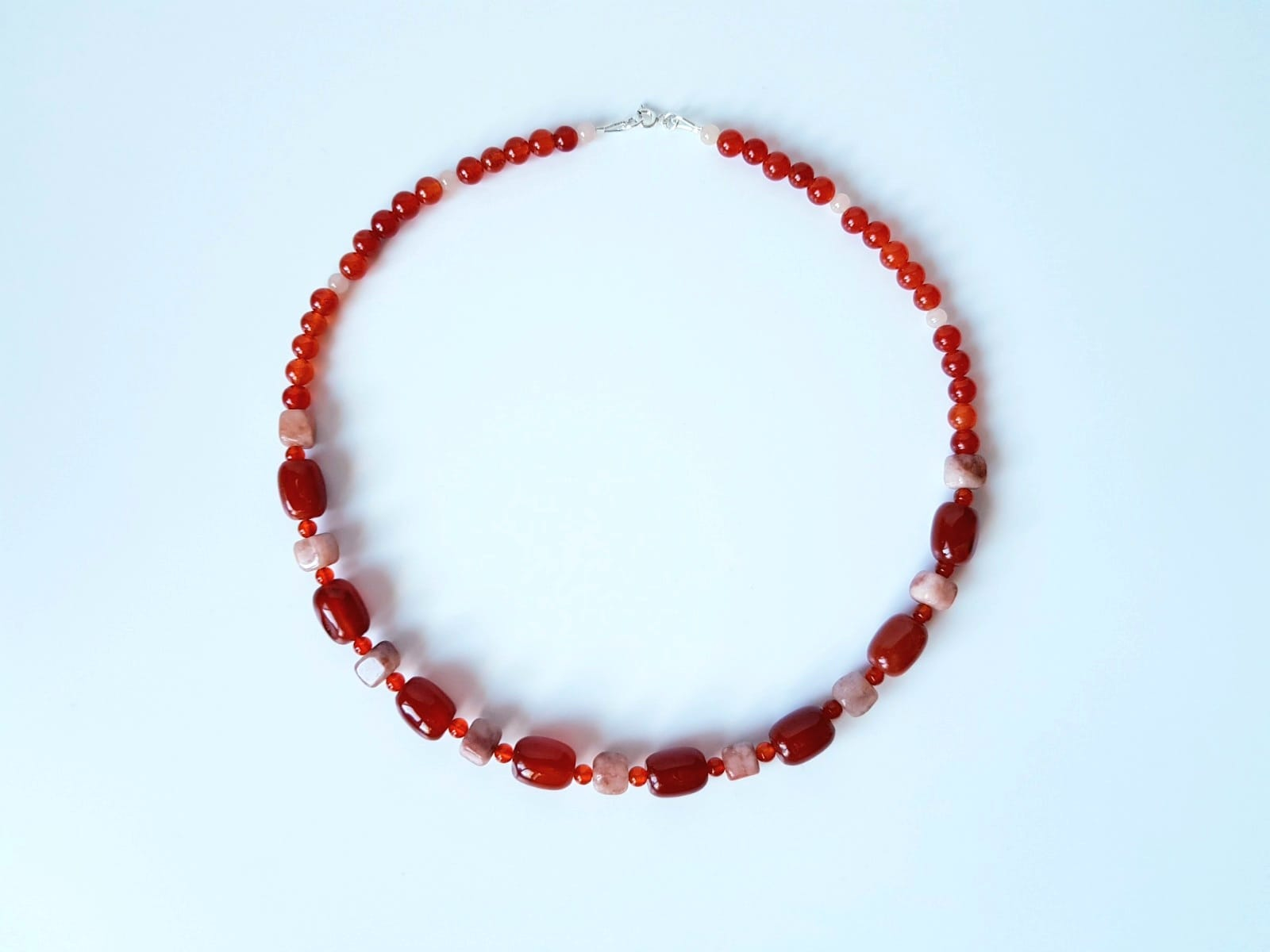 Colier handmade cu lungimea de 47 cm, realizat din carneol sub forma de tuburi rotunjite de 10x14 mm, combinat cu jad cuburi neregulate grena de 7,5 mm, agat grena in sfere delicate de 4 mm si jad coniac in sfere de 6 mm. Colierul este finisat cu accesorii din argint 925, oferind durabilitate si eleganta subtila.