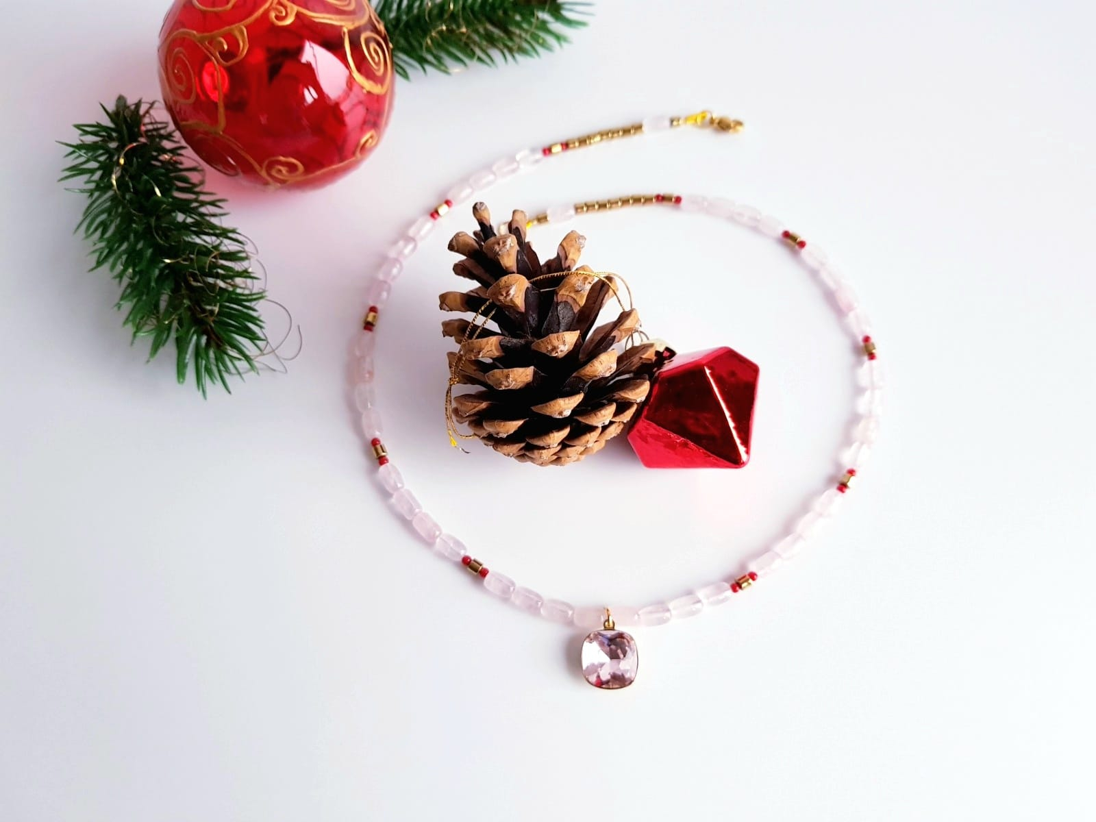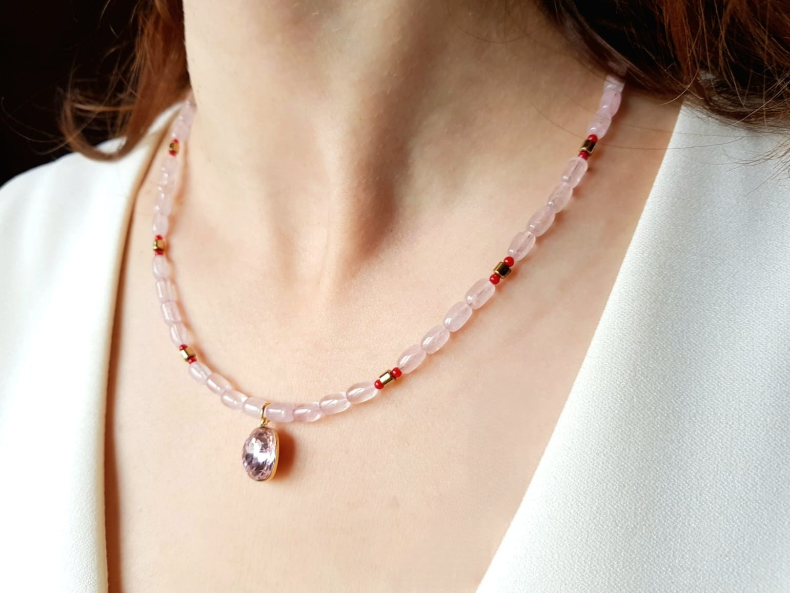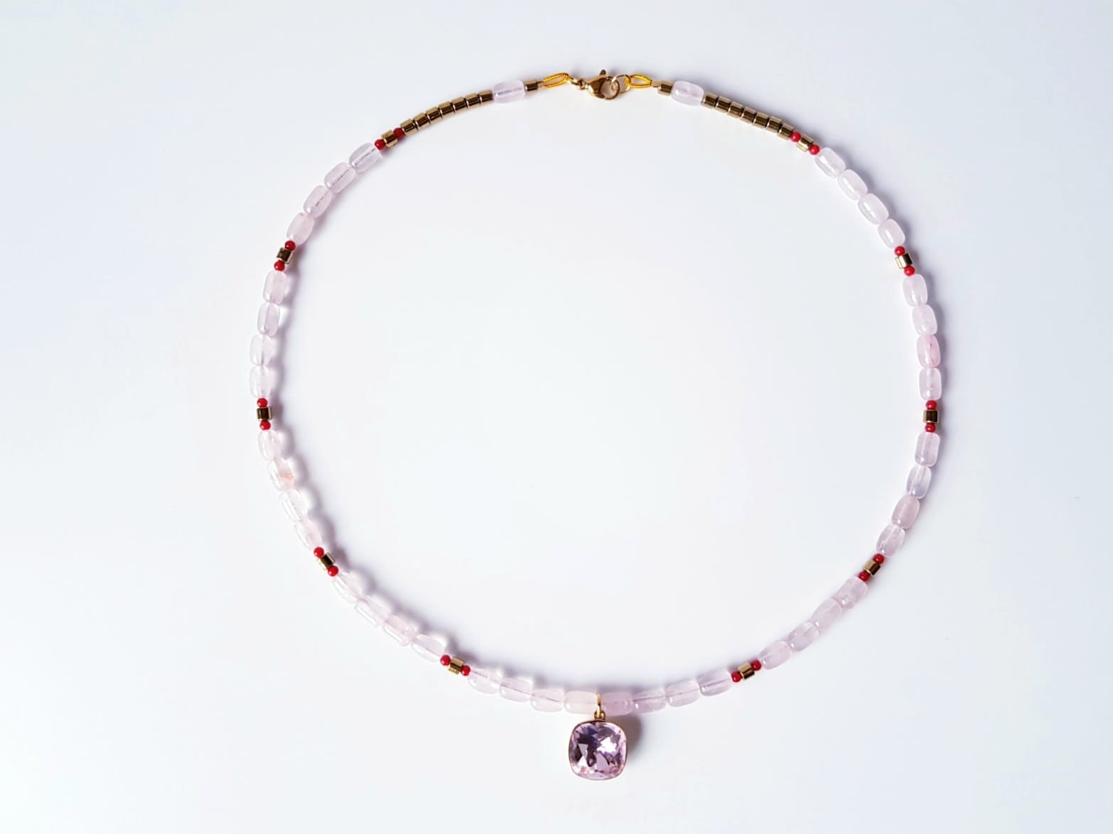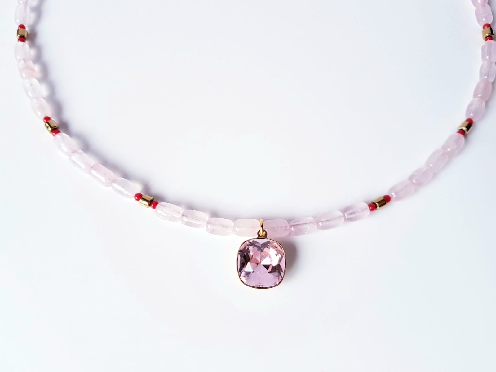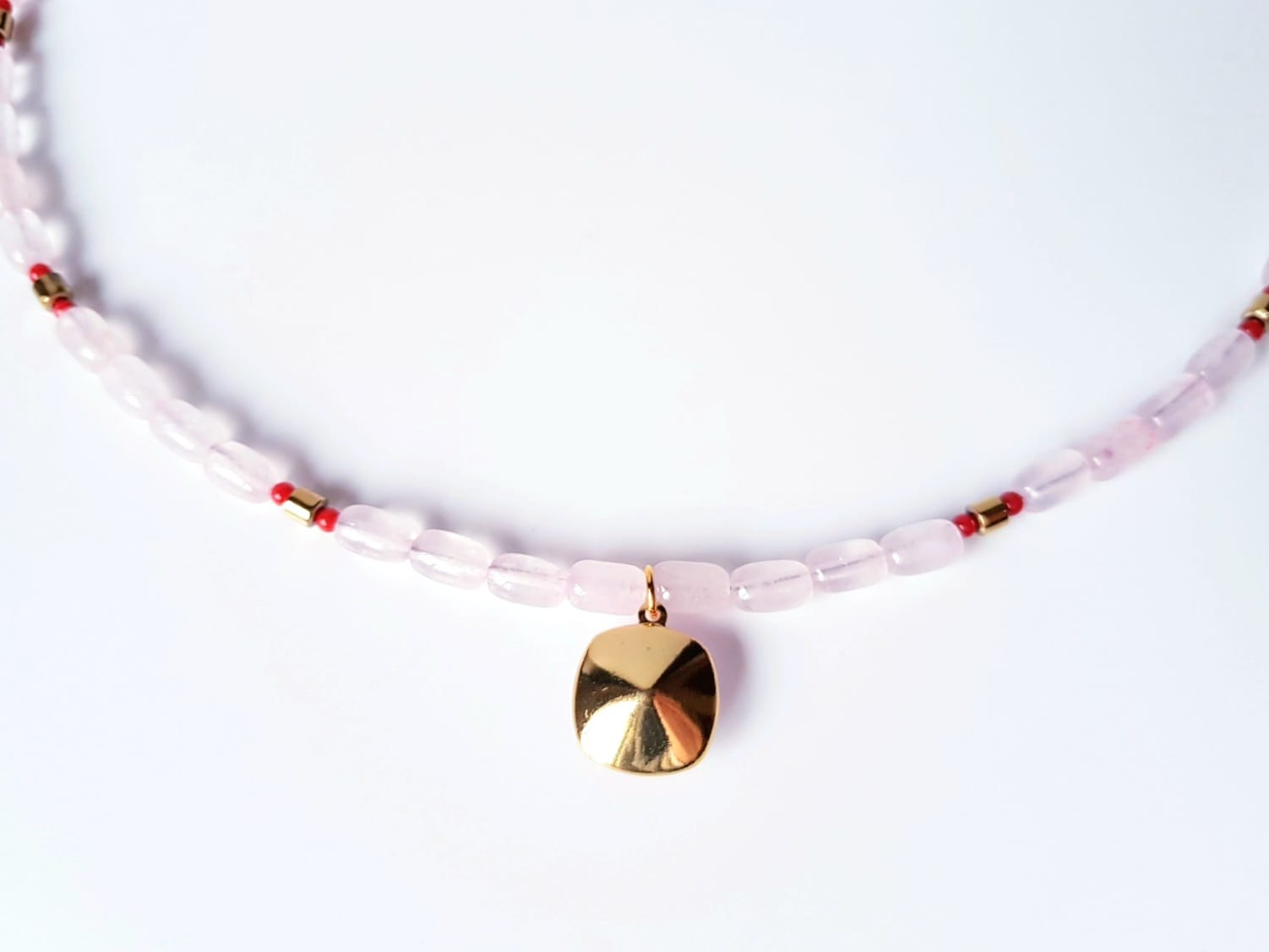 Colier de 45,5 cm lungime, cu cuart roz tuburi de 5x7 mm, coral rosu sfere de 2,5 mm, hematit auriu tuburi de 3 mm si pandantiv cristal roz in cupru placat auriu. Colierul este finisat cu accesorii din otel inoxidabil placat cu aur 18 k.