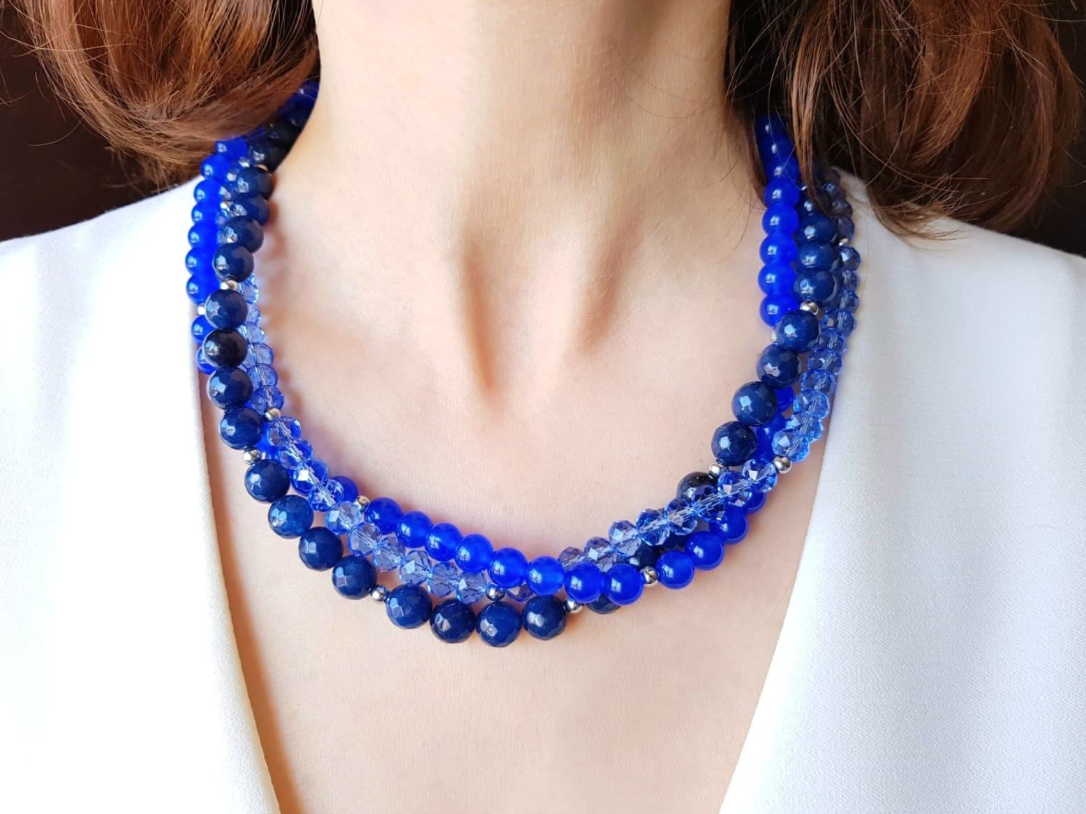 Colier handmade multisir, realizat din trei siruri armonios imbinate, cu o lungime de 51,5 cm. Designul imbina sfere din jad bleumarin de 8 mm, sfere fatetate din jad safir de 10 mm si cristale fatetate de 8 mm, creand un joc elegant de nuante profunde si reflexii luminoase. Contrastul dintre tonurile intense de albastru si stralucirea cristalelor confera colierului un aer sofisticat si echilibrat. Piesa este finisata cu accesorii din argint 925, pentru un plus de rafinament si durabilitate.