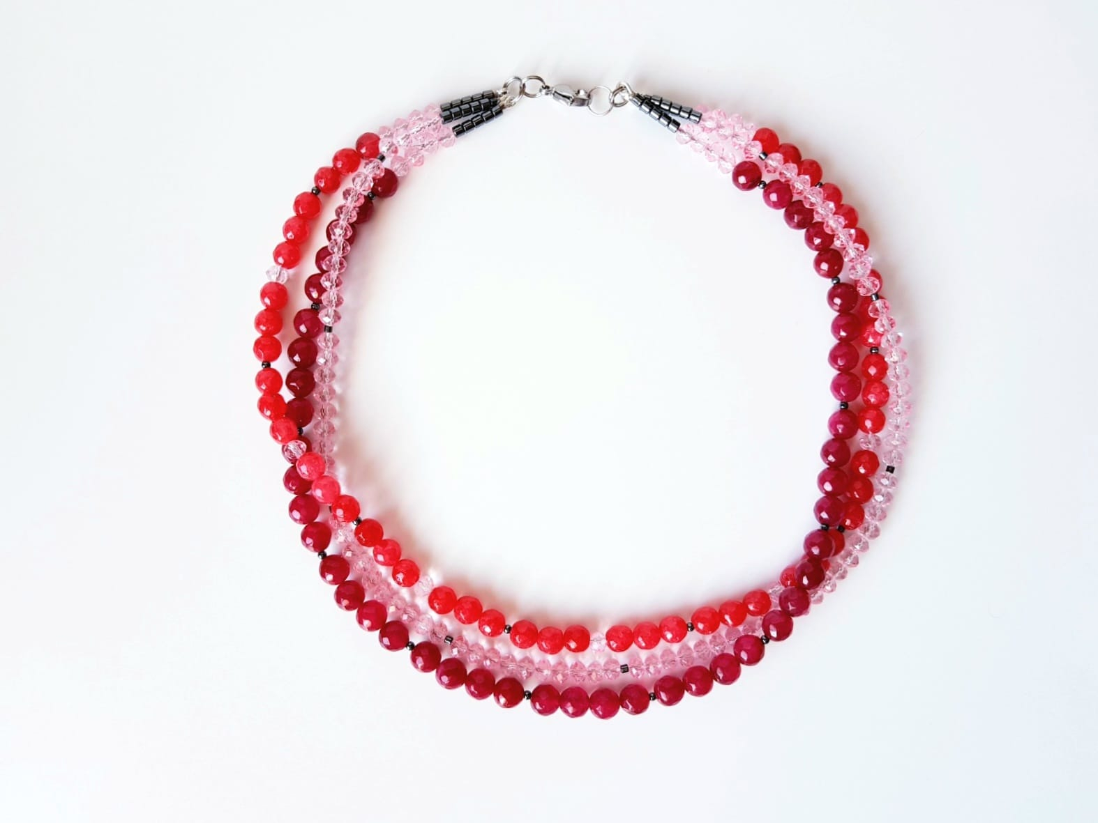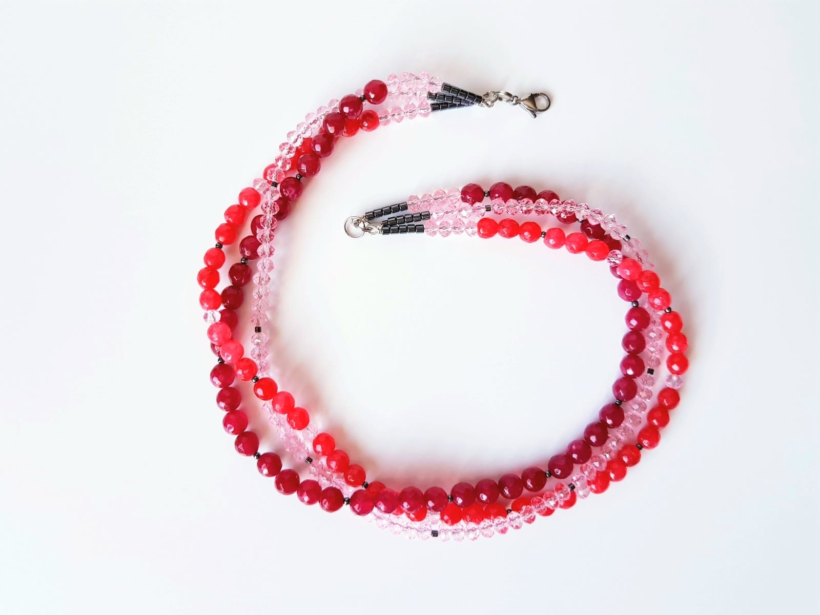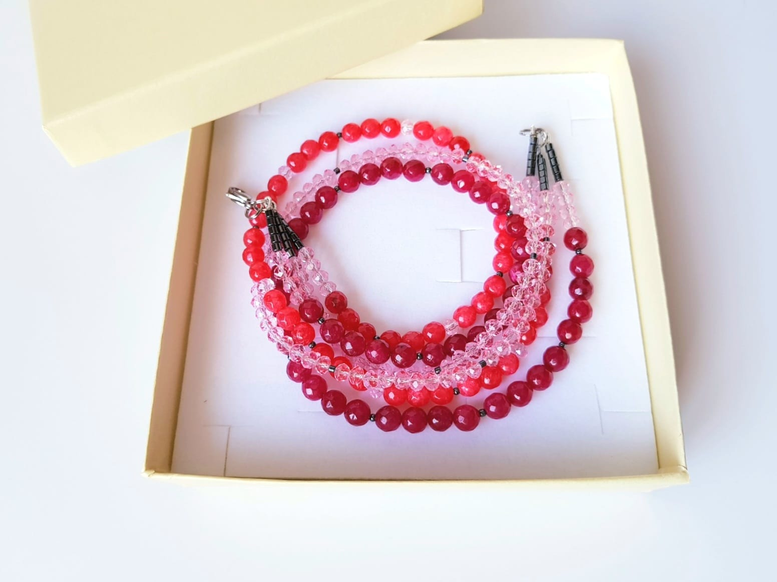 Colier handmade multisir, compus din trei siruri armonios imbinate, cu o lungime de 51 cm. Designul imbina sfere fatetate din jad rosu de 7 mm, agat visiniu fatetat de 8 mm si cristale roz fatetate de 6 mm, creand un joc elegant de culoare, lumina si textura. Contrastul dintre nuantele intense si accentele delicate confera colierului un aer sofisticat si feminin. Piesa este finisata cu accesorii din otel inoxidabil, pentru rezistenta si confort la purtare.