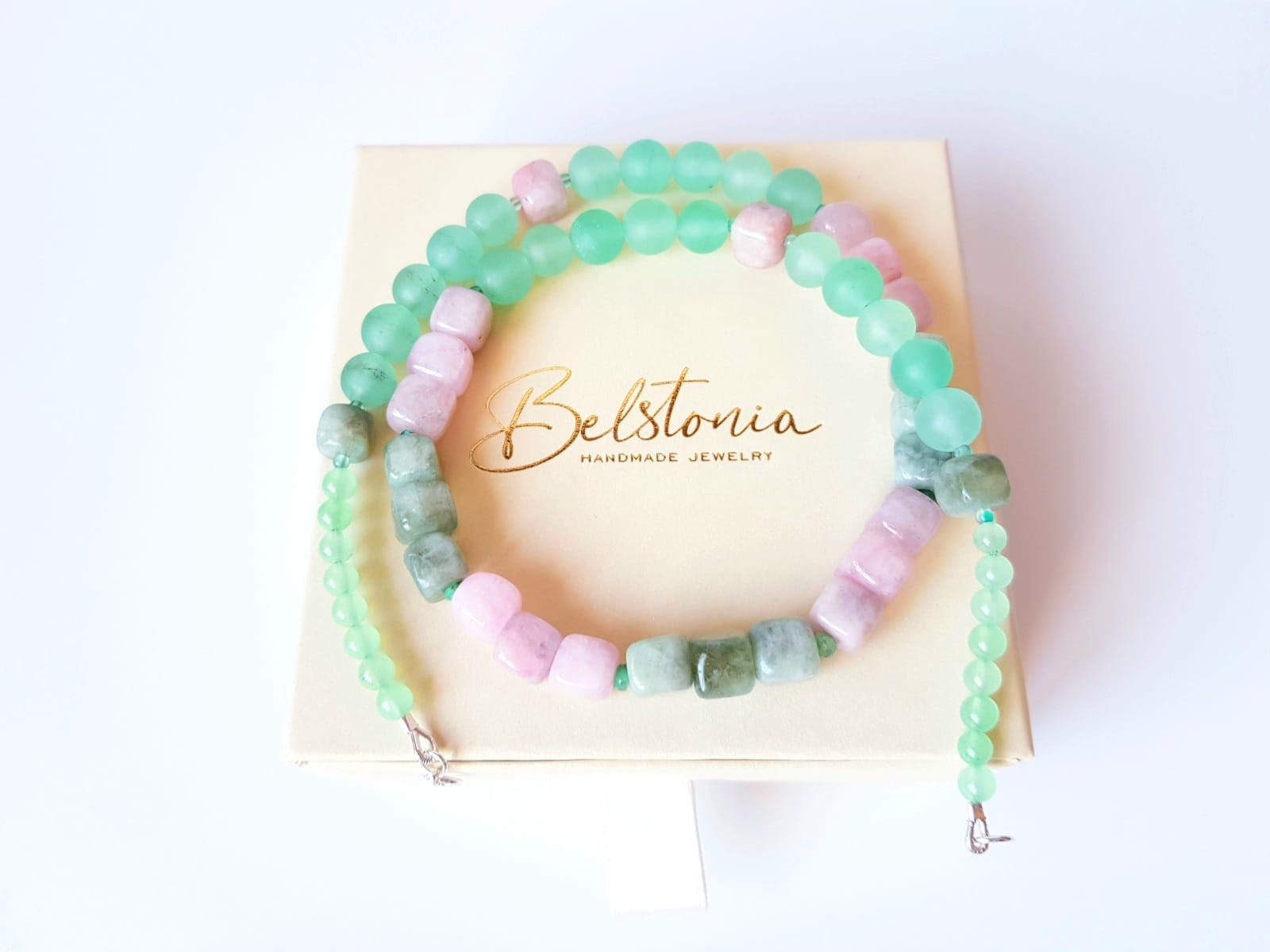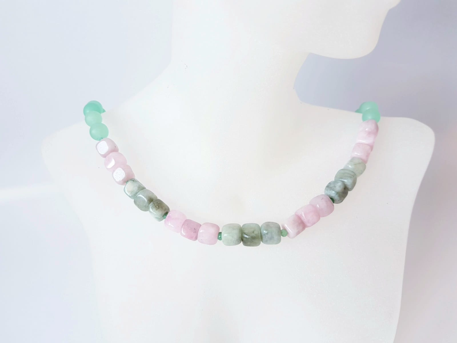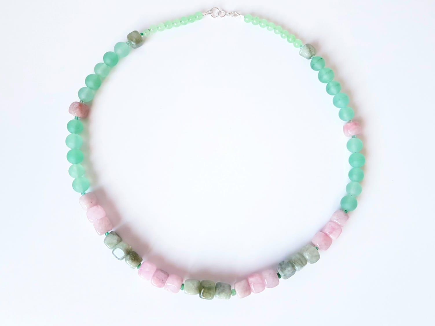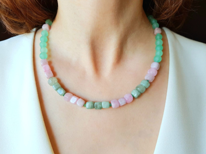 Colier handmade cu lungimea de 46 cm, realizat din jad roz-verde sub forma de cuburi neregulate de 7,5 mm, combinat cu jad vernil in sfere de 4,5 si 8 mm si agat verde in sfere delicate de 2,5 mm. Colierul este finisat cu accesorii din argint 925, conferind rafinament si rezistenta.
