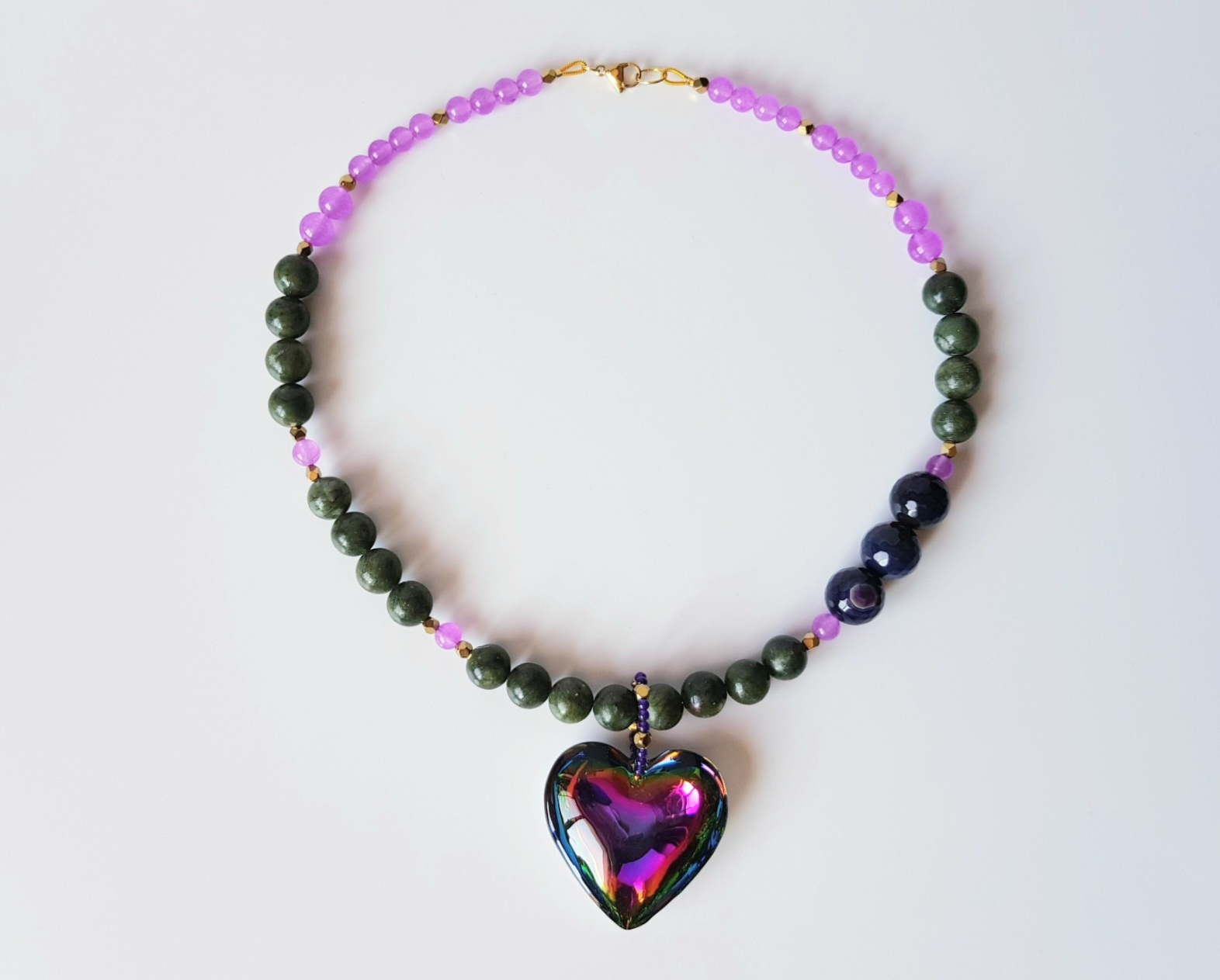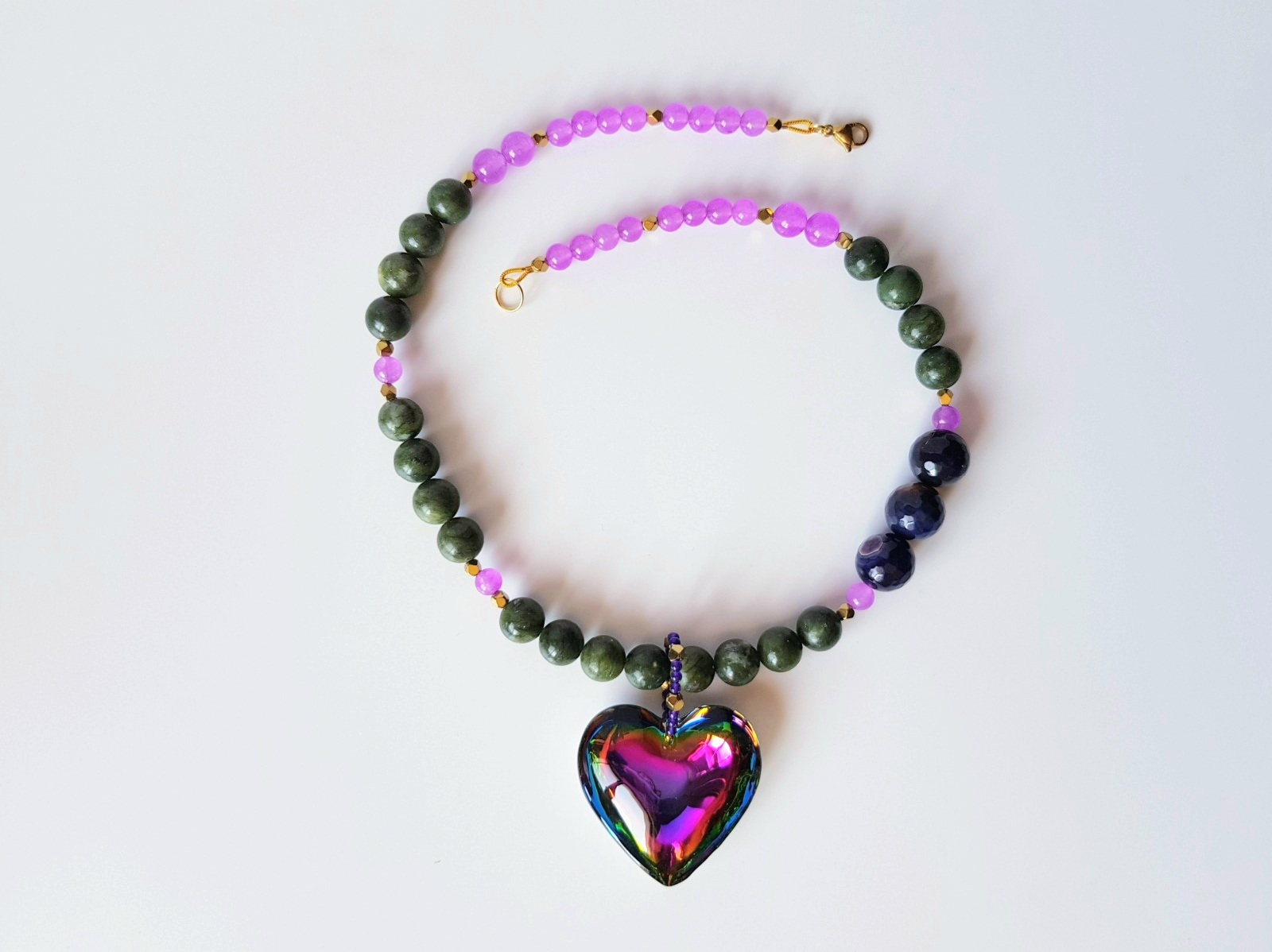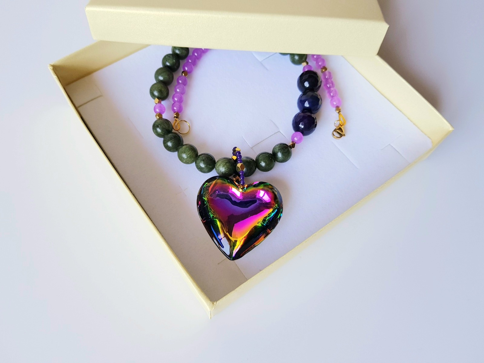 Elementul central este un pandantiv spectaculos din sticla electroplacata, in forma de inima (42x44x15 mm), cu reflexii multicolore ce capteaza lumina si atrag toate privirile. Colierul este finisat cu accesorii din otel inoxidabil placat cu aur de 18k, oferind durabilitate si un aspect sofisticat.