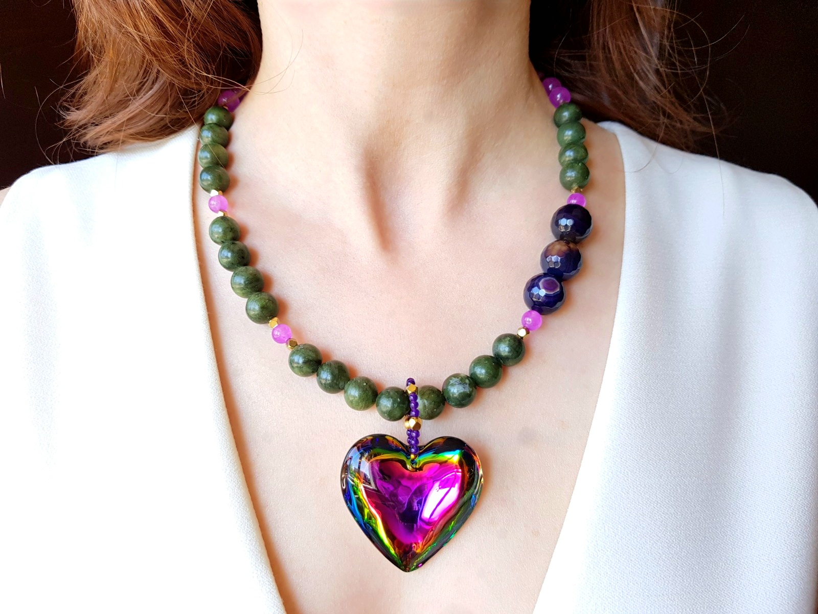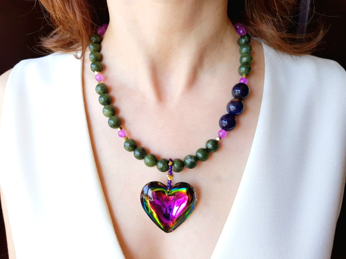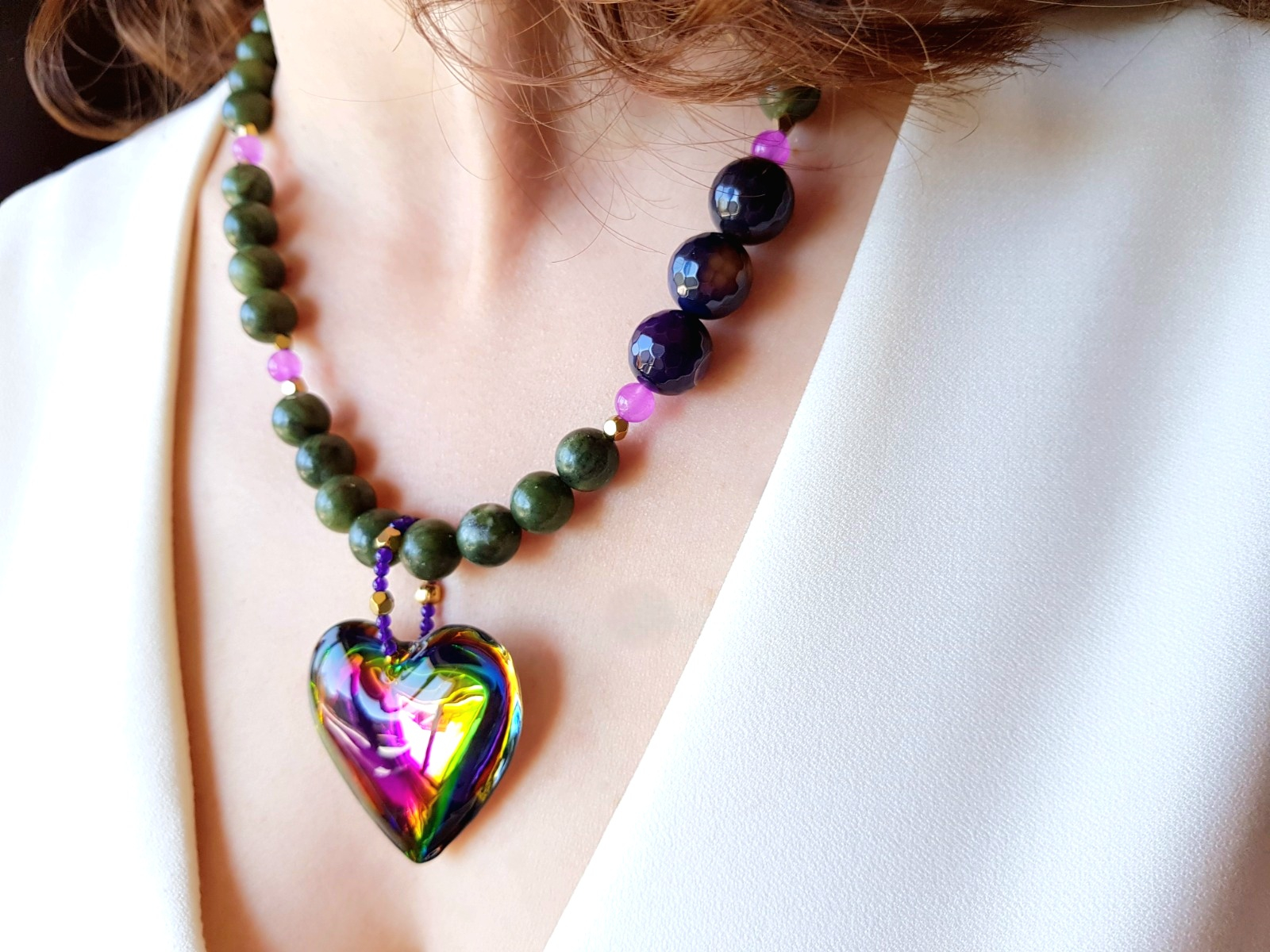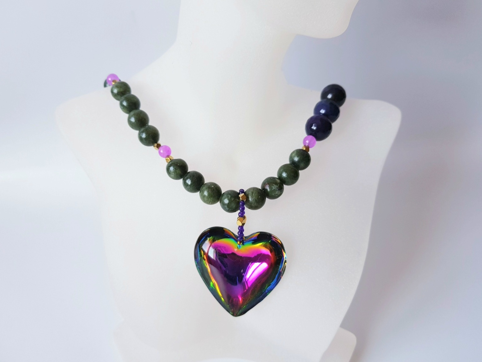 Elementul central este un pandantiv spectaculos din sticla electroplacata, in forma de inima (42x44x15 mm), cu reflexii multicolore ce capteaza lumina si atrag toate privirile. Colierul este finisat cu accesorii din otel inoxidabil placat cu aur de 18k, oferind durabilitate si un aspect sofisticat.