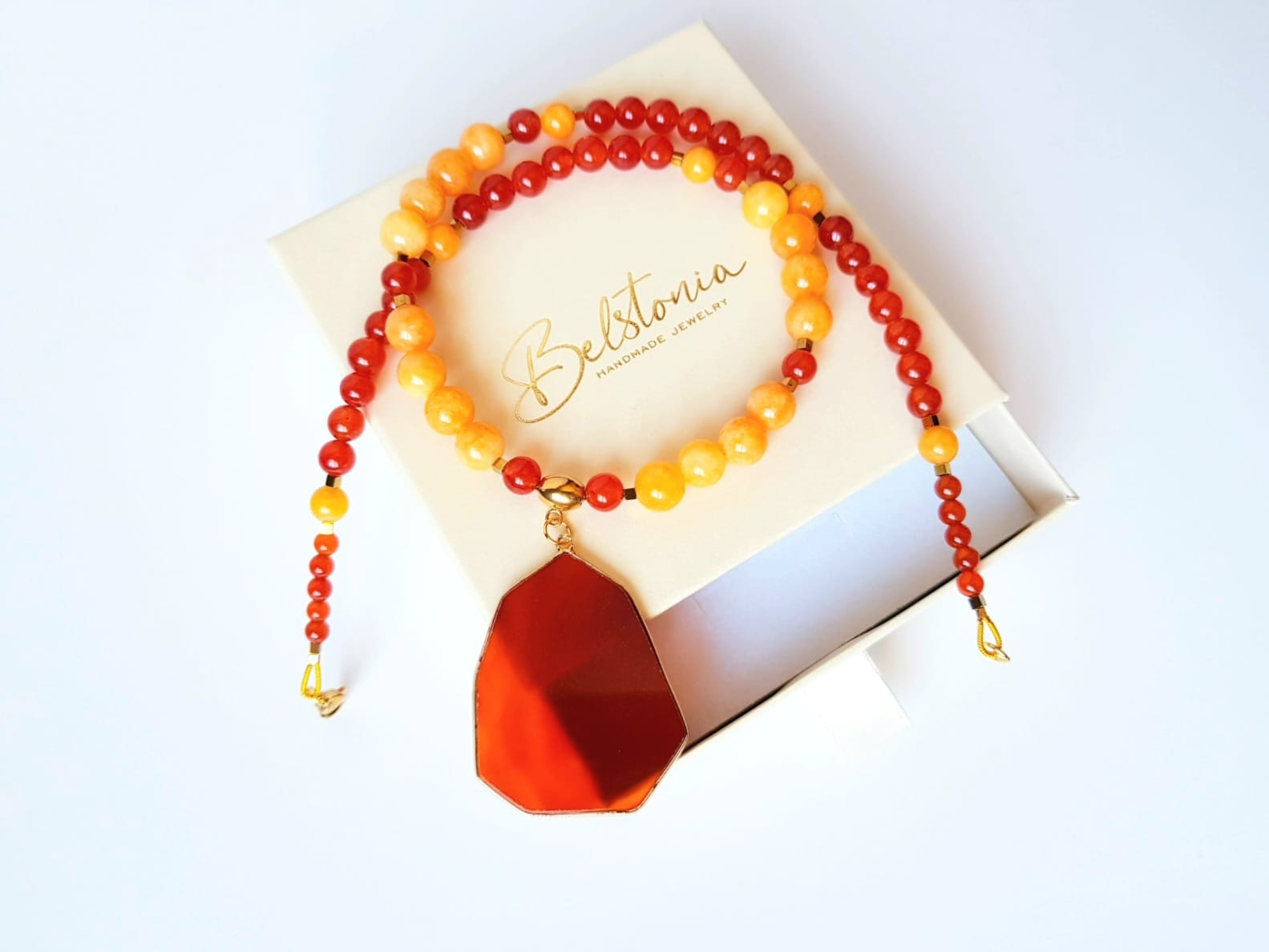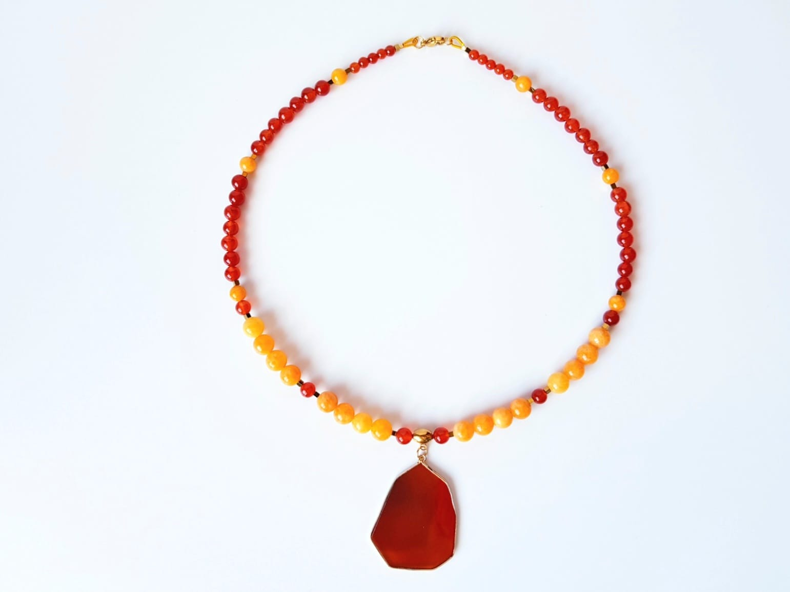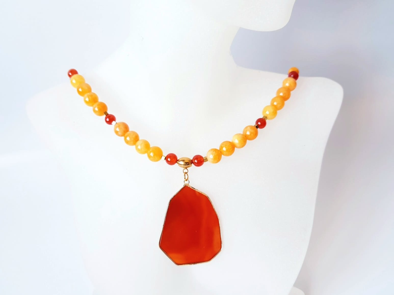 Colier handmade cu lungimea de 48 cm, realizat din jad coniac sfere de 4 si 6 mm, combinat armonios cu jad galben sfere de 6 si 8 mm. Designul este completat de insertii discrete din hematit auriu sub forma de cuburi de 2 mm, care adauga un accent modern. Piesa este pusa in valoare de un pandantiv spectaculos din carneol, sub forma de felie neregulata de 4 cm, montat in cupru placat auriu. Colierul este finisat cu accesorii din otel inoxidabil placat cu aur de 18 k, pentru un plus de eleganta si rezistenta.