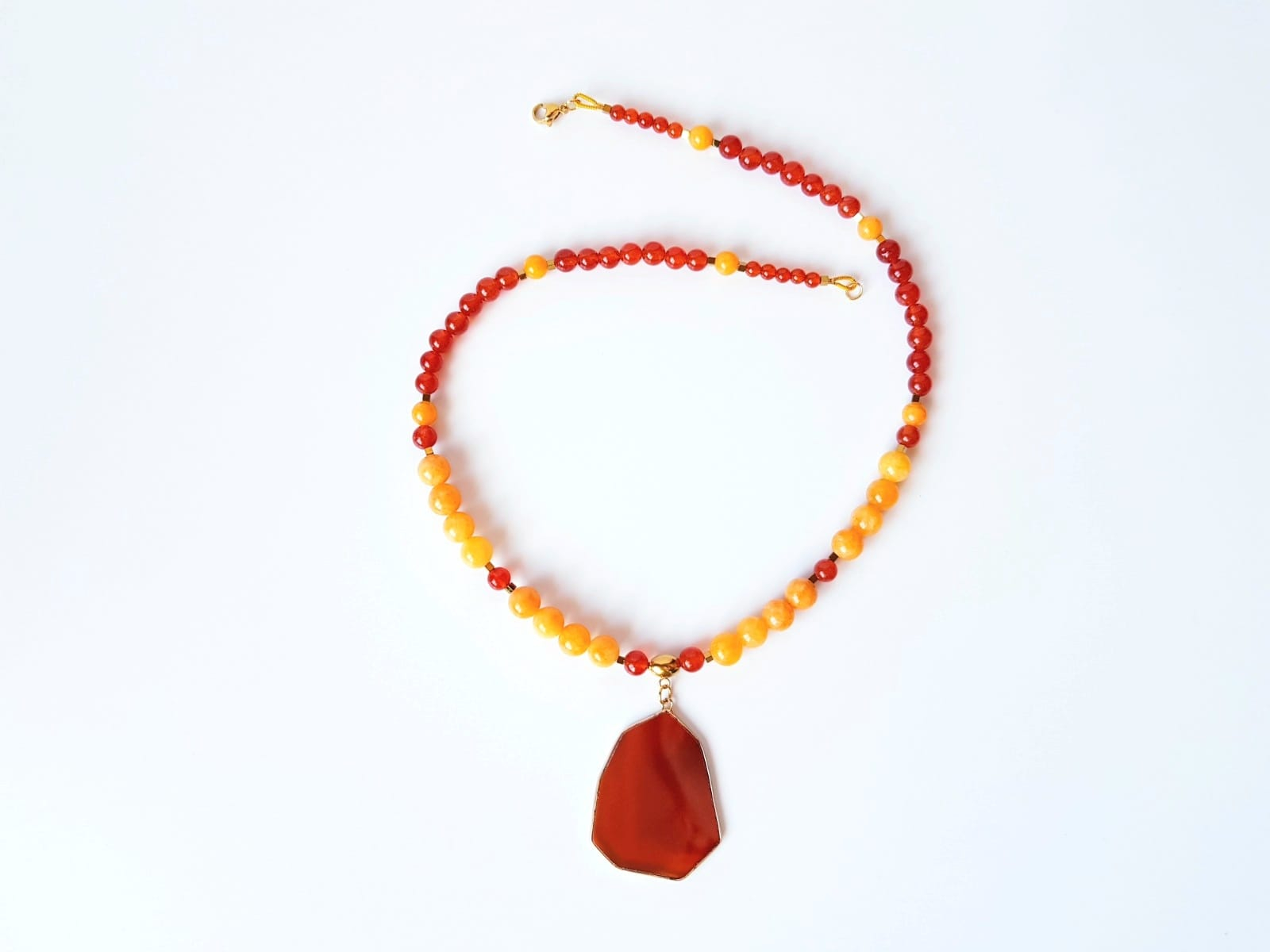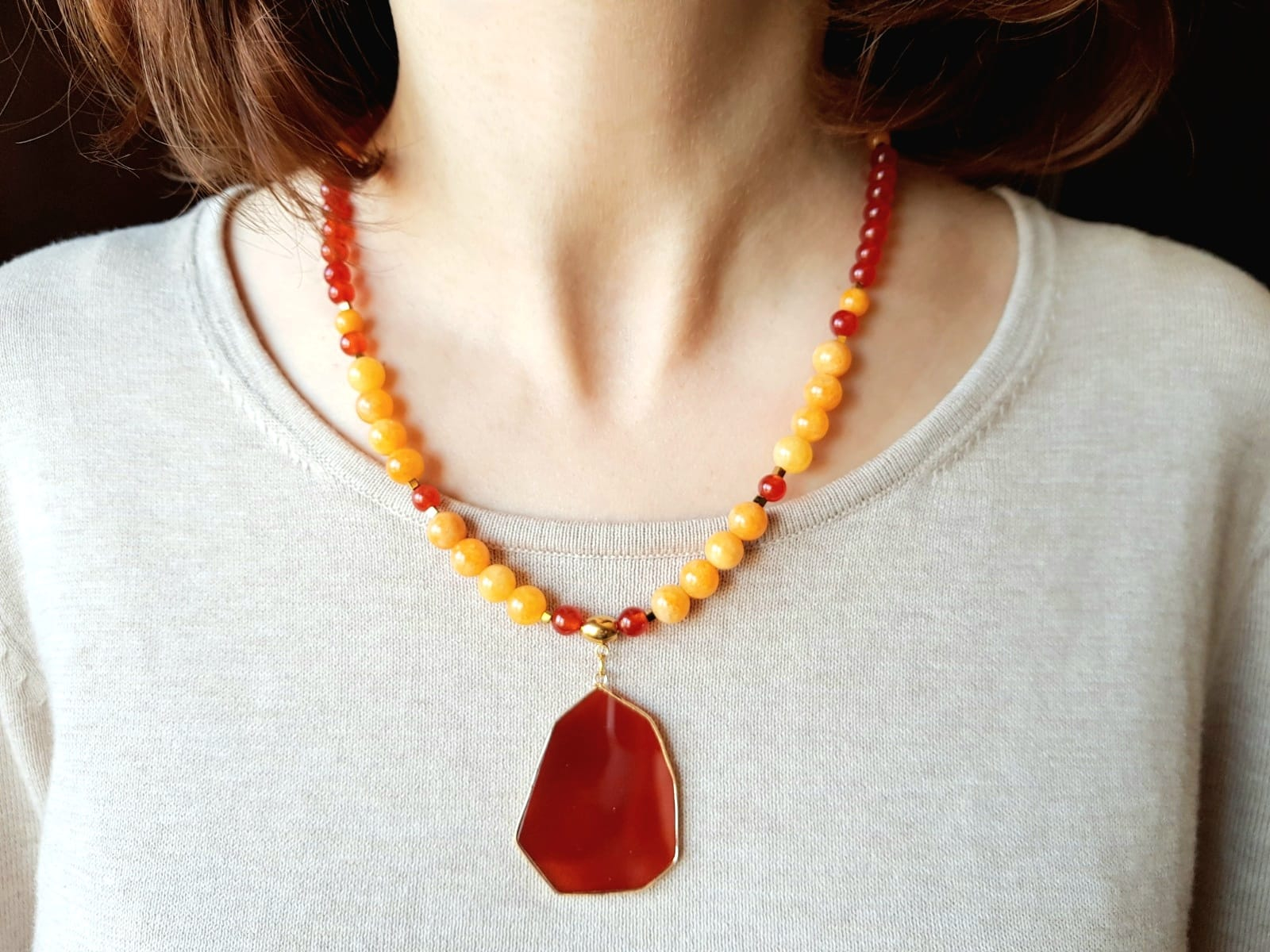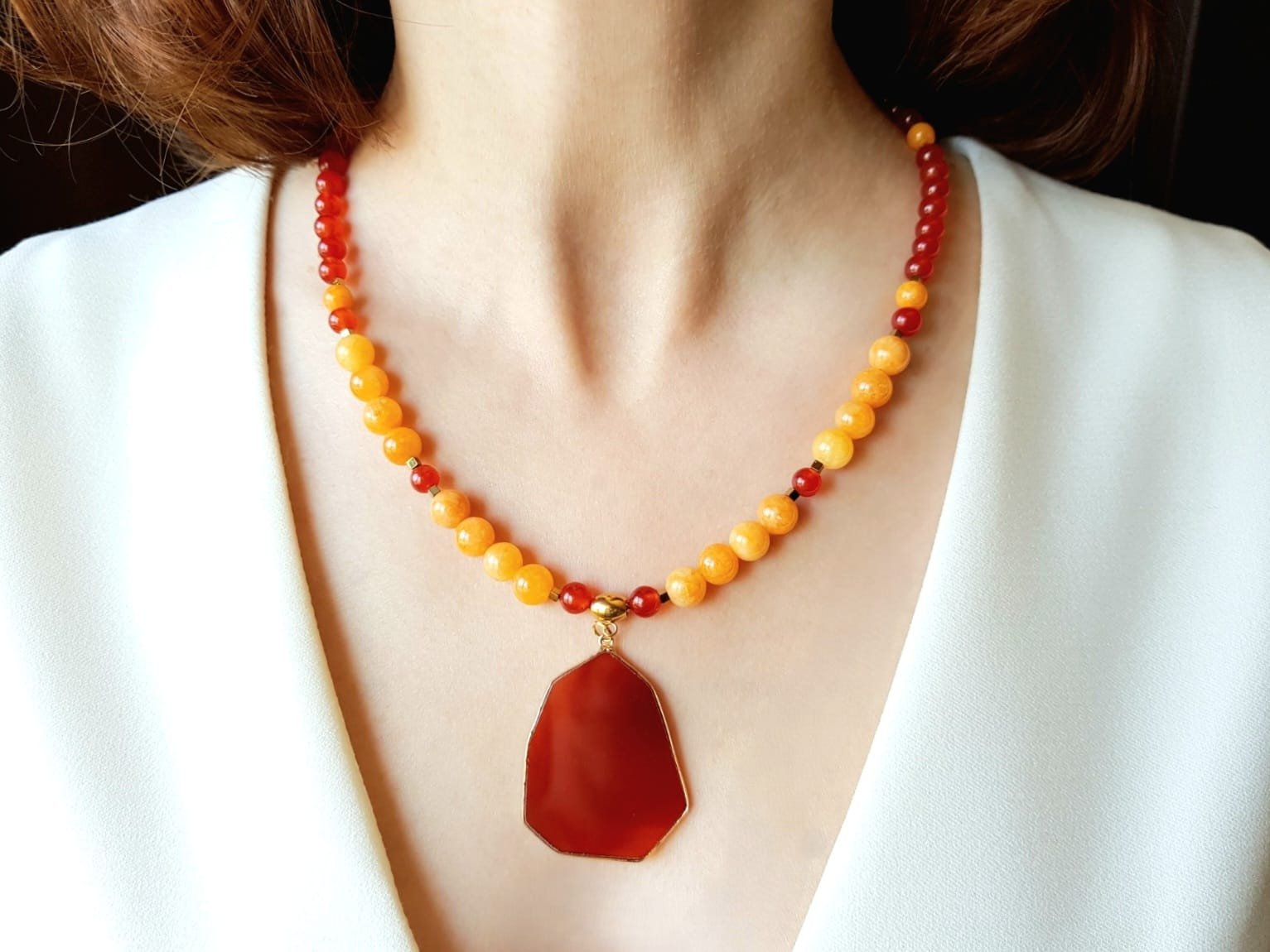 Colier handmade cu lungimea de 48 cm, realizat din jad coniac sfere de 4 si 6 mm, combinat armonios cu jad galben sfere de 6 si 8 mm. Designul este completat de insertii discrete din hematit auriu sub forma de cuburi de 2 mm, care adauga un accent modern. Piesa este pusa in valoare de un pandantiv spectaculos din carneol, sub forma de felie neregulata de 4 cm, montat in cupru placat auriu. Colierul este finisat cu accesorii din otel inoxidabil placat cu aur de 18 k, pentru un plus de eleganta si rezistenta.