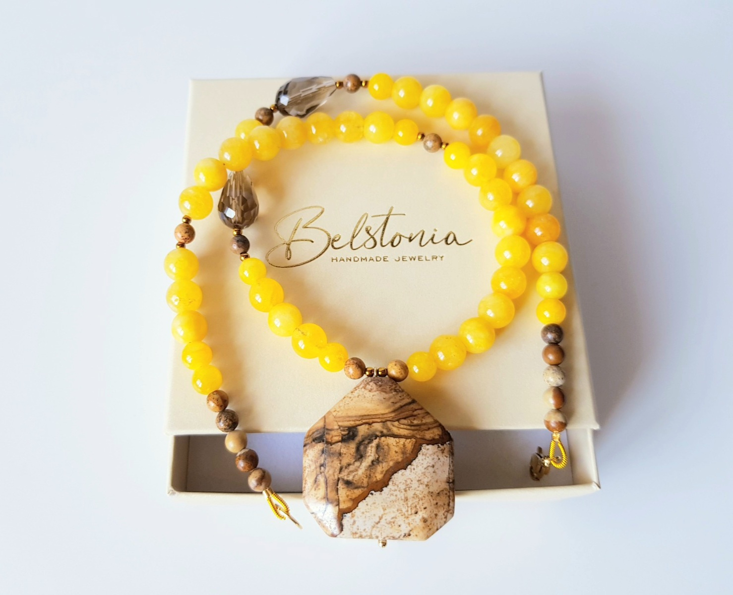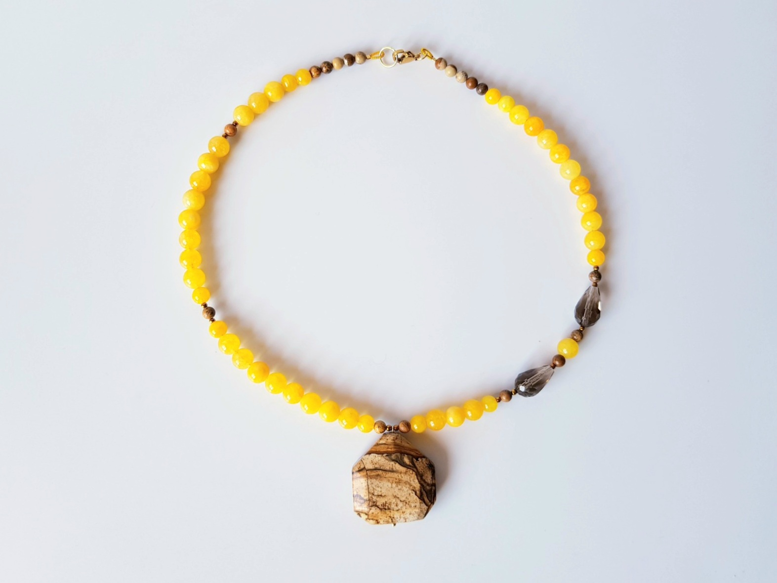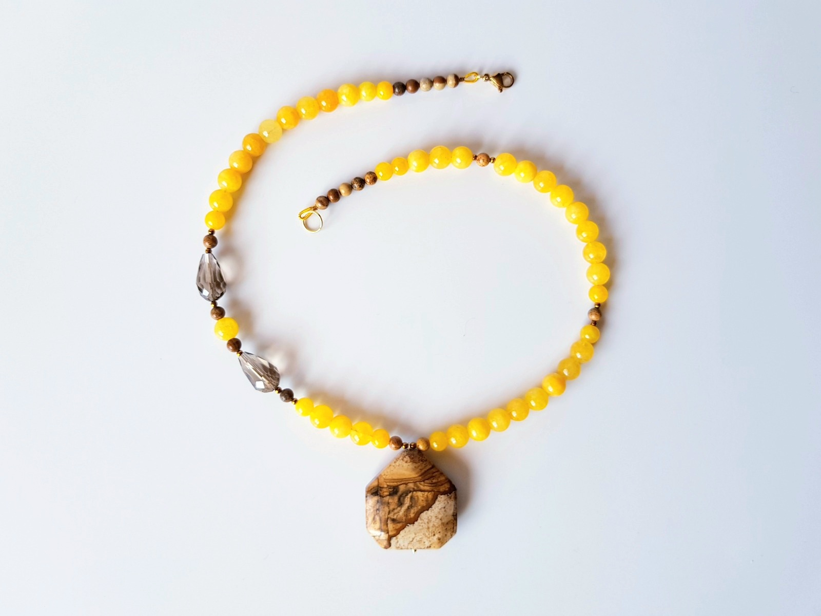 Jadul galben este asociat cu bucuria, optimismul si energia pozitiva, stimuland increderea si claritatea mentala.Un colier expresiv si elegant, ideal pentru a completa tinutele cu personalitate si pentru a aduce un plus de caldura si armonie stilului tau.
