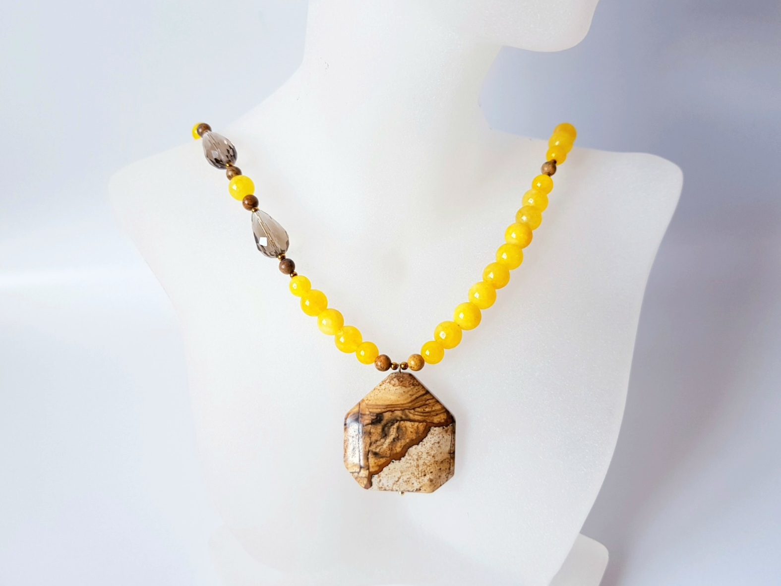Colier statement, cu o lungime de 47,5 cm, ce impresioneaza prin combinatia calda de nuante pamantii si accente luminoase. Este realizat din sfere de jad galben de 6 si 8 mm, hematit auriu sfere de 2 mm si jasp picture sfere de 5 mm, armonios imbinate pentru un efect natural si echilibrat. Designul este pus in valoare de cristalele fatetate in forma de picatura (18x8 mm), montate lateral, care adauga eleganta si stralucire subtila.