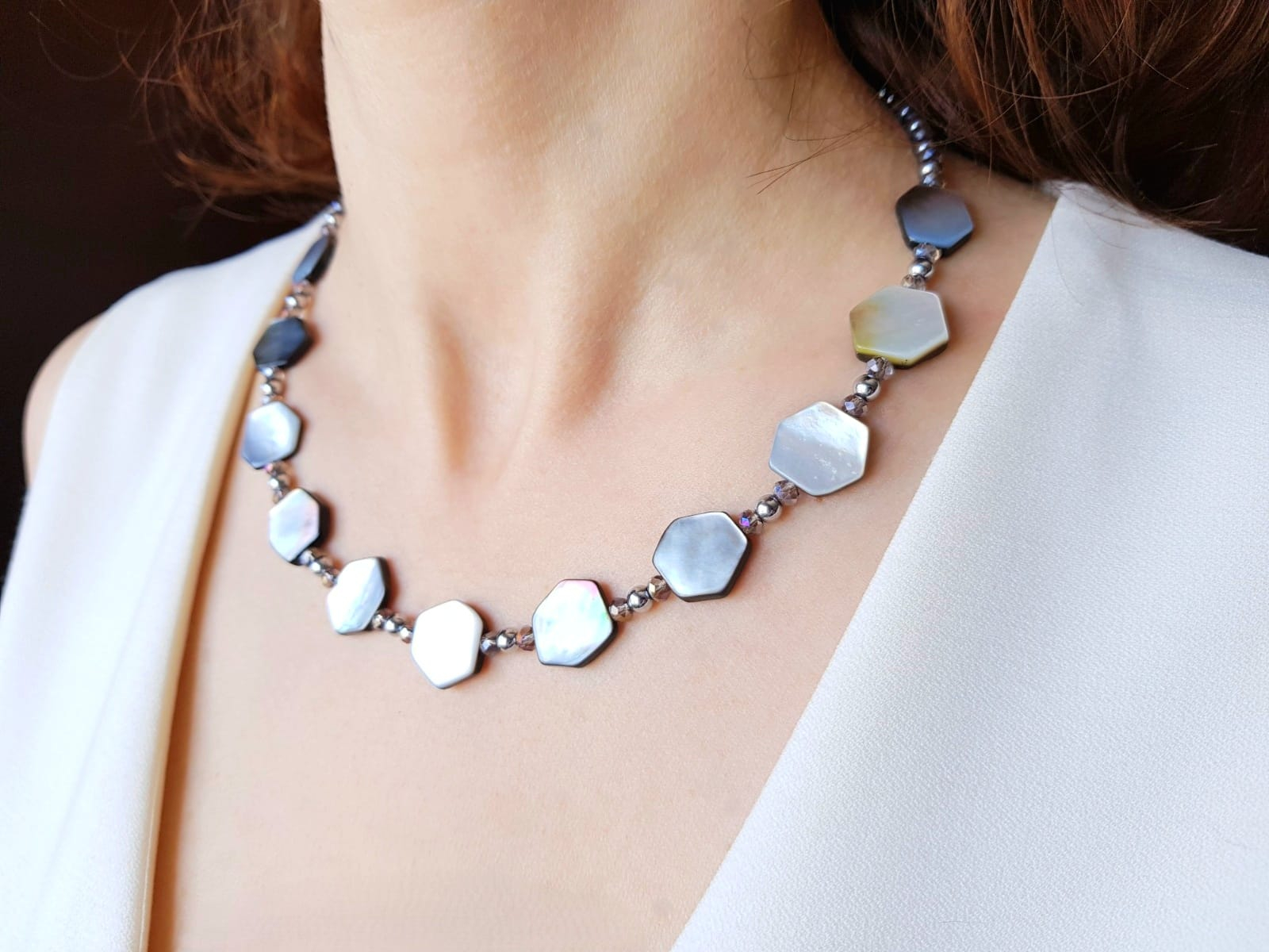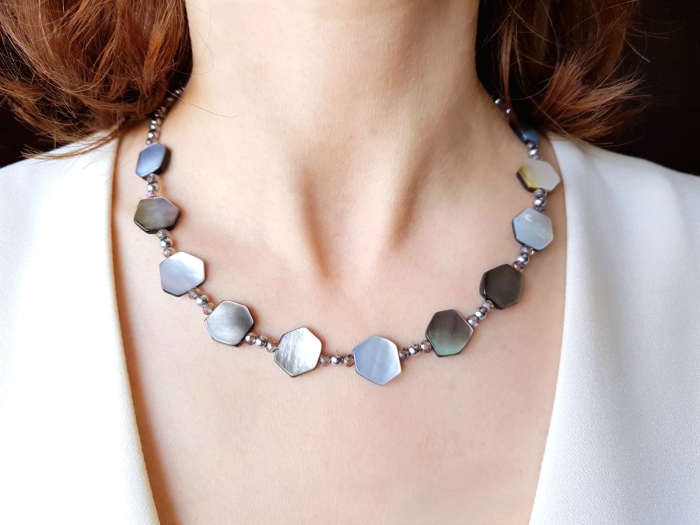 Colier handmade de 45 cm lungime, cu un design elegant si modern, realizat din sidef gri in forma de hexagon neregulat de 15 mm, care ofera un joc subtil de reflexii si un aspect sofisticat. Compozitia este completata de sfere din hematit argintiu de 4 mm si cristale fatetate sub forma de sfere de 5 mm, ce adauga luminozitate si finete. Colierul este finisat cu accesorii din argint 925, pentru un plus de rafinament si rezistenta in timp.