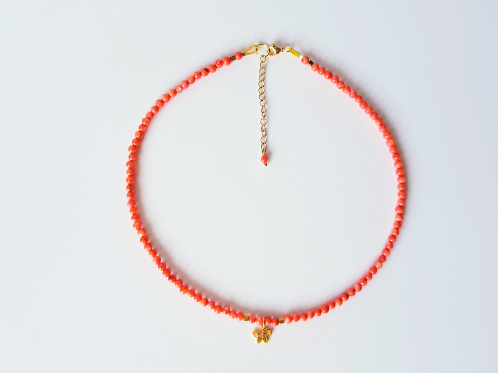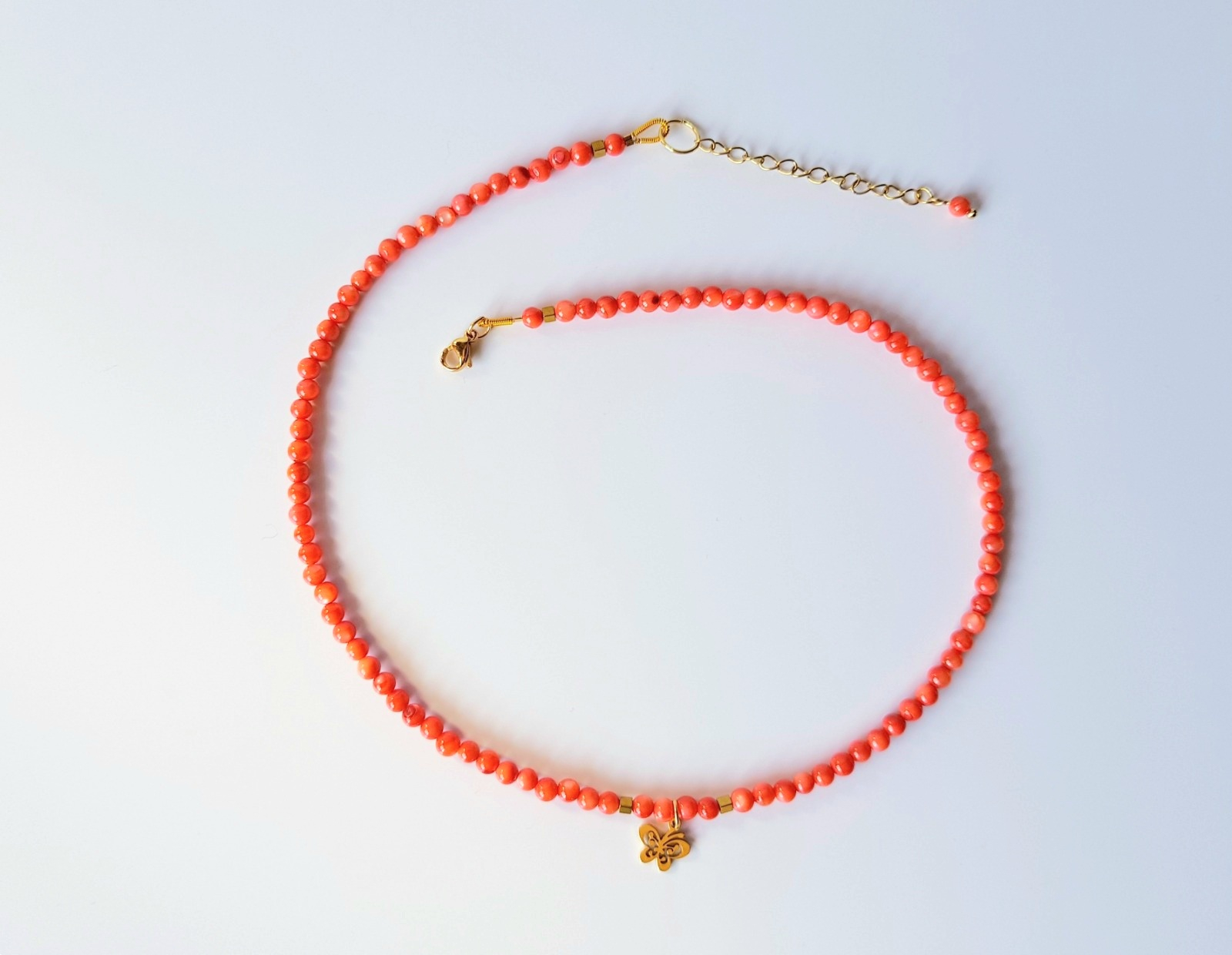 Acest colier delicat, cu o lungime de 42 cm si extensie de 5 cm, aduce un plus de prospetime si feminitate prin nuantele sale calde si detaliile fine. Este realizat din sfere de sidef portocaliu de 4 mm completate de cuburi de hematit de 2 mm care adauga un contrast subtil, elegant si modern.