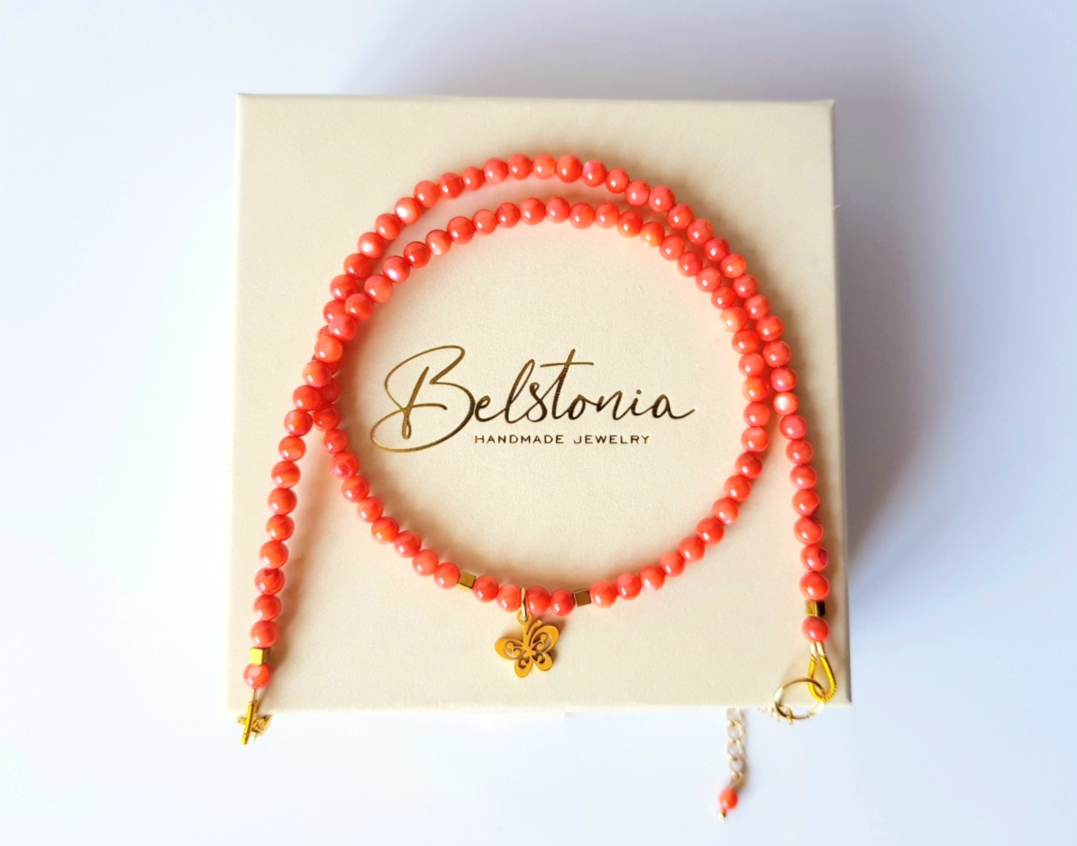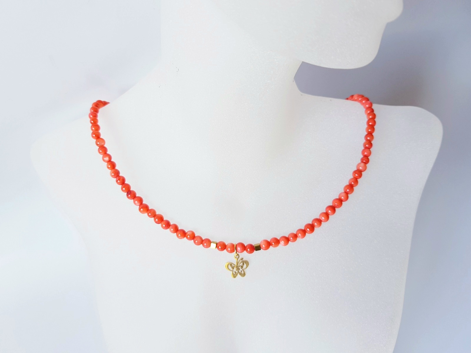 Piesa centrala este un pandantiv in forma de fluturas, de 10x10 mm, simbol al transformarii si al libertatii, ce confera colierului un aer jucaus si rafinat. Finisajele sunt realizate din otel inoxidabil placat cu aur de 18k, asigurand rezistenta si un aspect stralucitor de durata.