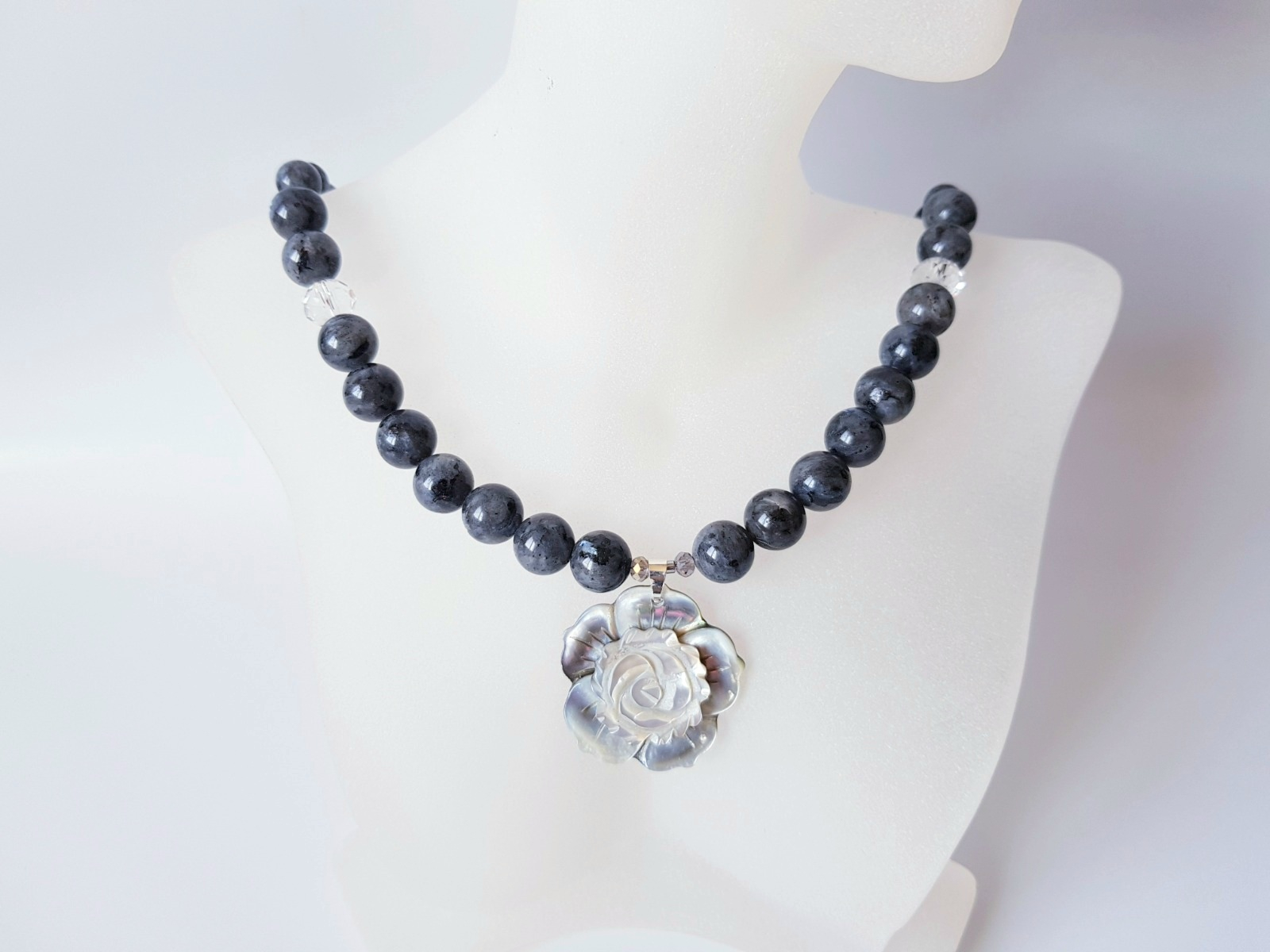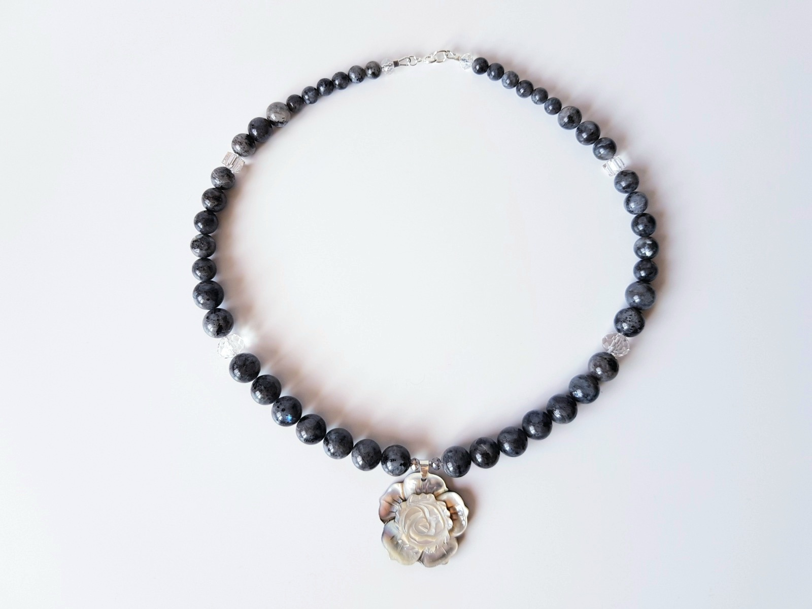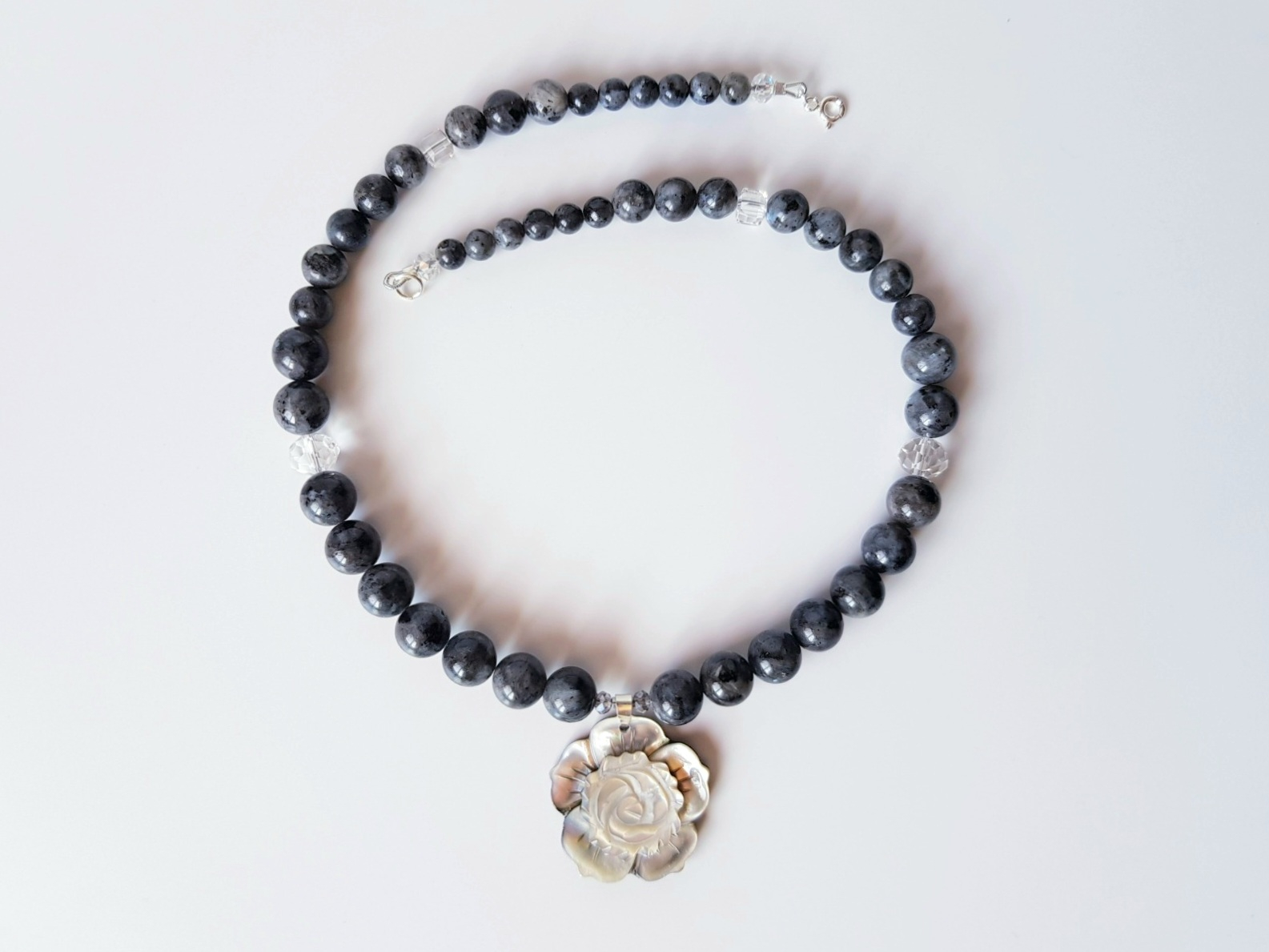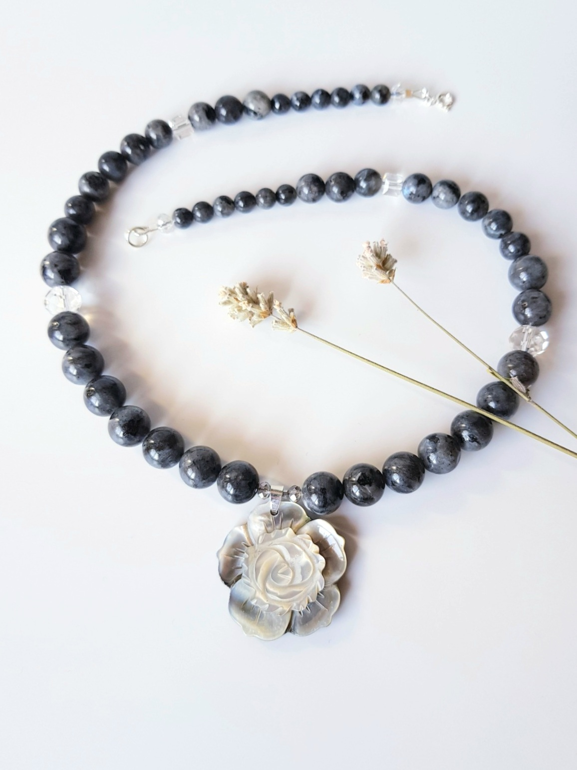 Piesa centrala este un pandantiv in forma de floare din sidef gri, cu diametrul de 3,5 cm, ce adauga o nota feminina si rafinata. Colierul este finisat cu accesorii din argint 925, pentru un plus de eleganta si durabilitate.