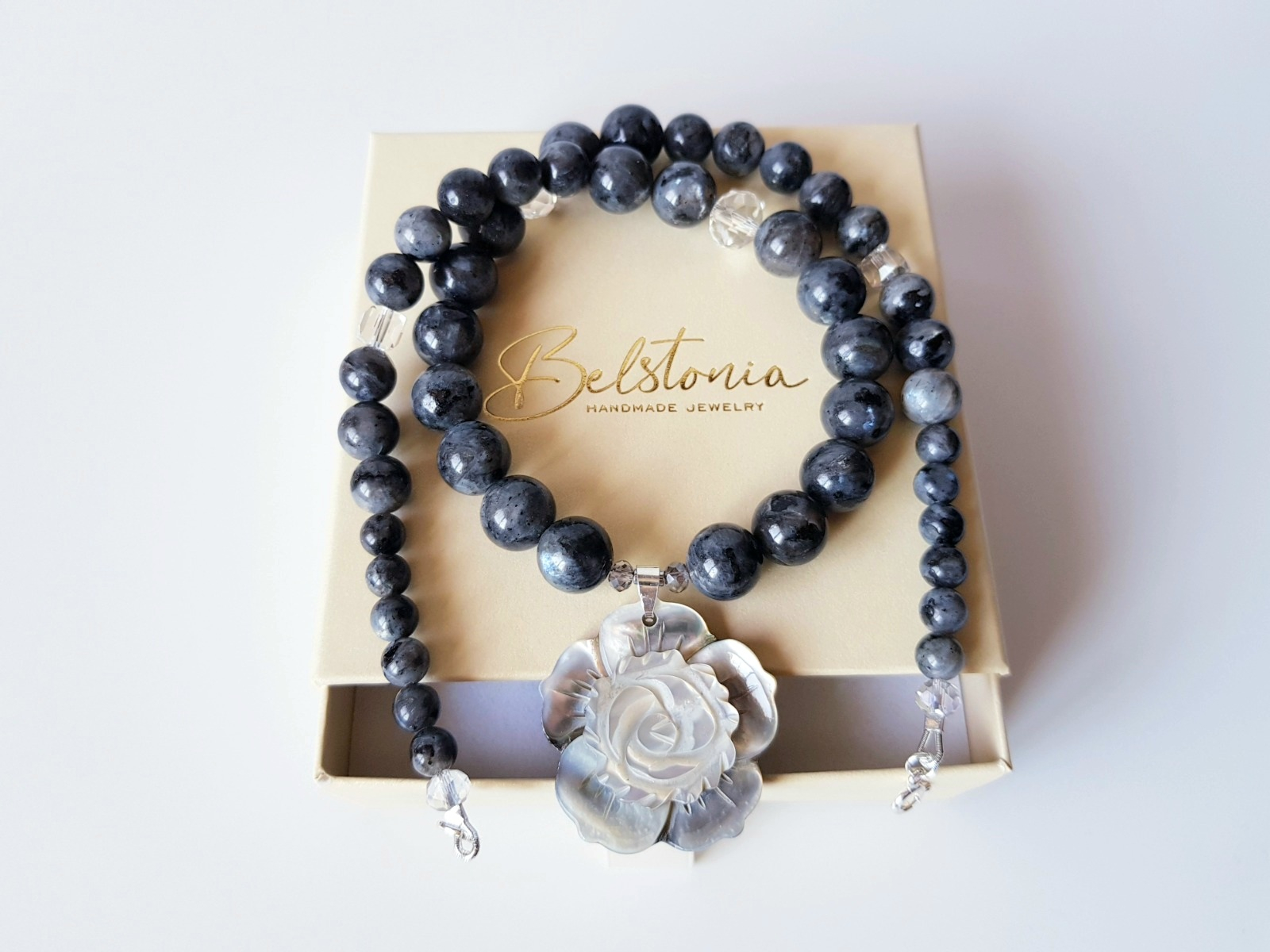 Labradoritul este cunoscut ca piatra protectiei si a intuitiei, ajutand la echilibrarea energiilor si la stimularea creativitatii.Un colier sofisticat, cu un aer misterios si delicat, ideal pentru a completa tinutele elegante sau pentru a adauga un accent special unei aparitii de zi.