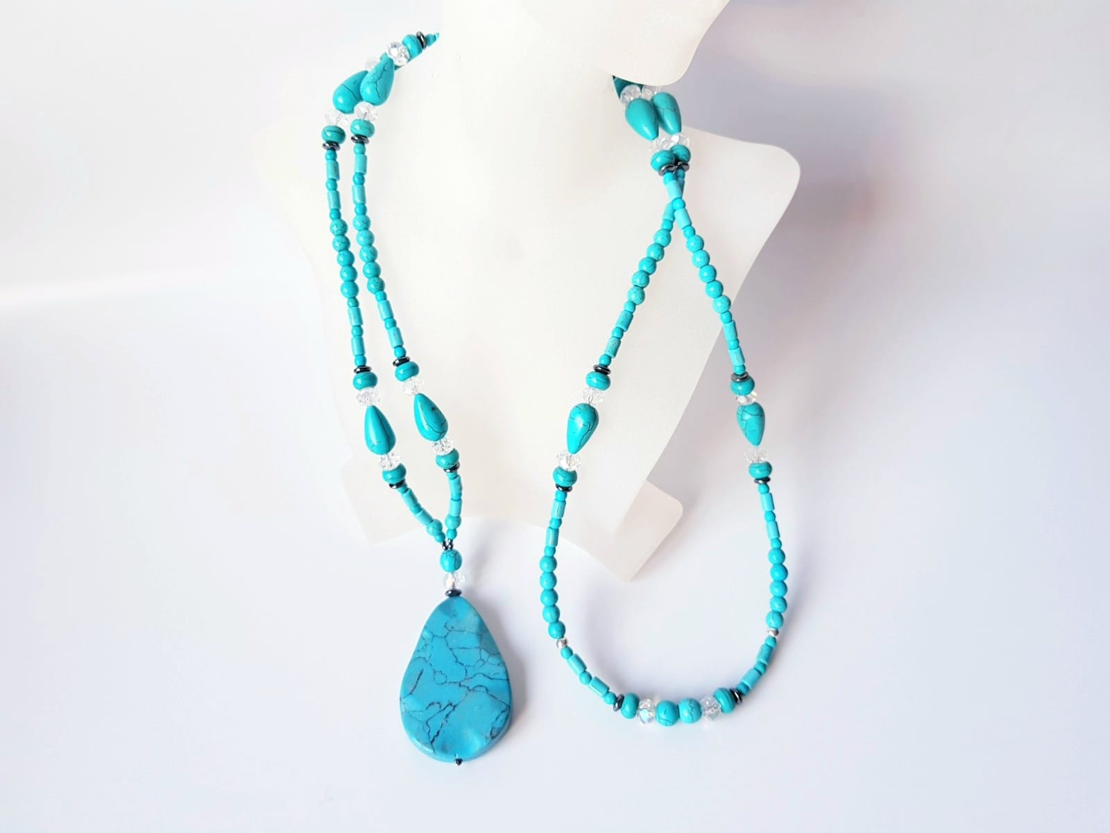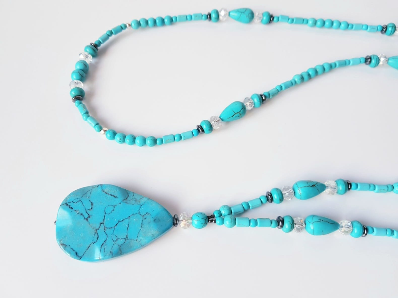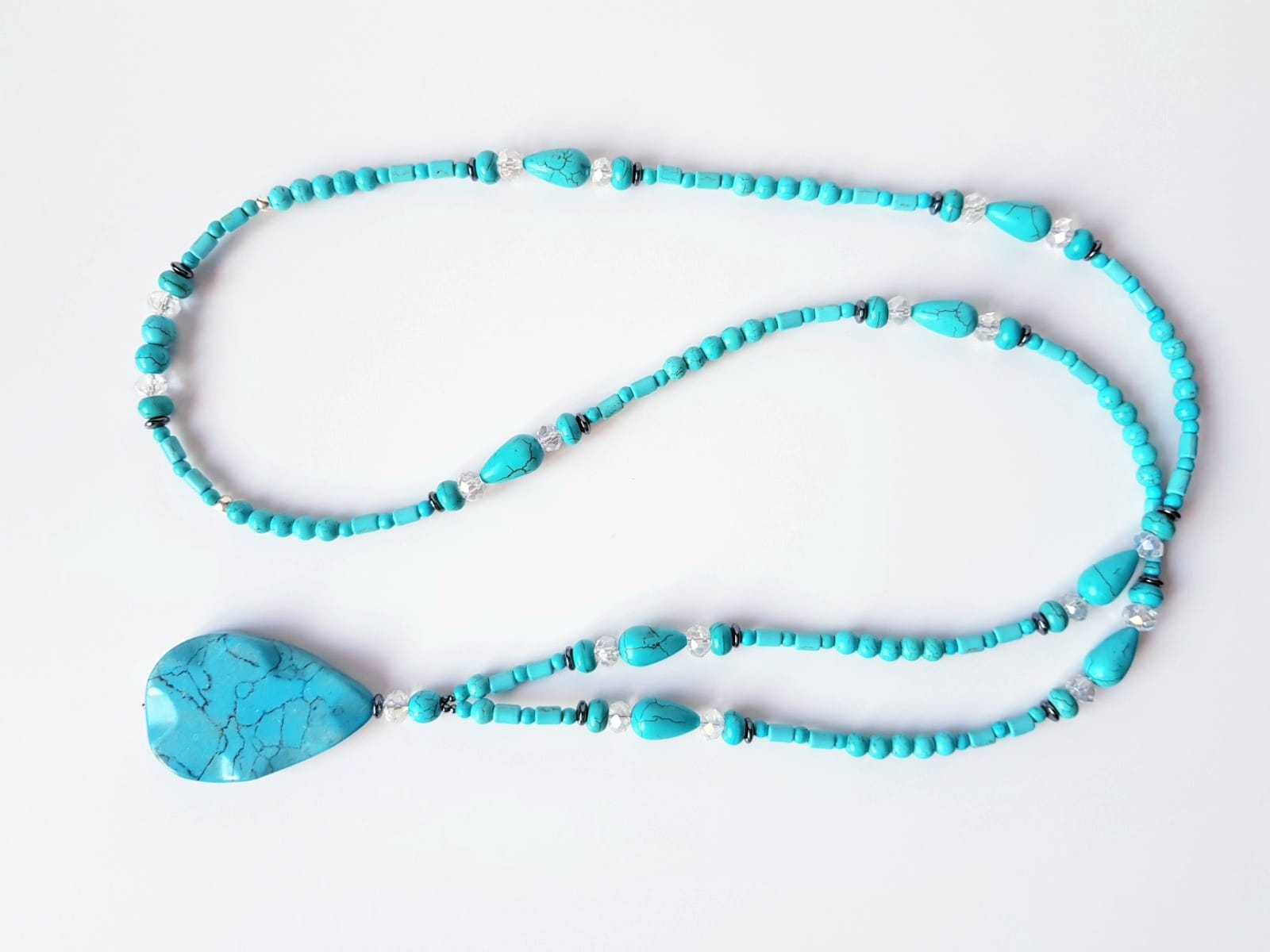 Colier lung de 104 cm, cu turcoaz reconstituit diverse forme intre 4 si 15 mm, hematit sfere si discuri intre 3 si 6 mm, cristale fatetate sfere de 8 mm si pandantiv din turcoaz picatura de 5,5x3,5 cm. Colierul nu are inchizatoare si se poarta intr-un singur sir, fiind usor de asortat atat la tinute casual, cat si elegante.