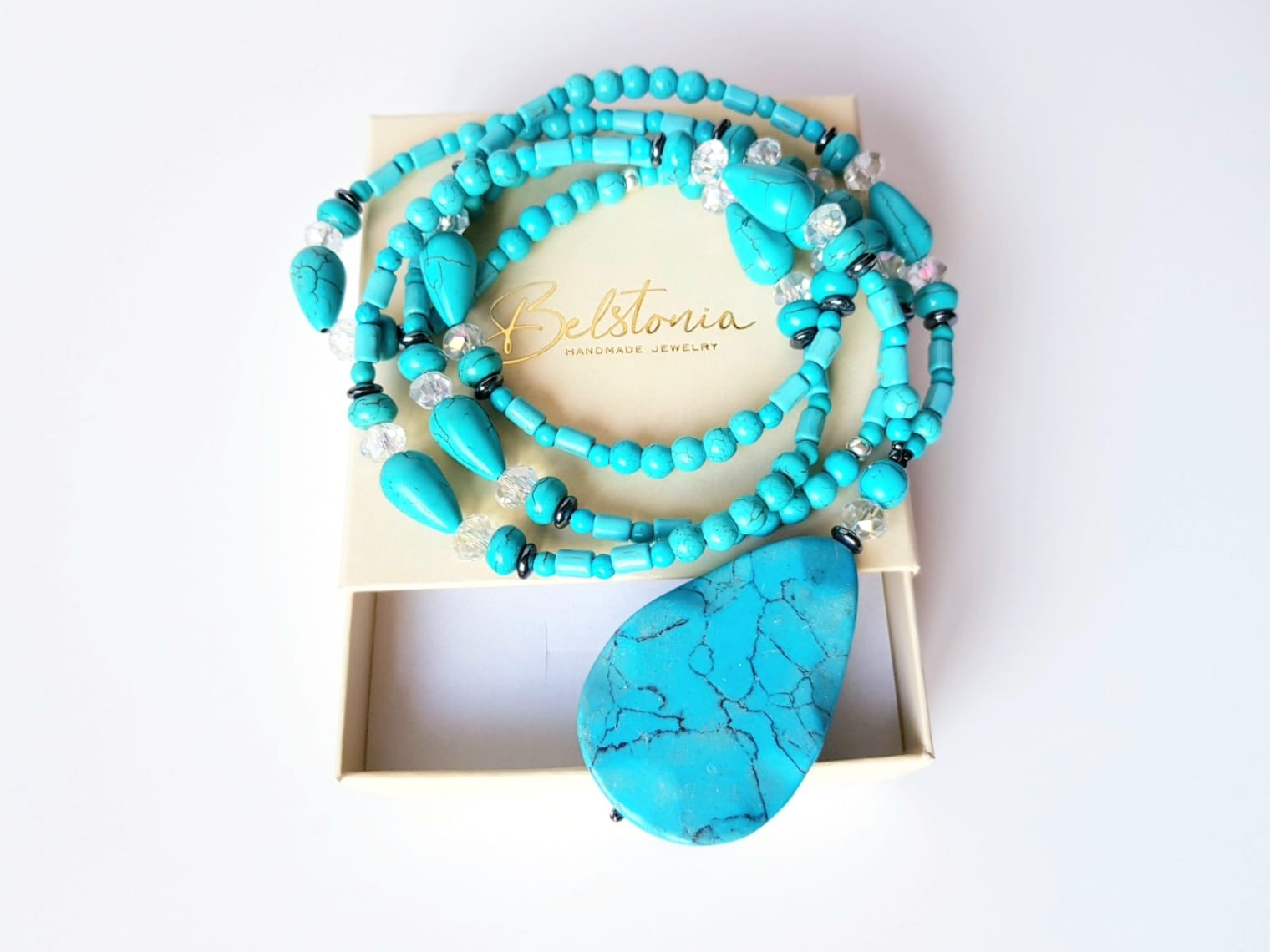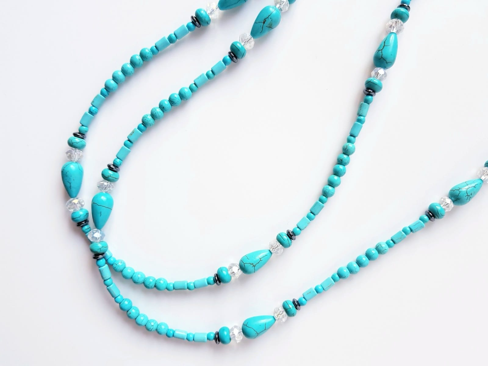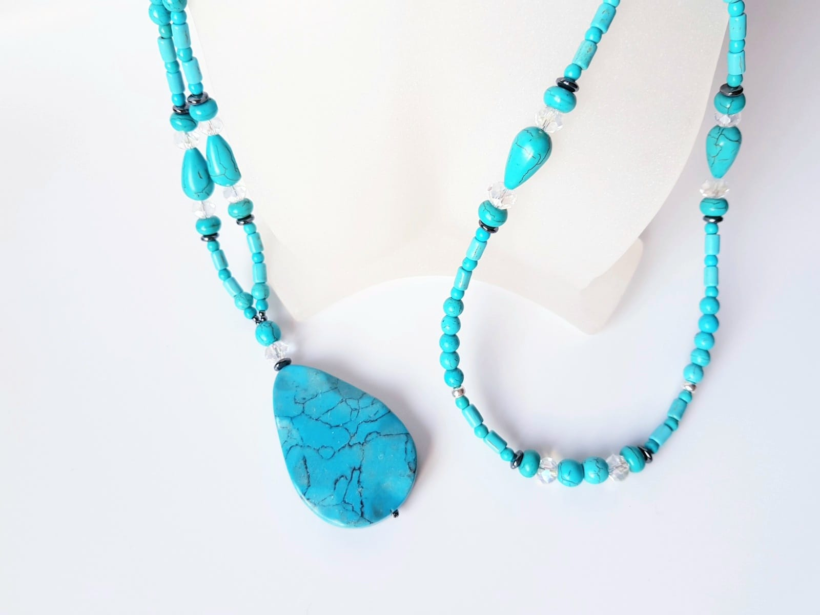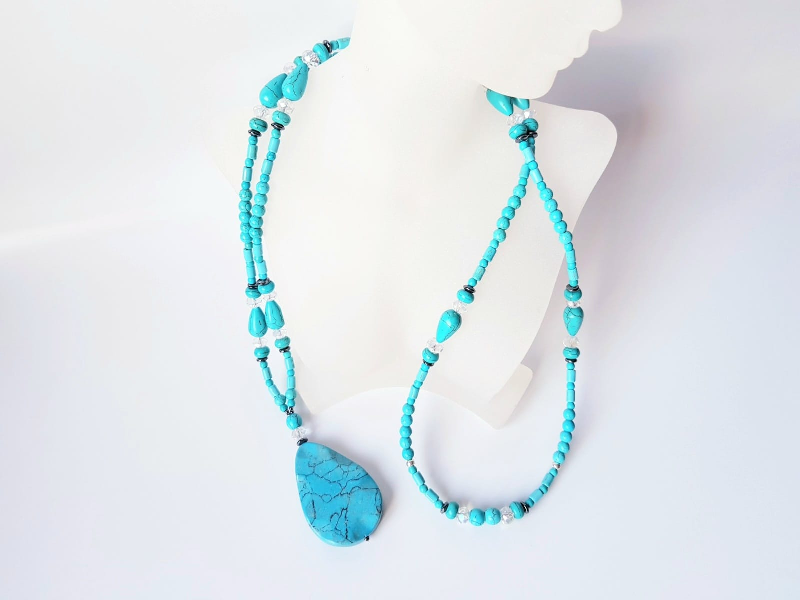 Colier lung de 104 cm, cu turcoaz reconstituit diverse forme intre 4 si 15 mm, hematit sfere si discuri intre 3 si 6 mm, cristale fatetate sfere de 8 mm si pandantiv din turcoaz picatura de 5,5x3,5 cm. Colierul nu are inchizatoare si se poarta intr-un singur sir, fiind usor de asortat atat la tinute casual, cat si elegante.