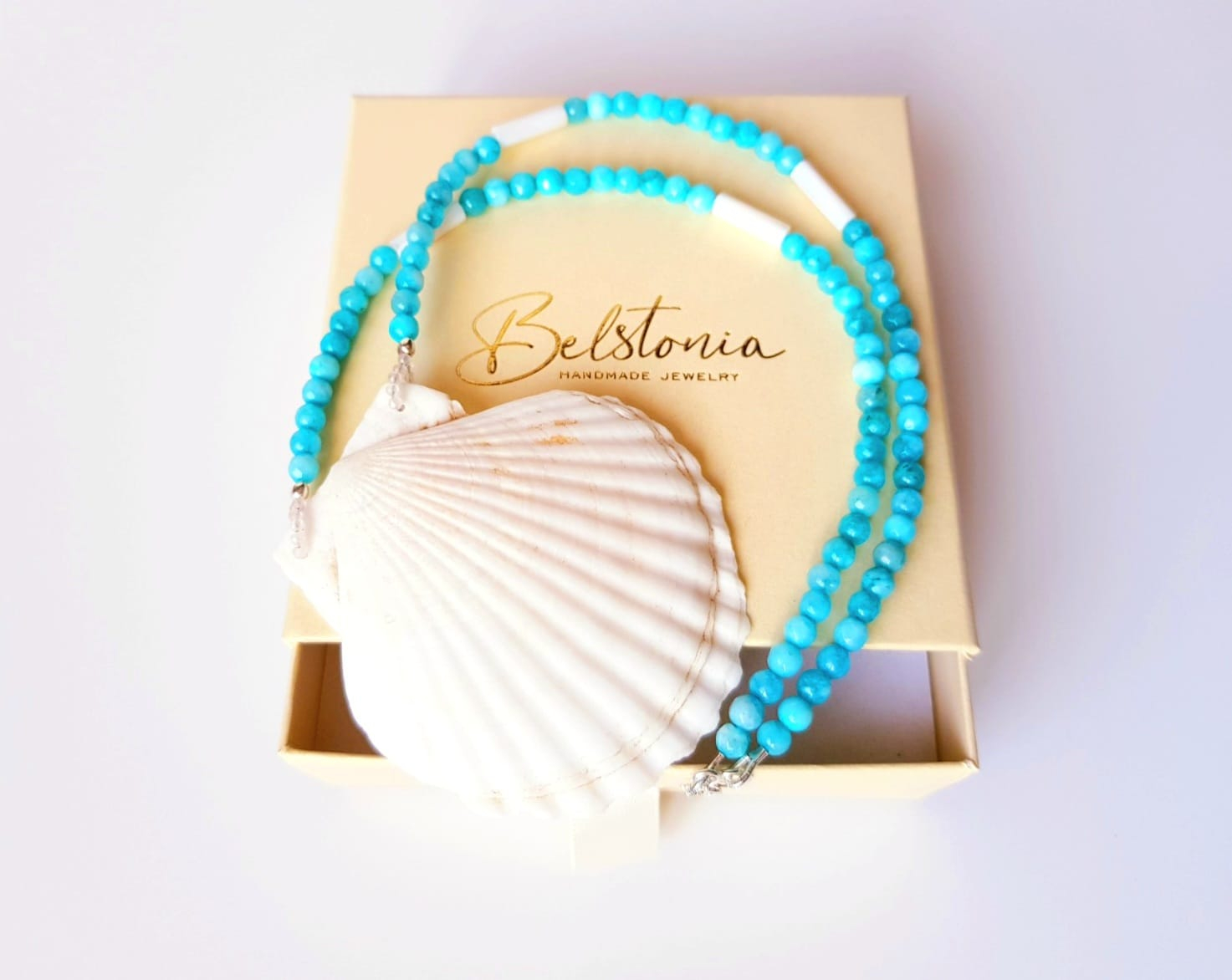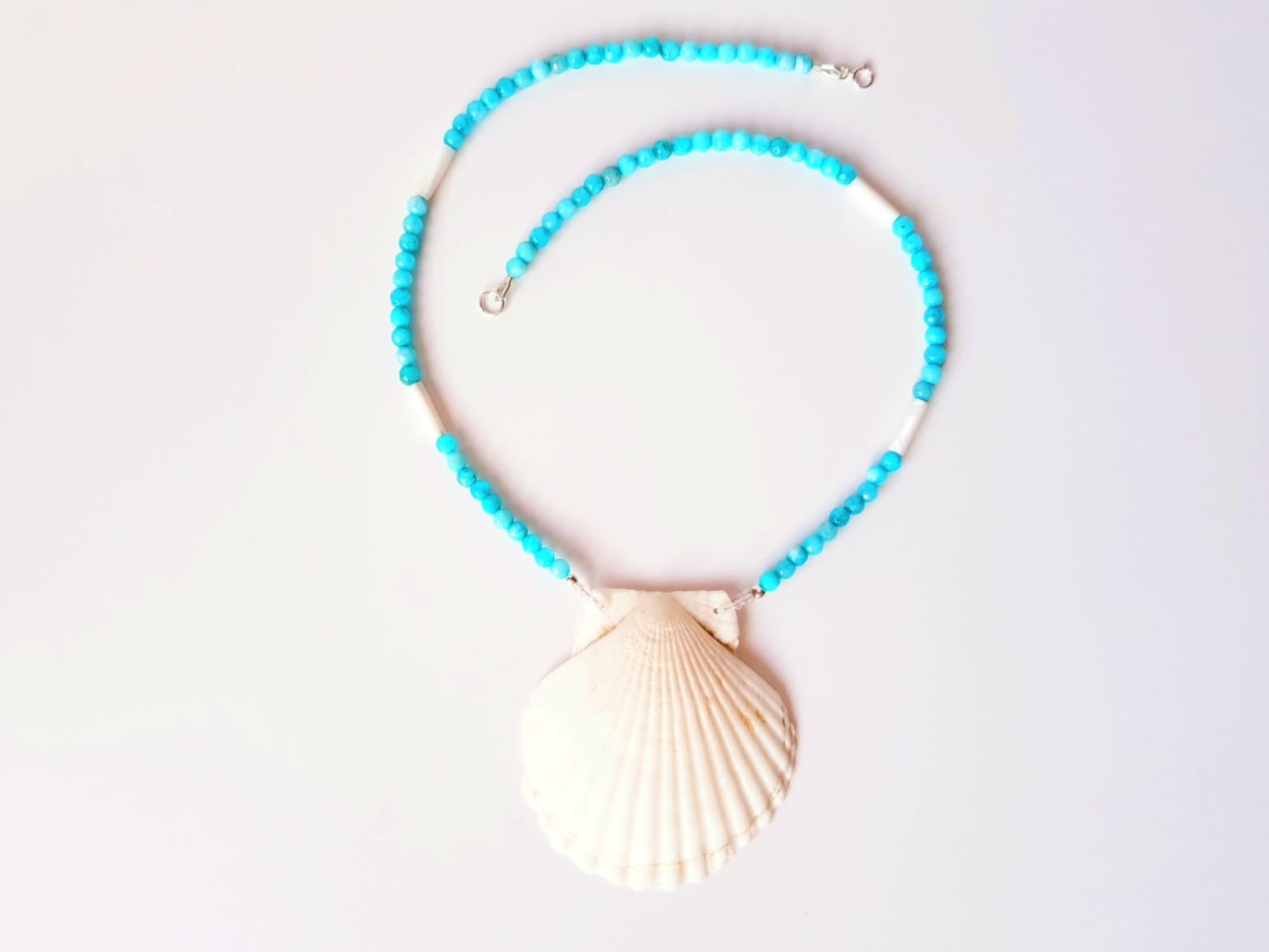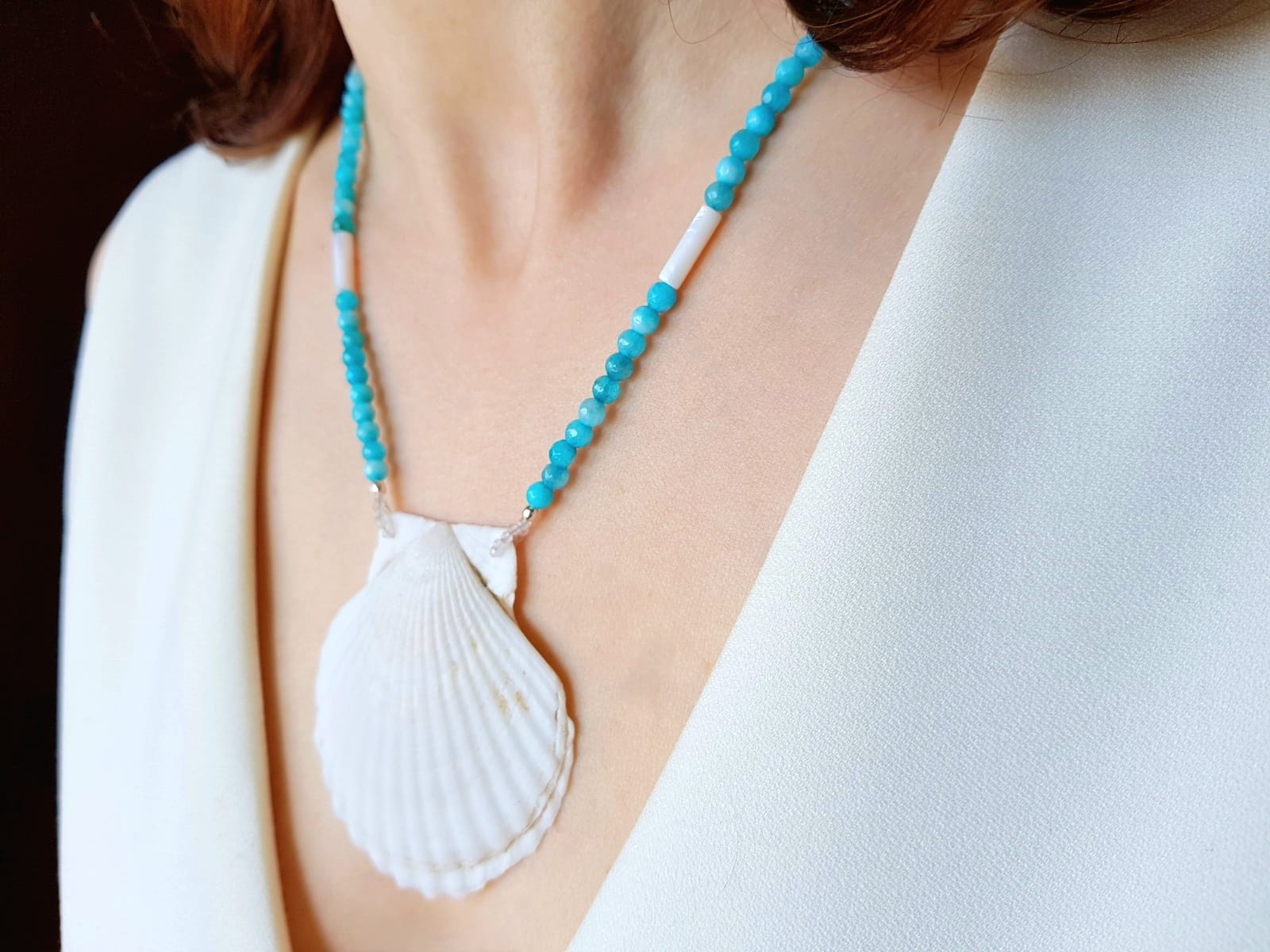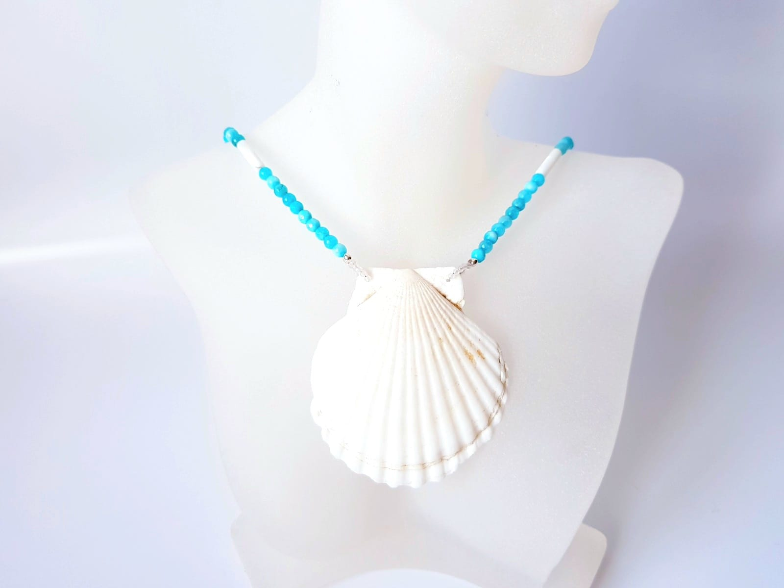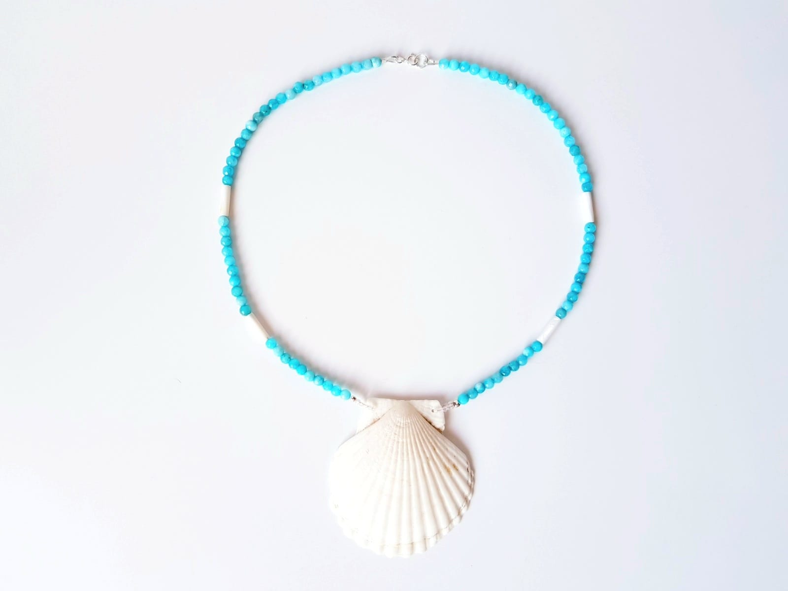 Piesa este alcatuita din sfere de jad bleu de 4,5 mm, completate de tuburi elegante de sidef de 13x4 mm care adauga textura si stralucire naturala. Elementul central al colierului este o scoica naturala de dimensiune impresionanta, 6 x 6,5 cm, care transforma bijuteria intr-o piesa statement cu aer estival.