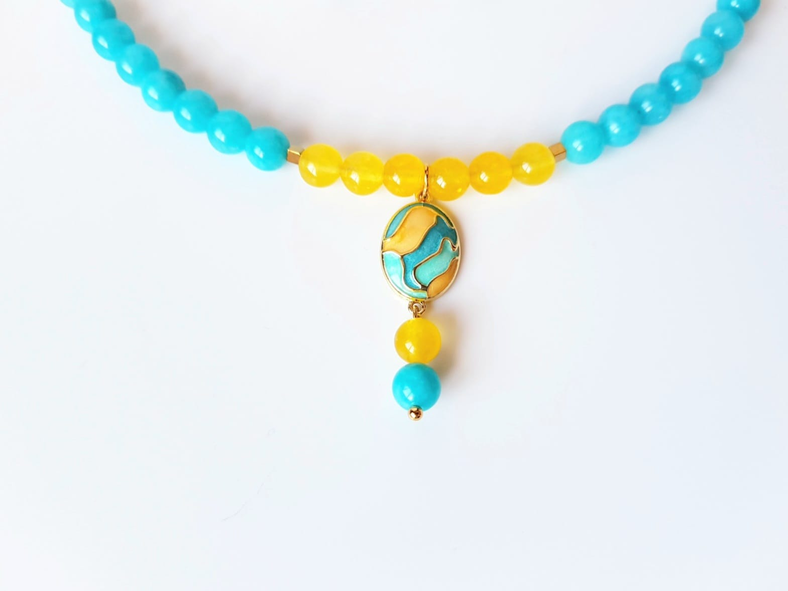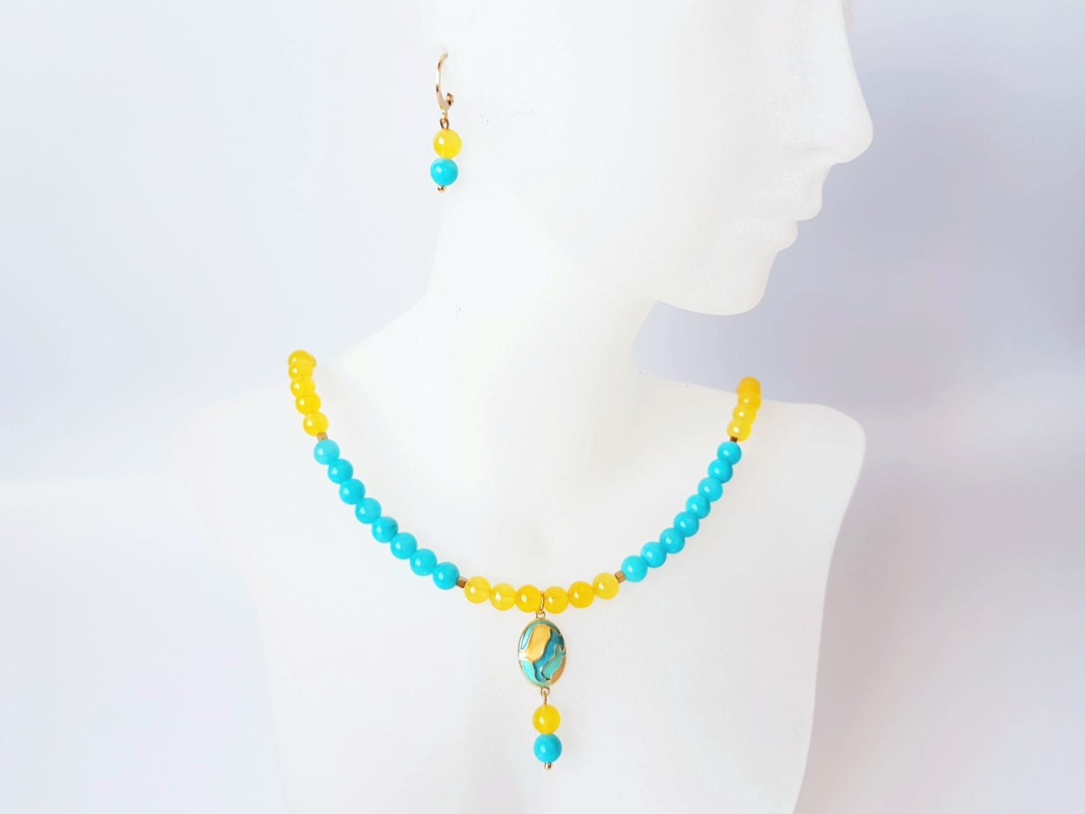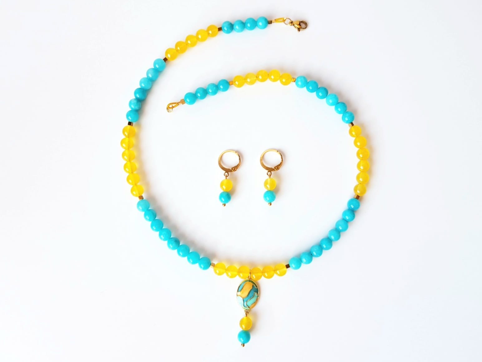 Set elegant, format din colier si cercei asortati. Colierul are lungimea de 45 cm si este realizat manual din jad turcoaz si agat galben sub forma de sfere de 6 mm, completat cu hematit cuburi de 2 mm. Piesa centrala este un pandantiv oval din cupru placat auriu, cu email in culori pastelate, dimensiuni 12x20 mm, care adauga un accent delicat si rafinat. Colierul este finisat cu accesorii din otel inoxidabil placat cu aur 18 k.