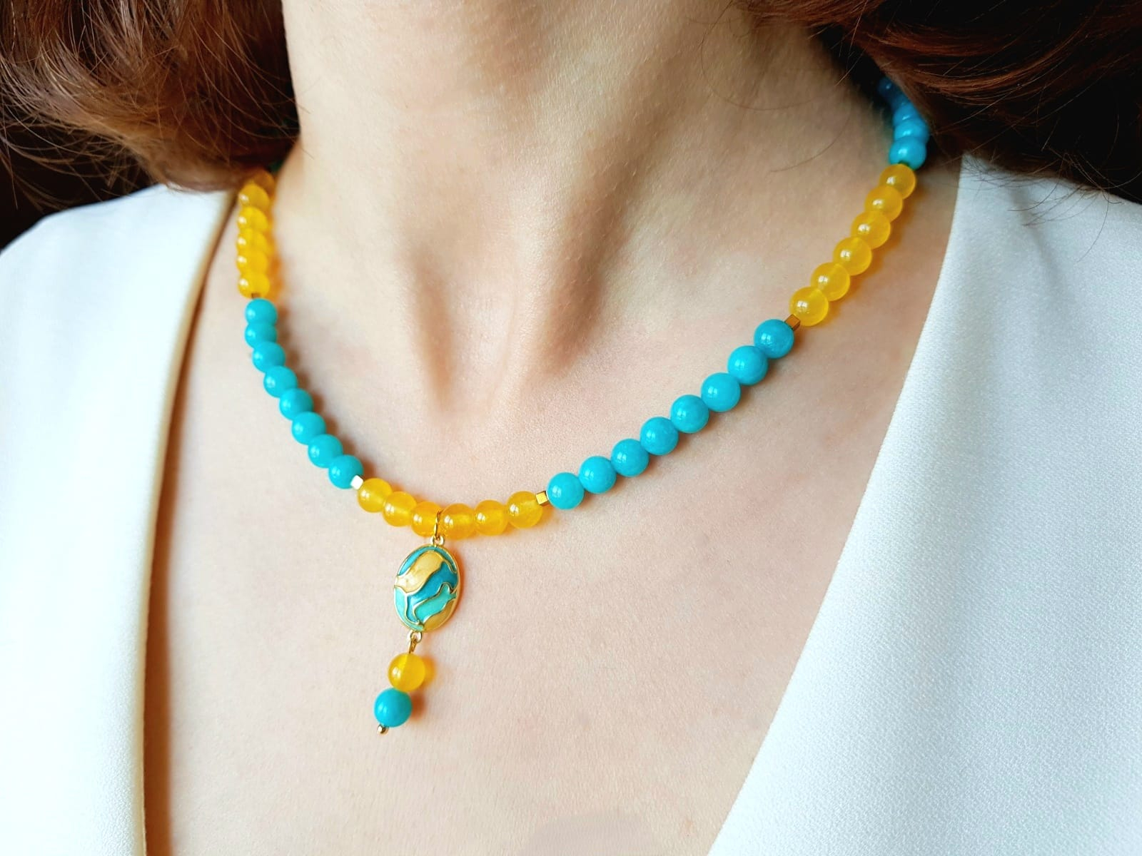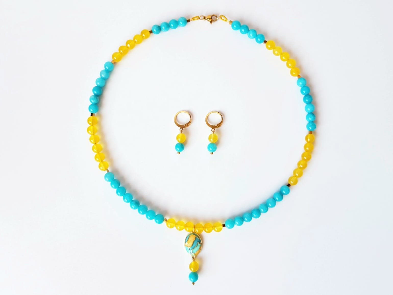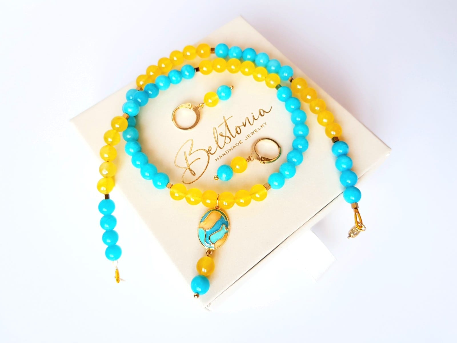 Set elegant, format din colier si cercei asortati. Colierul are lungimea de 45 cm si este realizat manual din jad turcoaz si agat galben sub forma de sfere de 6 mm, completat cu hematit cuburi de 2 mm. Piesa centrala este un pandantiv oval din cupru placat auriu, cu email in culori pastelate, dimensiuni 12x20 mm, care adauga un accent delicat si rafinat. Colierul este finisat cu accesorii din otel inoxidabil placat cu aur 18 k.