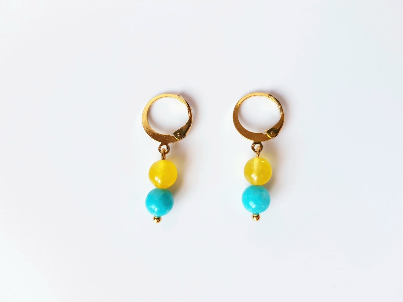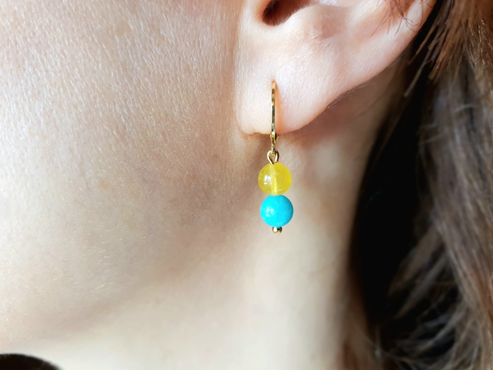 Cerceii asortati au lungimea de 3 cm si sunt realizati cu doua sfere – jad turcoaz si agat galben – pastrand armonia si eleganta setului.