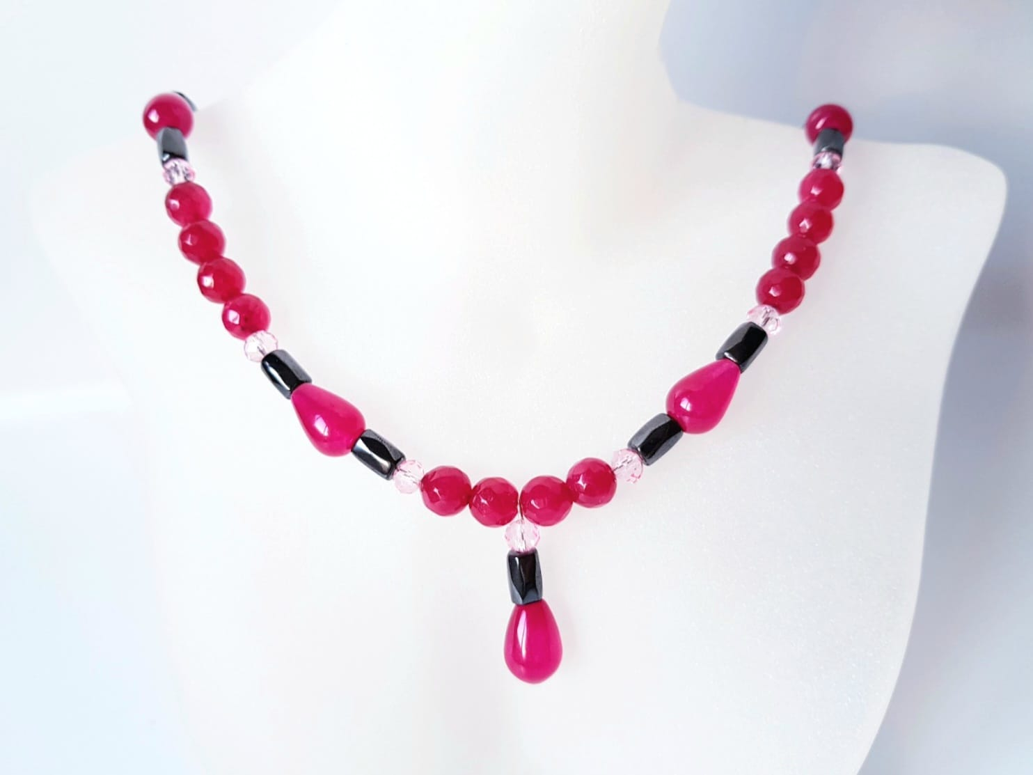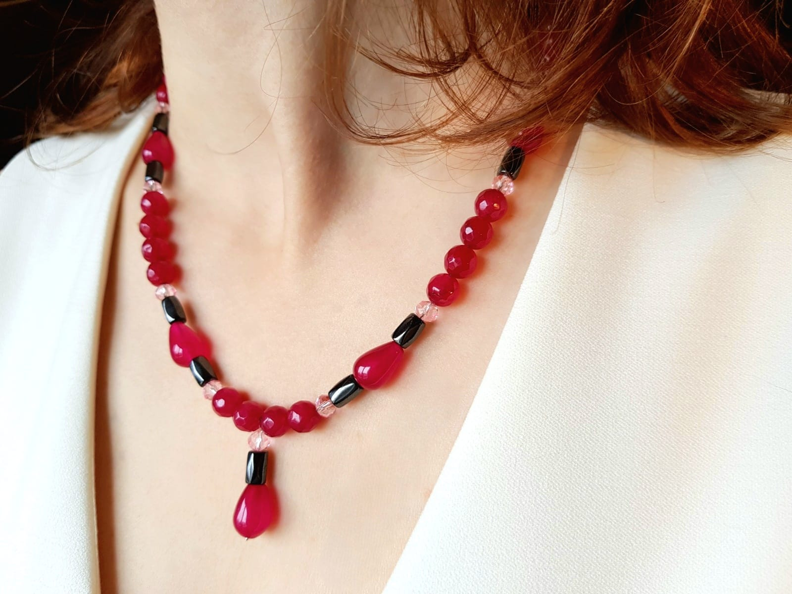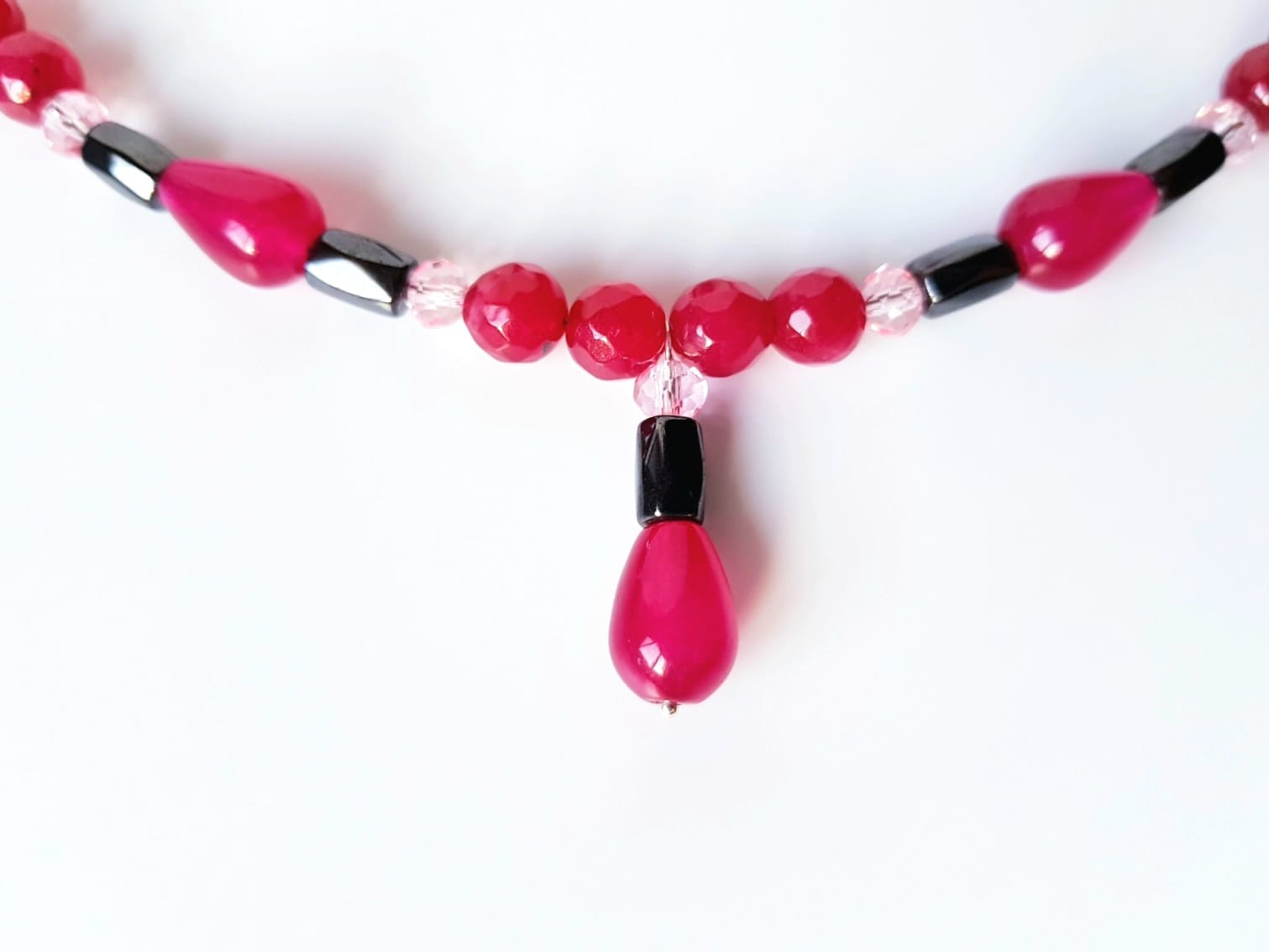 Colier de 48 cm lungime si partea de pandantiv de 2,7 cm, cu jad visiniu picaturi de 9x13 mm, agat visiniu sfere de 8 mm, hematit tuburi fatetate de 5x8 mm si cristale fatetate roz de 6 mm, finisat cu accesorii din argint 925.