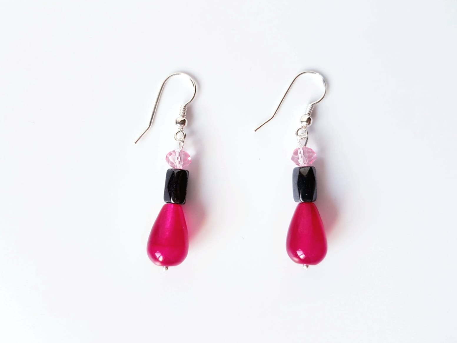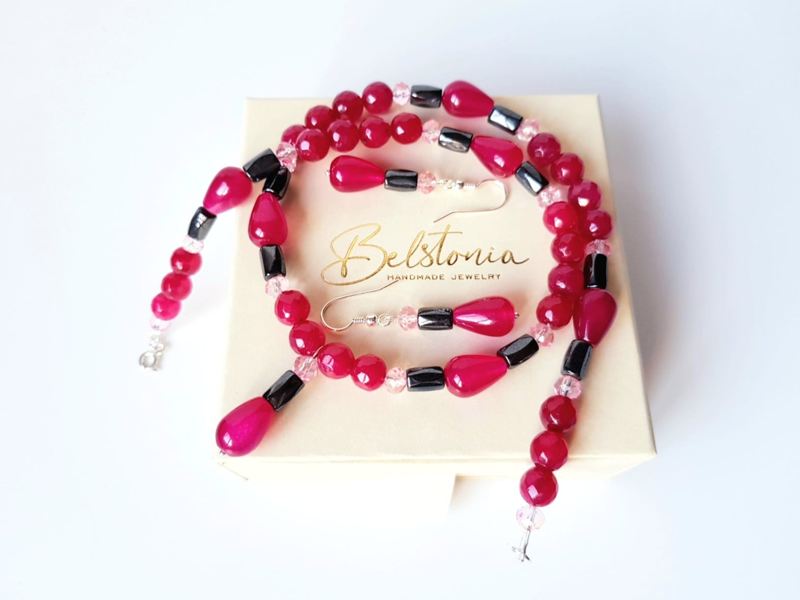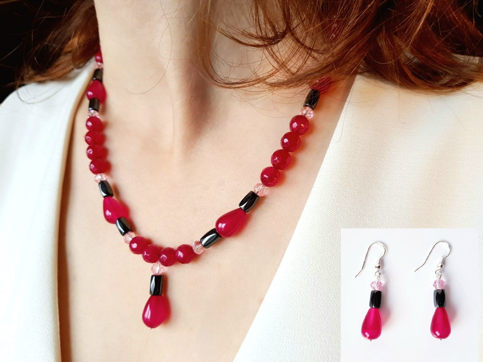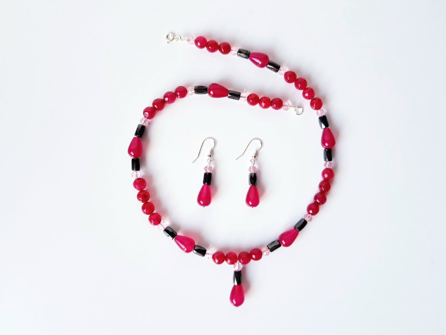 Colier de 48 cm lungime si partea de pandantiv de 2,7 cm, cu jad visiniu picaturi de 9x13 mm, agat visiniu sfere de 8 mm, hematit tuburi fatetate de 5x8 mm si cristale fatetate roz de 6 mm, finisat cu accesorii din argint 925.