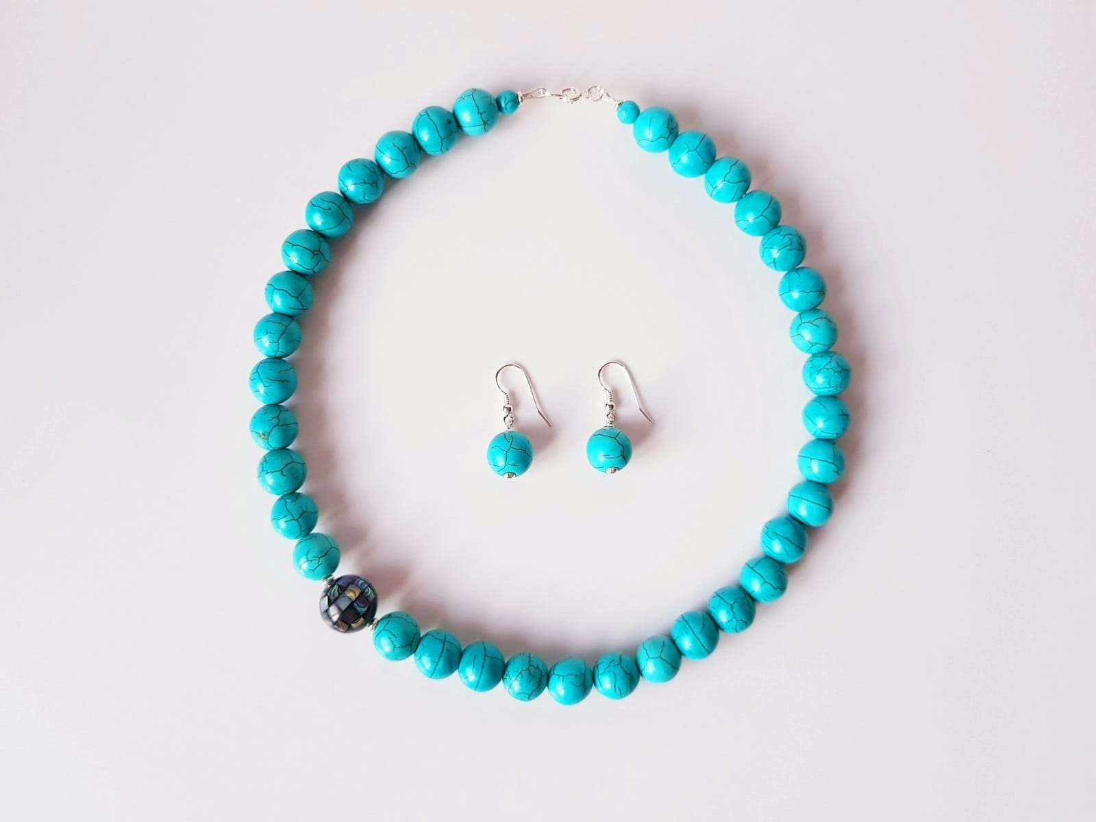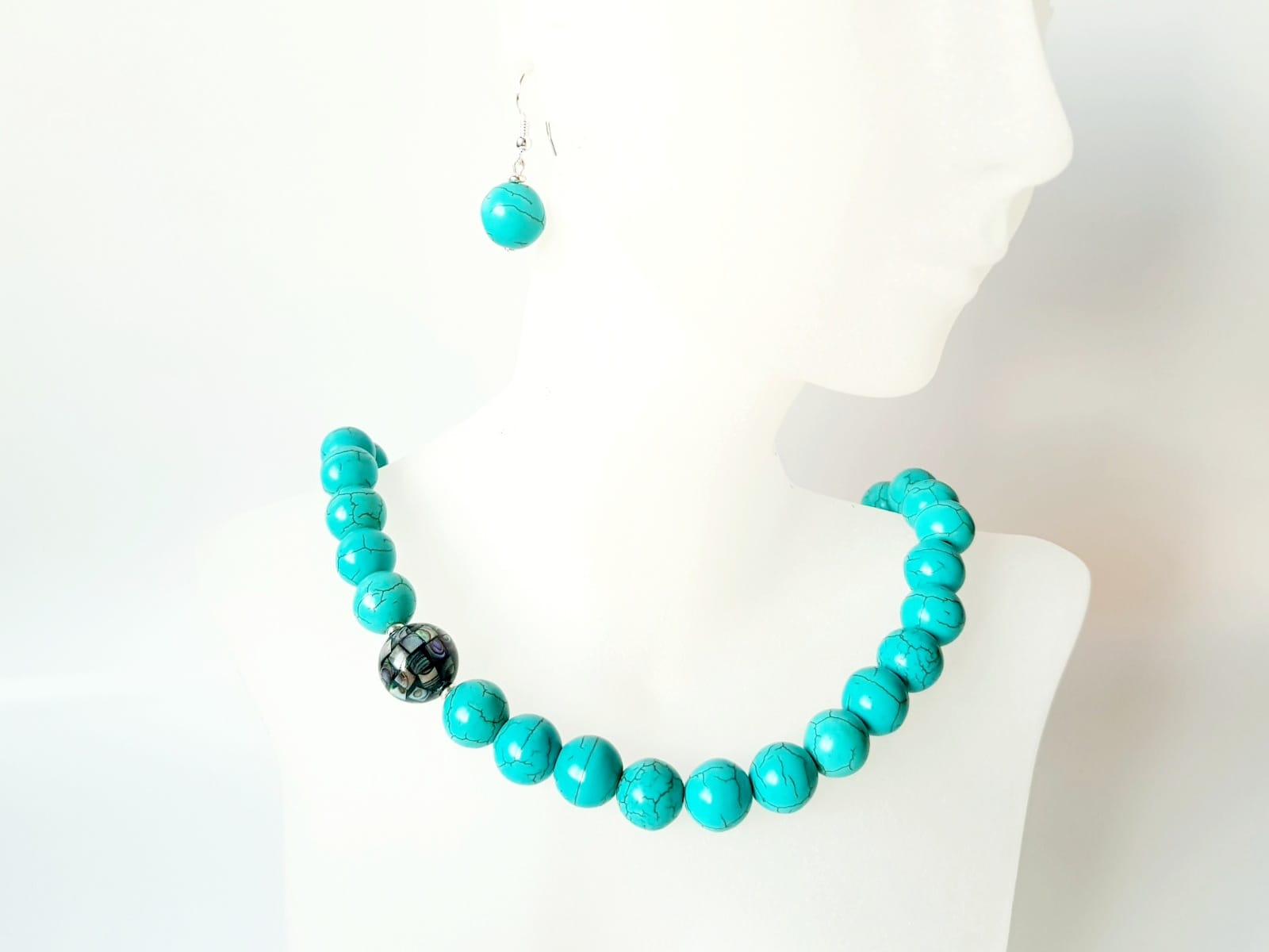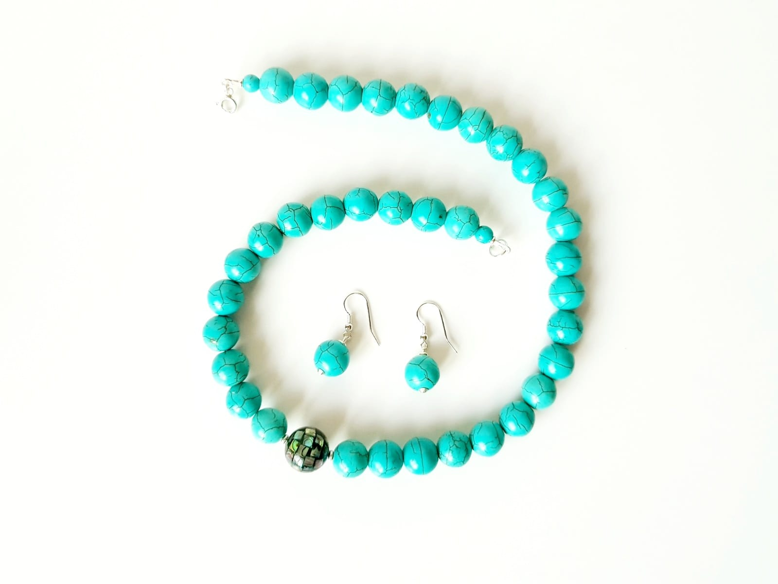 Colierul de 46 cm combina frumusetea turcoazului reconstituit in sfere de 12 mm cu o sfera fatetata din scoica abalone, plasata elegant usor lateral, pentru un efect subtil si modern. Cerceii din argint 925 completeaza setul, avand o sfera de turcoaz de 12 mm fiecare si o lungime de 3,3 cm, perfecti pentru a adauga un accent fin si elegant.