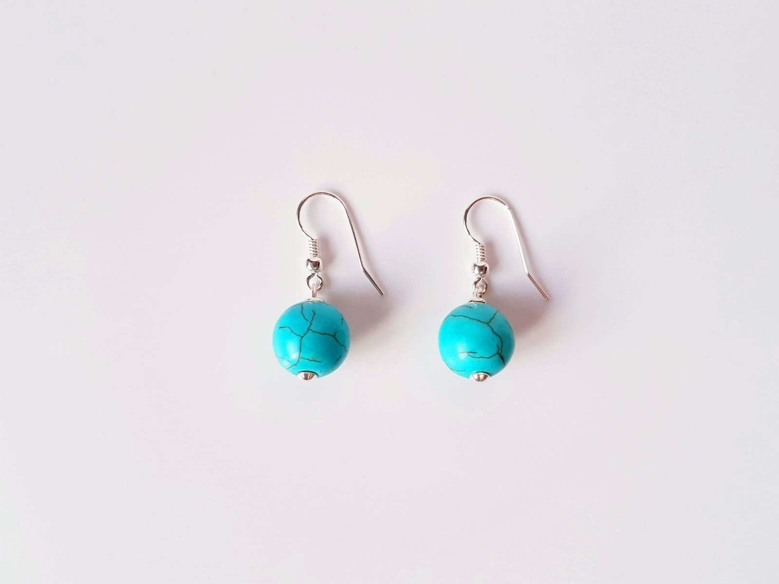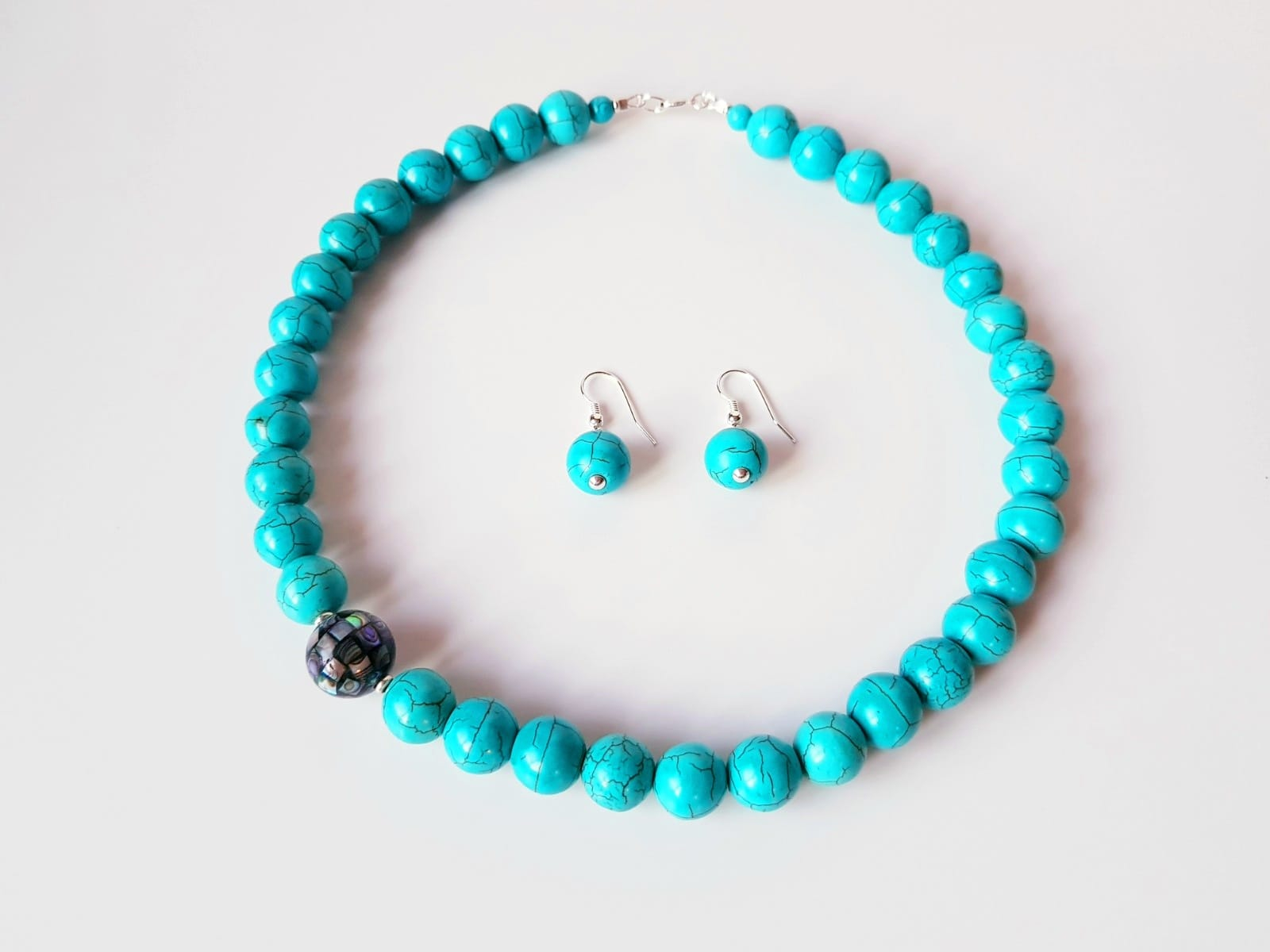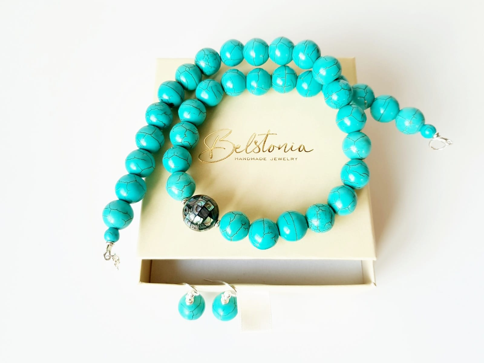 Colierul de 46 cm combina frumusetea turcoazului reconstituit in sfere de 12 mm cu o sfera fatetata din scoica abalone, plasata elegant usor lateral, pentru un efect subtil si modern. Cerceii din argint 925 completeaza setul, avand o sfera de turcoaz de 12 mm fiecare si o lungime de 3,3 cm, perfecti pentru a adauga un accent fin si elegant.