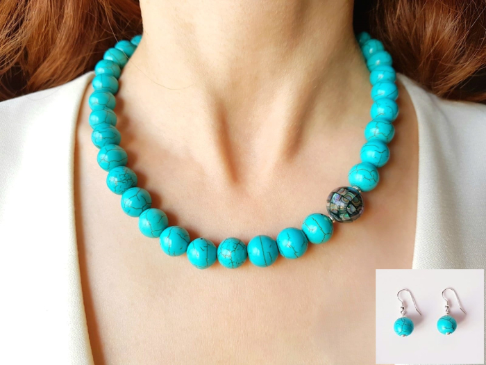 Colierul de 46 cm combina frumusetea turcoazului reconstituit in sfere de 12 mm cu o sfera fatetata din scoica abalone, plasata elegant usor lateral, pentru un efect subtil si modern. Cerceii din argint 925 completeaza setul, avand o sfera de turcoaz de 12 mm fiecare si o lungime de 3,3 cm, perfecti pentru a adauga un accent fin si elegant.